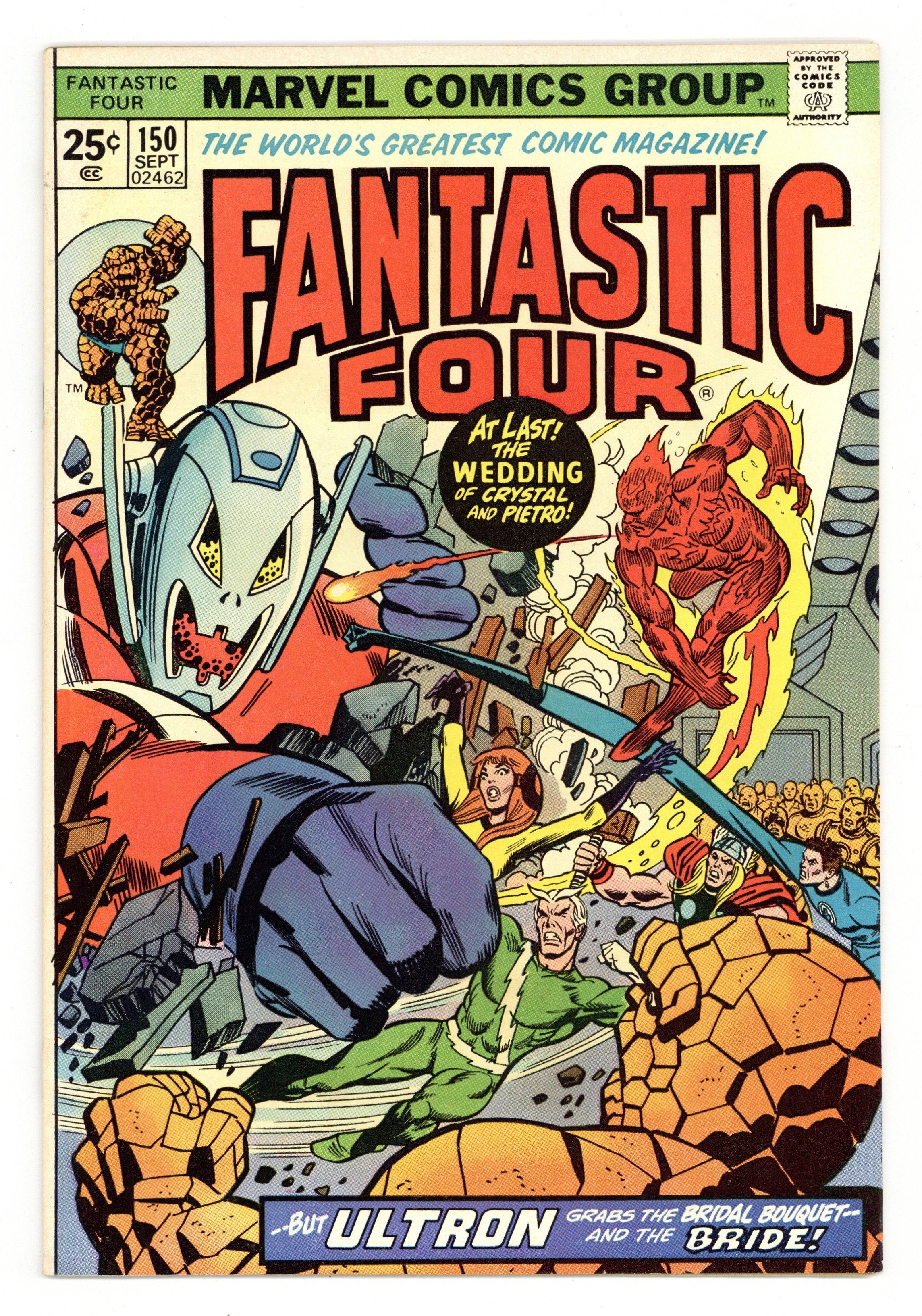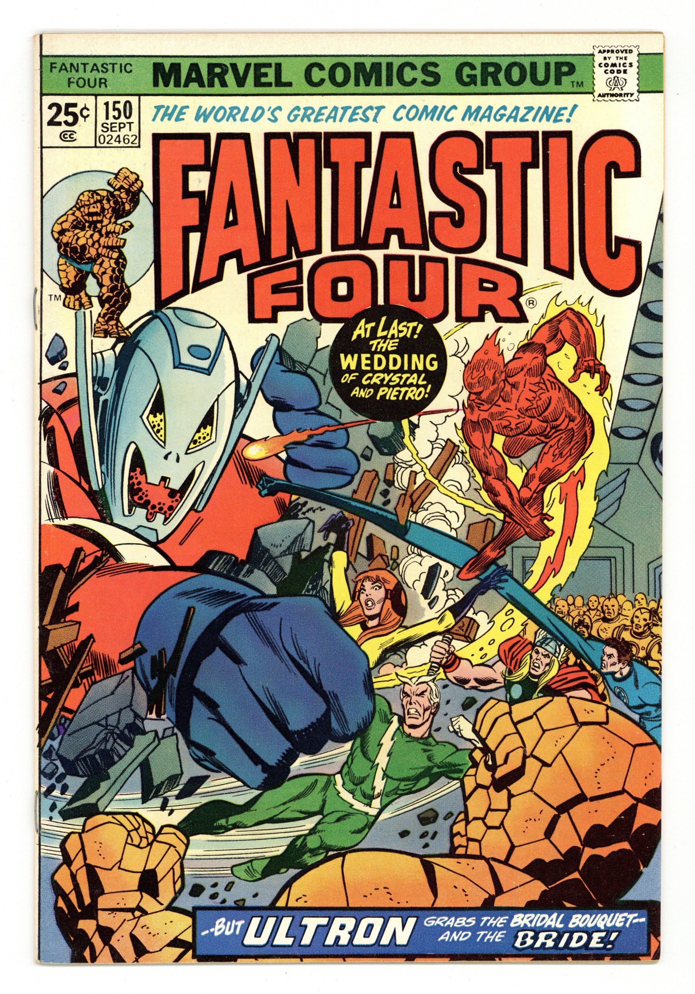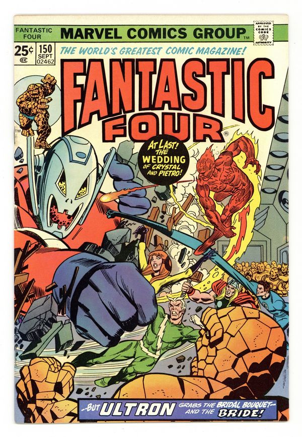 Tags: Fantastic Four$38.00"Ultron-7: He'll Rule the World!" Part 2 of 2. Written by Gerry Conway. Pencils by Rich Buckler. Inks by Joe Sinnott. Cover by Gil Kane and Frank Giacoia. Guest-starring the Avengers and the Inhumans. Story continues from Avengers 127 (Part 1). It was supposed to be a glorious day in the Great Refuge for Crystal and Quicksilver's wedding, but an uninvited guest, a certain adamantium guest, has crashed the party! The Avengers' long-time foe, Ultron, possesses the body of Omega and captures the bride! Next the evil robot attacks the Fantastic Four, the Inhumans, and Earth's Mightiest Heroes! It's an all-star showdown as 16 super-heroes challenge the might of Ultron-7! Can anyone... man, woman, or child...save the day? Wedding of Crystal and Quicksilver. Cameo appearances by Maximus and the golden age Whizzer (aka Robert Frank). Avengers lineup: Iron Man, Mantis, Thor, Scarlet Witch, Swordsman, and the Vision. (Notes: Ultron returns in Avengers 161. Quicksilver's costume on the cover should be light blue instead of green. The letters page contains Marvel Value Stamp series A #27 the Black Widow by John Romita.) 36 pgs. Cover price $0.25.
