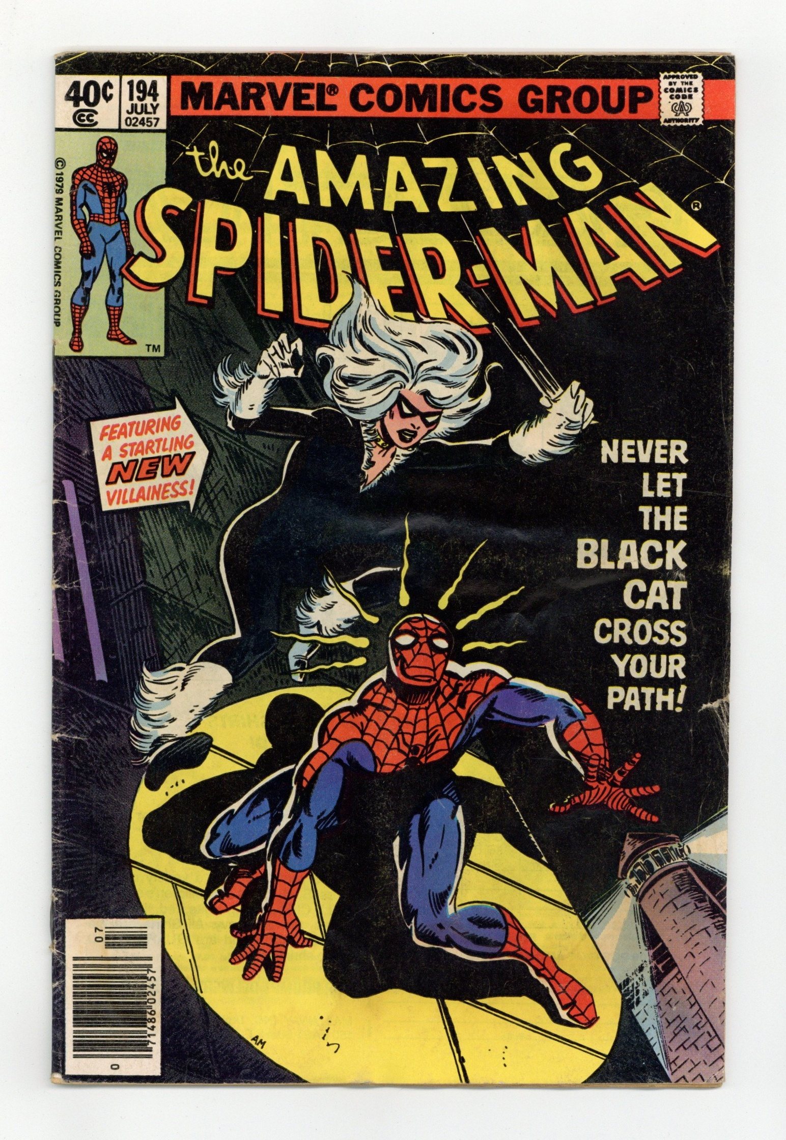 Newsstand Edition. First appearance of the Black Cat in "Never Let The Black Cat Cross Your Path!" Part 1 of 2. Script by Marv Wolfman. Art by Keith Pollard (breakdowns) and Frank Giacoia (finishes). Cover by Al Milgrom. One of the landmark issues of the Amazing Spider-Man series! The dazzling debut of the Black Cat! The wall-crawler has spent the first 193 issues of his title chasing super-villains! But tonight he's going to kiss one instead! Wow! Does the web-slinger stand a chance against the beauty and charm of Felicia Hardy? Not when the alluring cat has his tongue! And maybe later his heart! A terrific issue! Cameo appearances by Aunt May, Betty Brant, Ned Leeds, Harry Osborn, Flash Thompson, Mysterio (in civilian clothes), and the burglar. (Notes: The Black Cat is the creative highlight of the Wolfman-Pollard run on the Amazing Spider-Man title. Dave Cockrum designed the cat's costume. The letters page includes an alternate cover (for issue 194) by Keith Pollard. It also includes an alternate cover to Spider-Woman 9 by Carmine Infantino. This two-part story was reprinted in the trade paperback: Spider-Man vs. the Black Cat (2005). 36 pages, full color. Cover price $0.40.