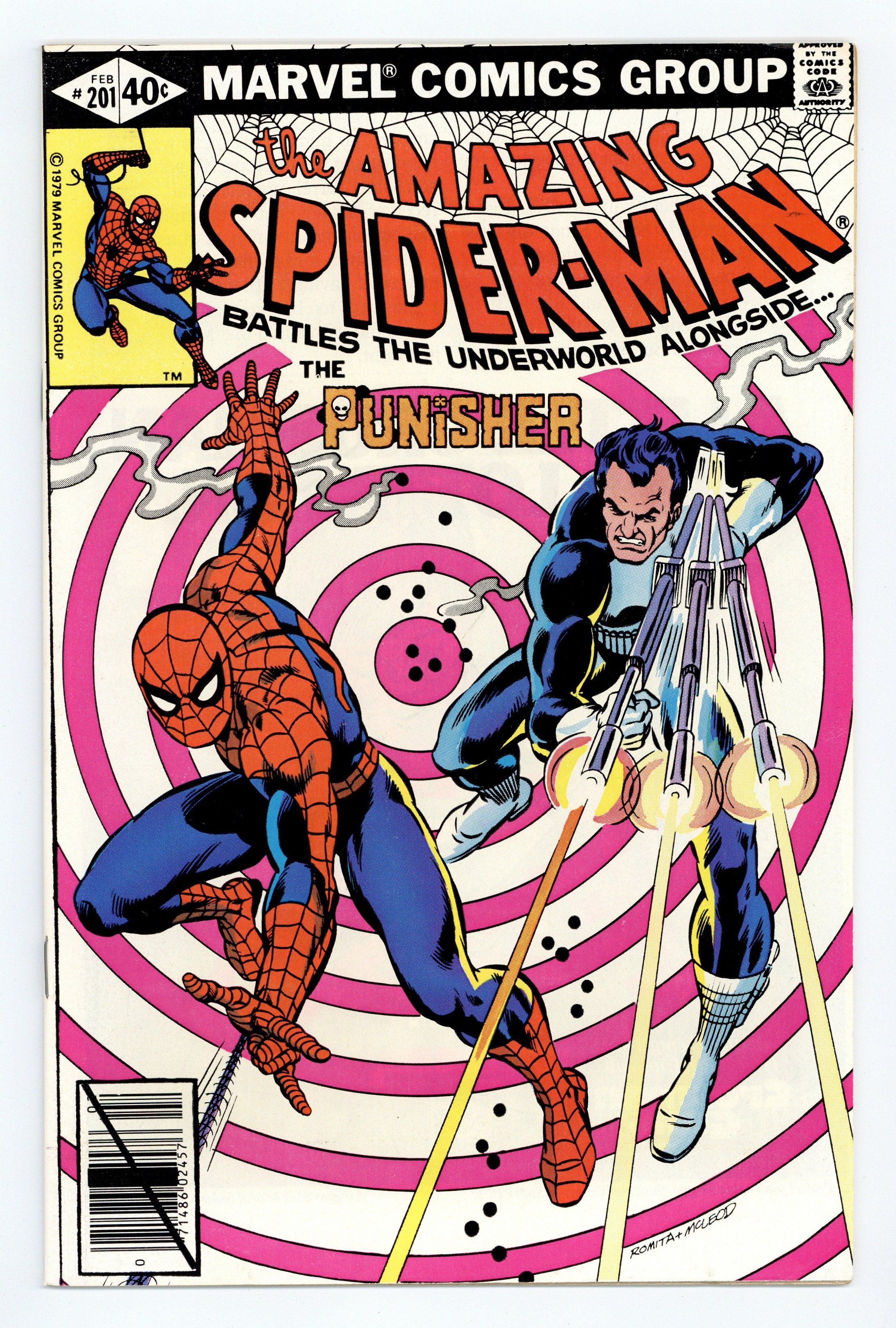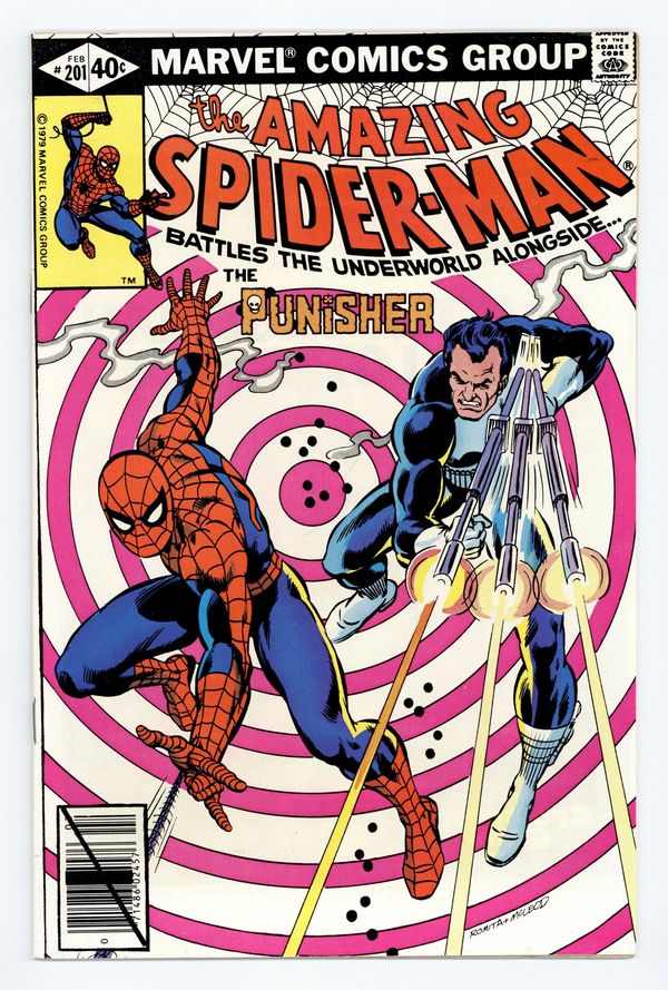 Tags: Marvel Legacy Numbering: Amazing Spider-Man (part 201), Spider-Man$43.50Direct Edition. "Man-Hunt!" Part 1 of 2. Guest-starring the Punisher. Script by Marv Wolfman. Art by Keith Pollard (layouts) and Jim Mooney (finishes). Cover by John Romita and Bob McLeod. The action starts with a bang as the web-slinger catches a man falling out of a high-rise office building! When Spider-Man swings inside to investigate, he discovers the source of the problem: the Punisher! What has Frank Castle been up to since Spidey last saw him (in Amazing Spider-Man 175)? Oh, just business as usual...terrorizing the underworld! The following day to his surprise, the Punisher sees pictures of his penthouse gun battle in the Daily Globe! Credited to a photographer named Peter Parker! This troubles the Punisher! And that means trouble for Aunt May's nephew! War Journal Entry #519 is coming up next at a particular superhero's Chelsea apartment! Appearances by J. Jonah Jameson, Joe Robertson, Dr. Marla Madison, Aunt May, and Mary Jane Watson. (Notes: The Punisher previously appeared in Captain America 241. Mary Jane appears next in the classic Marvel Team-Up 79 where (as Red Sonja) she battles Kulan Gath alongside the web-slinger. This is one of Mary Jane's very few appearances between 1979 and 1983. She returns to the Amazing Spider-Man title in issue 238. This story was reprinted in Marvel Tales 218.) 36 pgs. Cover price $0.40.