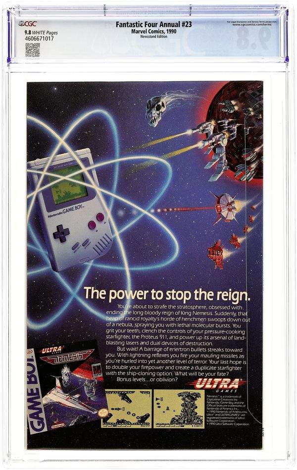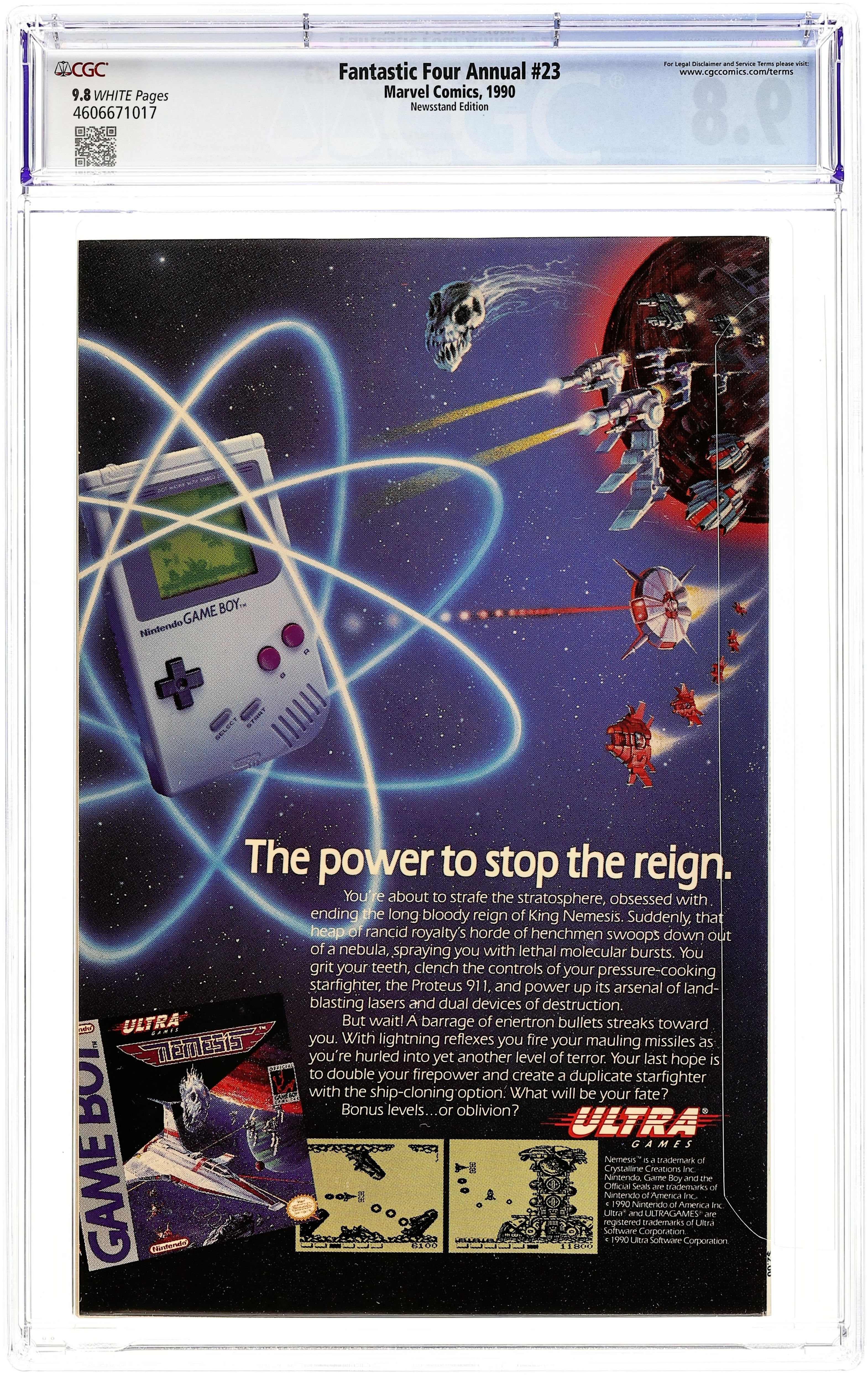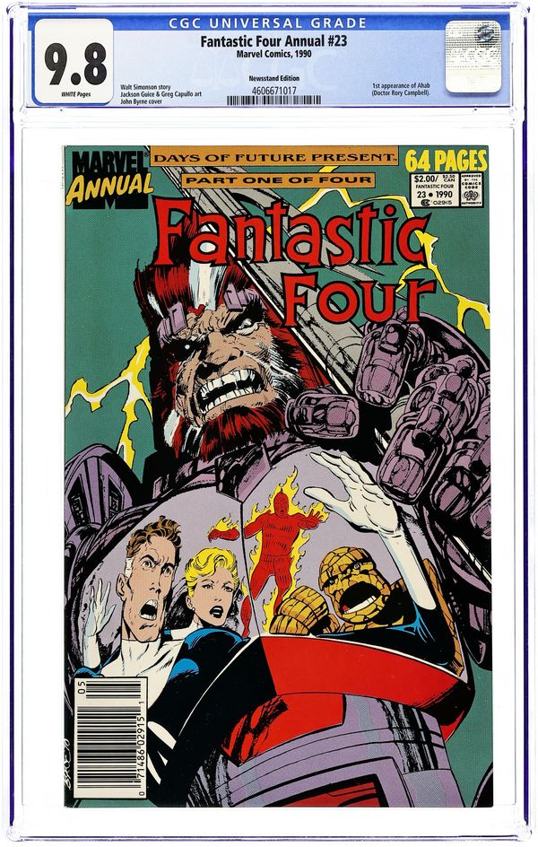 Newsstand Edition. Days of Future Present part 1, "When Franklin Comes Marchin' Home." Script by Walt Simonson, pencils by Jackson Guice, inks by Geof Isherwood. Moonstone stars in "Cast in Fire, Carved in Stone." Script and pencils by James Brock Jr., inks by Mark McKenna. Doctor Doom appearance. Kosmos stars in "Beyond and Back." Script by Len Kaminski, pencils by Greg Capullo, inks by Larry Mahlstedt. Cameos by Galactus, the High Evolutionary, Thanos, and Eternity. John Byrne cover. 68 pgs. Cover price $2.00.