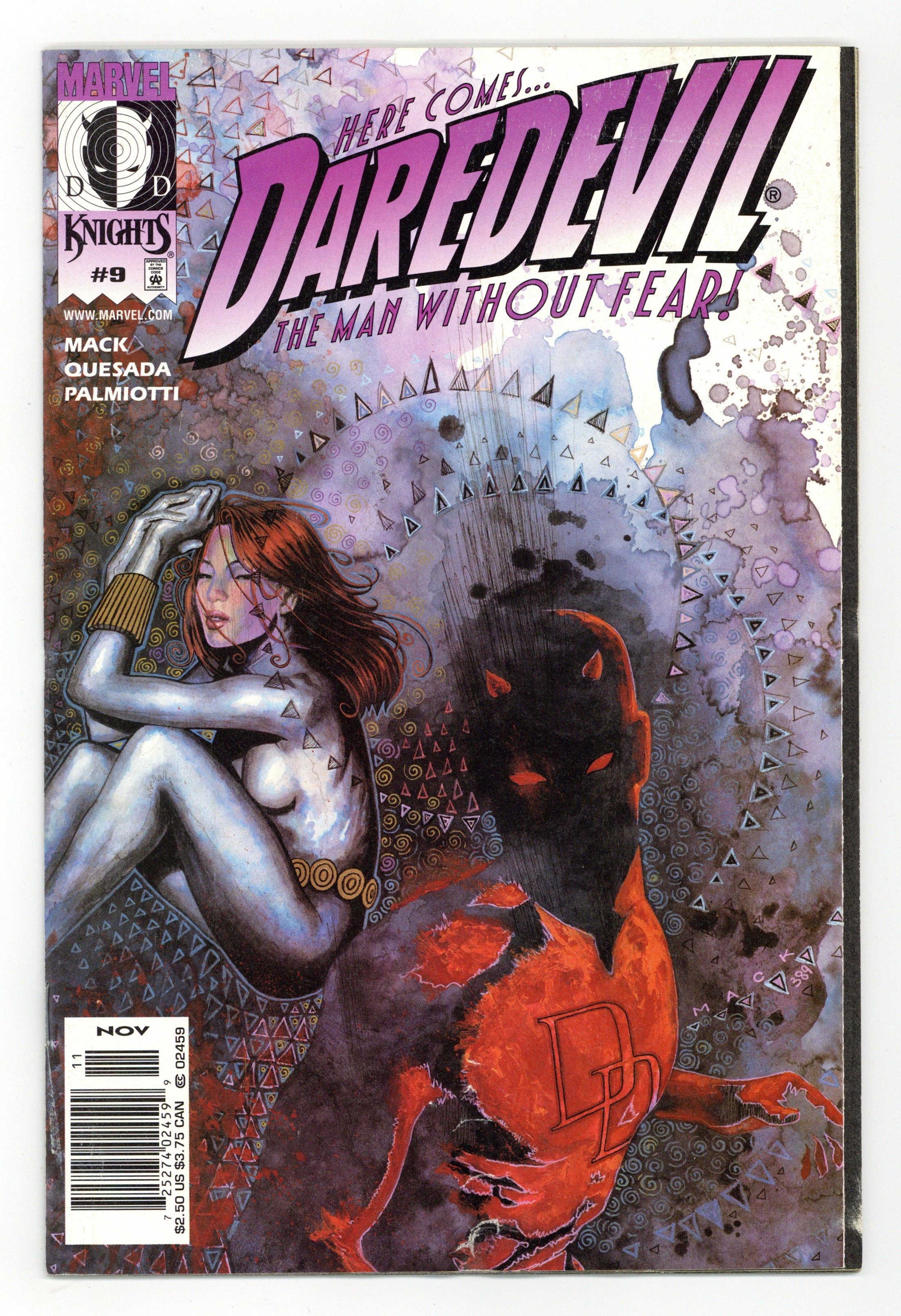 Newsstand Edition. Painted cover by David Mack. Joe Quesada and Jimmy Palmiotti welcome aboard new writer David Mack! As Matt Murdock attempts to rebuild his life from the ashes of the "Guardian Devil" story arc, old friends and new foes arrive! And when a mysterious man contacts Matt and claims to know the secret of Wilson Fisk's criminal empire, a new twist is added to the battle between Daredevil and his nemesis, the Kingpin!" Cover price $2.50.