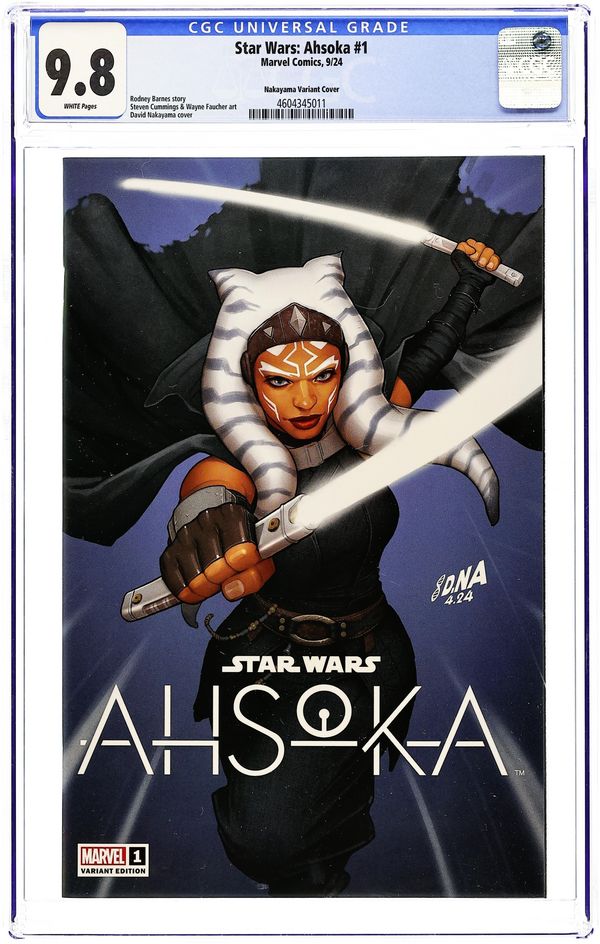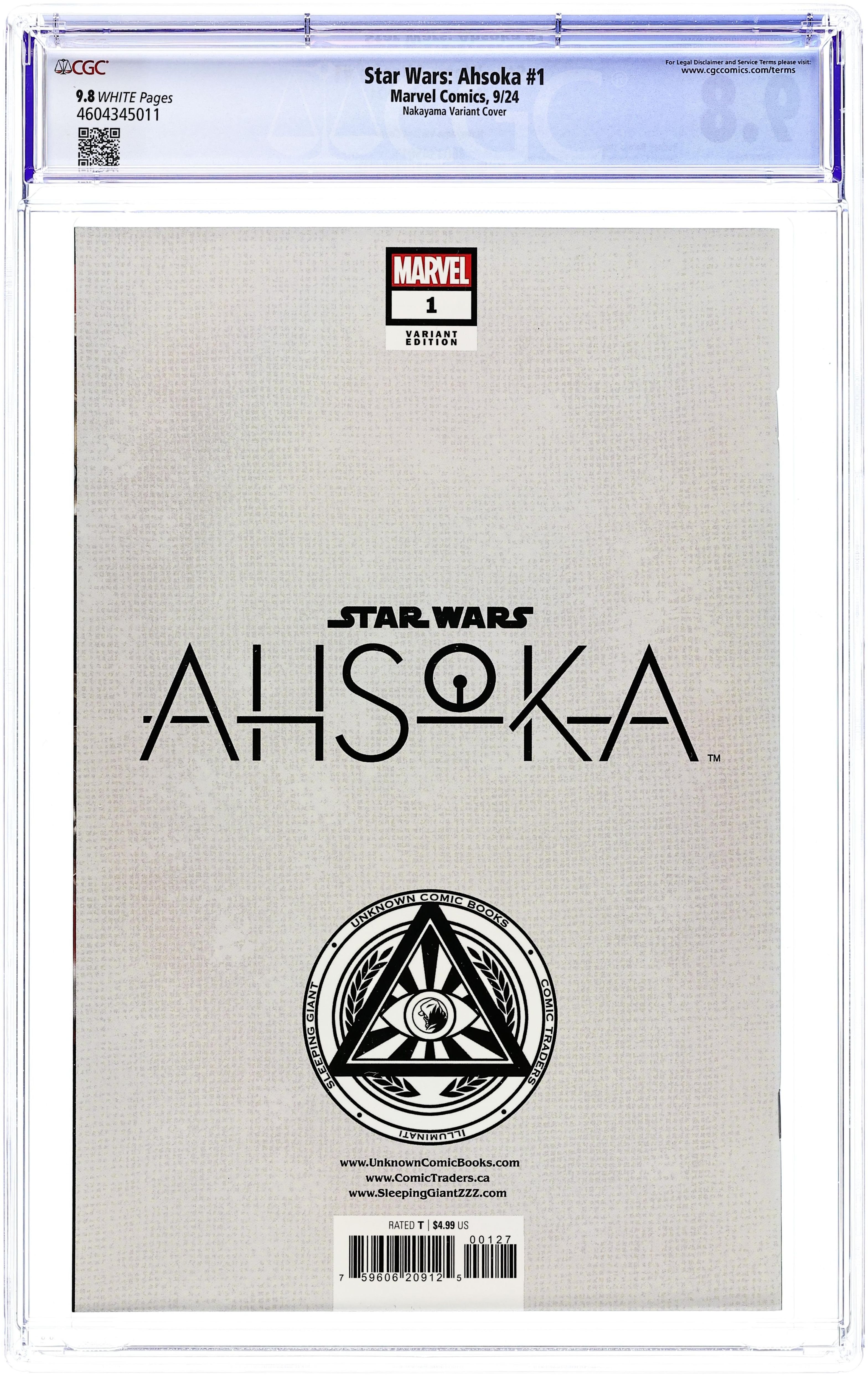 Comics Illuminati(Unknown Comic Books, Comic Traders, and Sleeping Giant) Exclusive Variant Cover by David Nakayama. Written by Rodney Barnes. Art by Steven Cummings. After the fall of THE EMPIRE, AHSOKA TANO stalks the galaxy for GRAND ADMIRAL THRAWN! A valuable prisoner escapes New Republic custody; a search for answers reunites two old friends. The villainous MORGAN ELSBETH returns along with two new mysterious Force users, BAYLAN SKOLL and his apprentice, SHIN HATI. Will the REBELS be able to track down their lost comrade, EZRA BRIDGER? 40 pages, full color. Rated T