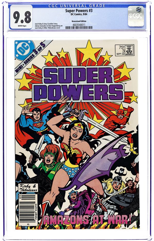 Newsstand Edition. With the help of Darkseid's "Emissaries of Doom," Brainiac stirs long-dead racial memories in the citizenry of Wonder Woman's homeland Paradise Island, resulting in "Amazons at War." Based on the cartoon series of the same name. Cover art and plot by Jack Kirby, with script by Joey Cavalieri, pencils by Adrian Gonzalez, and inks by Alan Kupperberg. Cover price $0.75.