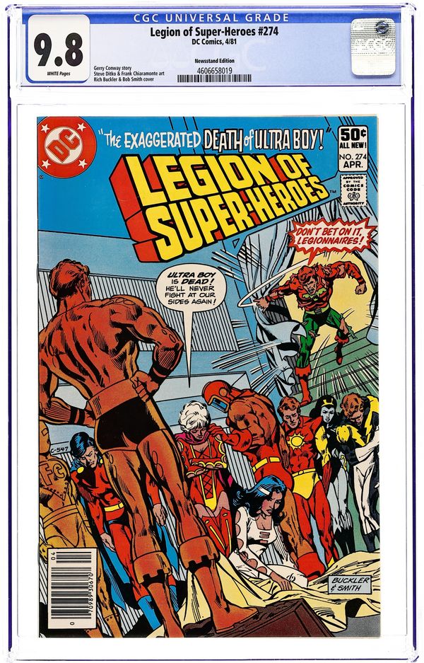 Newsstand Edition. Cover pencils by Rich Buckler, inks by Bob Smith. The Exaggerated Death of Ultra Boy, script by Gerry Conway, pencils by Steve Ditko, inks by Frank Chiaramonte; The Legion dedicates a statue to the fallen Ultra Boy, but, unknown to them, an amnesiac Jo Nah has been rescued by a band of space pirates and later joins them in a raid that the Legion unsuccessfully tries to stop. Membership application for the Superman Club. Advertisement for Hostess Twinkies with Wonder Woman; pencils by Curt Swan, inks by Vince Colletta. 36 pgs. $0.50. Cover price $0.50.