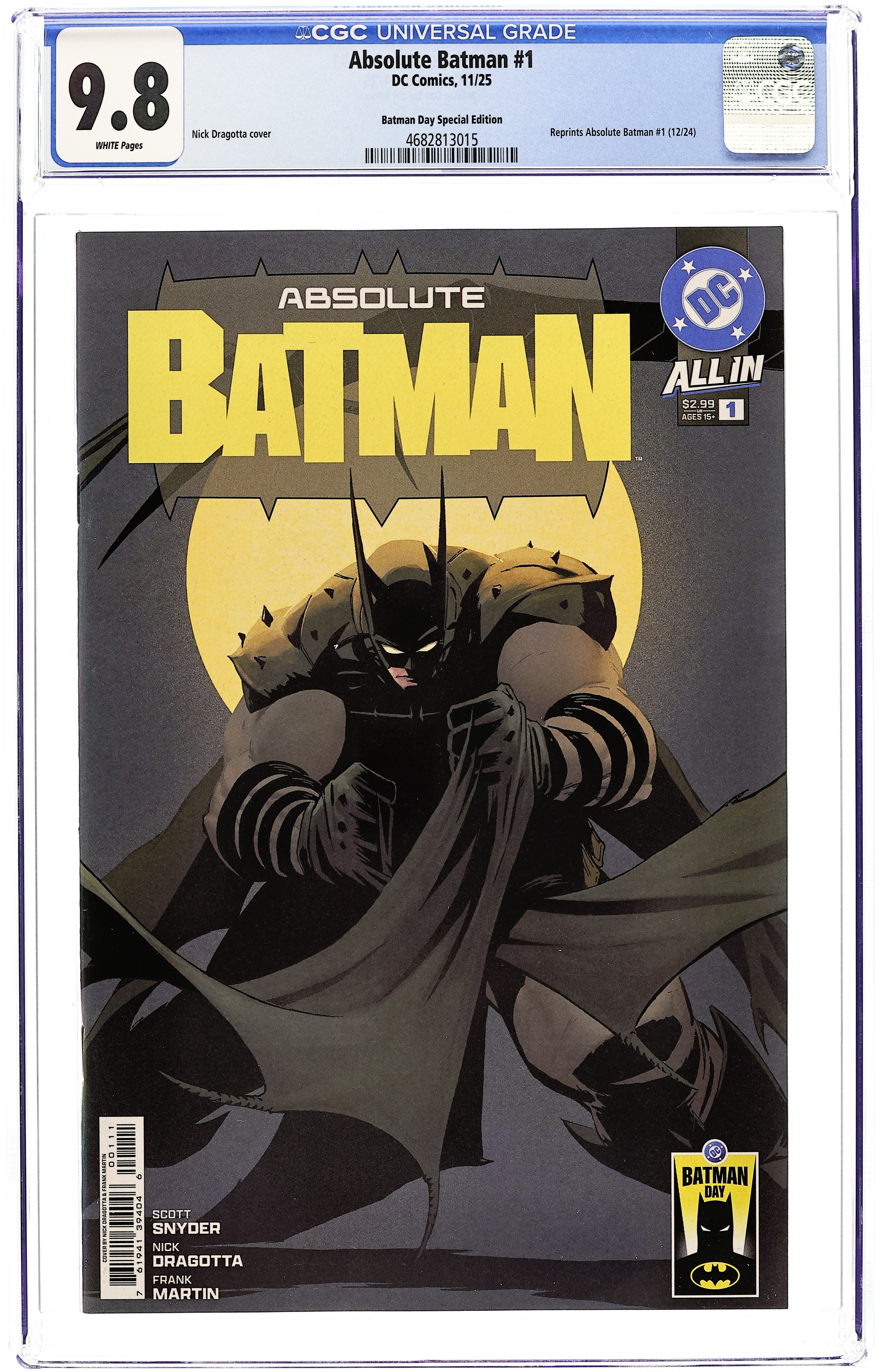 Written by Scott Snyder. Art by Nick Dragotta. Cover by Nick Dragotta. BATMAN LEGEND SCOTT SNYDER AND ICONIC ARTIST NICK DRAGOTTA TRANSFORM THE DARK KNIGHT'S TALE FOR THE MODERN AGE! Without the mansion...without the money...without the butler...what's left is the Absolute Dark Knight! 44 pages, full color. Rated T+