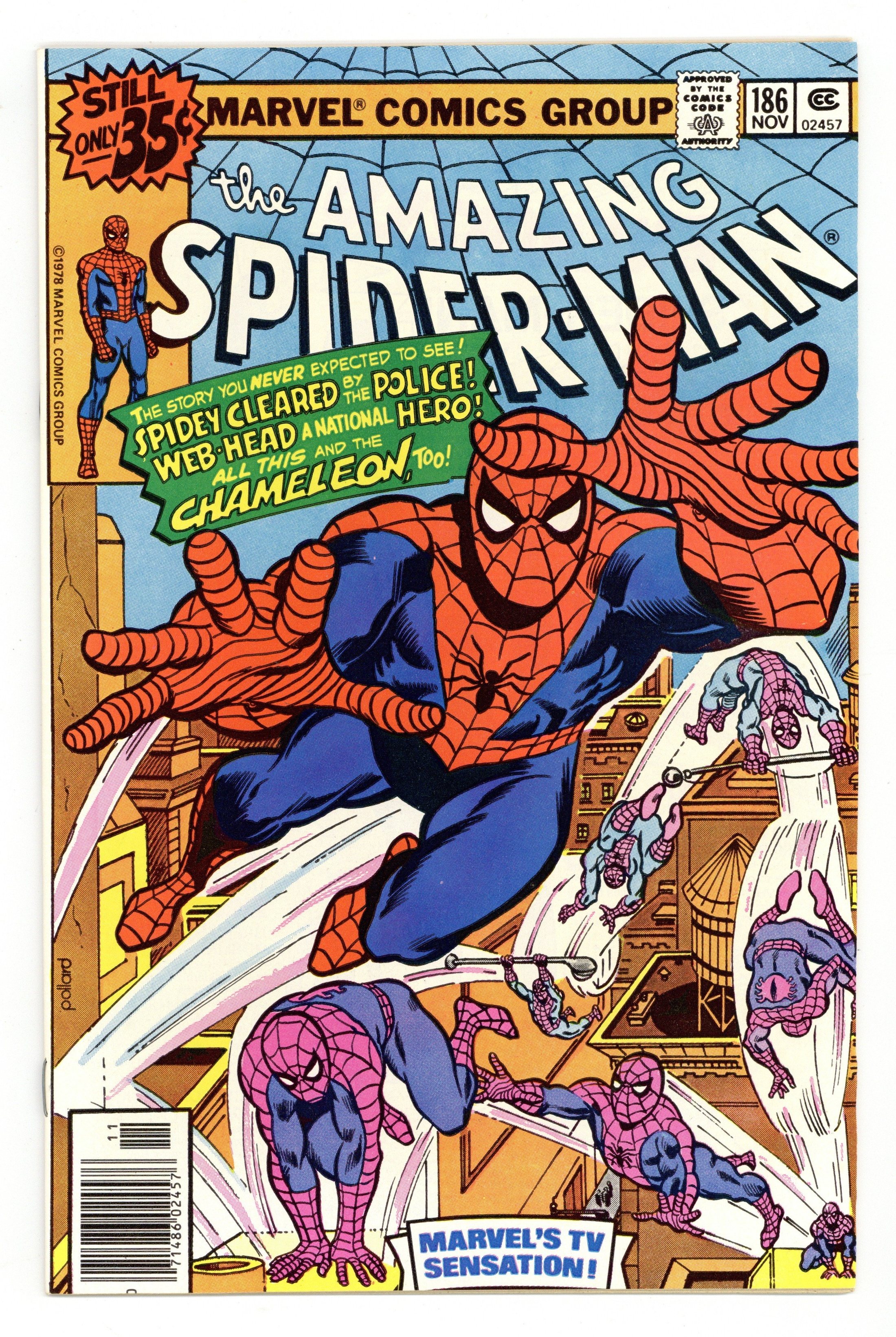 Tags: Marvel Legacy Numbering: Amazing Spider-Man (part 186), Spider-Man$50.00"Chaos is the Chameleon!" Script by Marv Wolfman. Art by Keith Pollard (layouts) and Mike Esposito (finishes). Cover by Keith Pollard. What a happy day for the Amazing Spider-Man! The district attorney clears the web-slinger of all charges in the deaths of Norman Osborn and Captain George Stacy! And now the wall-crawler holds a press conference in Central Park to bask in the glow of his freedom! But an old adversary disrupts Spidey's joyous occasion! Can the spectacular one see through the Chameleon's brilliant disguise? Cameo appearances by Professor Spencer Smythe, Aunt May, Flash Thompson, and Betty Brant. (Notes: The Chameleon formerly appeared in Daredevil 134 and returns a decade later in Amazing Spider-Man 306 & 307. Keith Pollard begins his run (thru issue 205) as the primary artist on the Amazing Spider-Man title.) 36 pages Cover price $0.35.