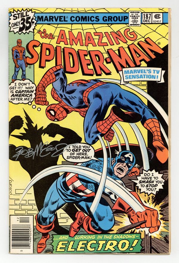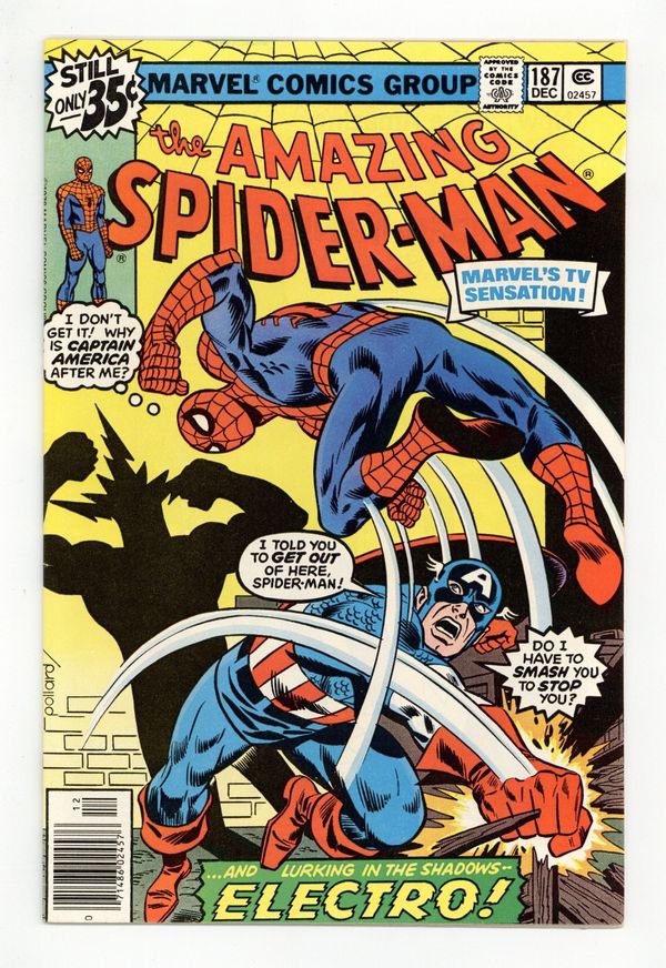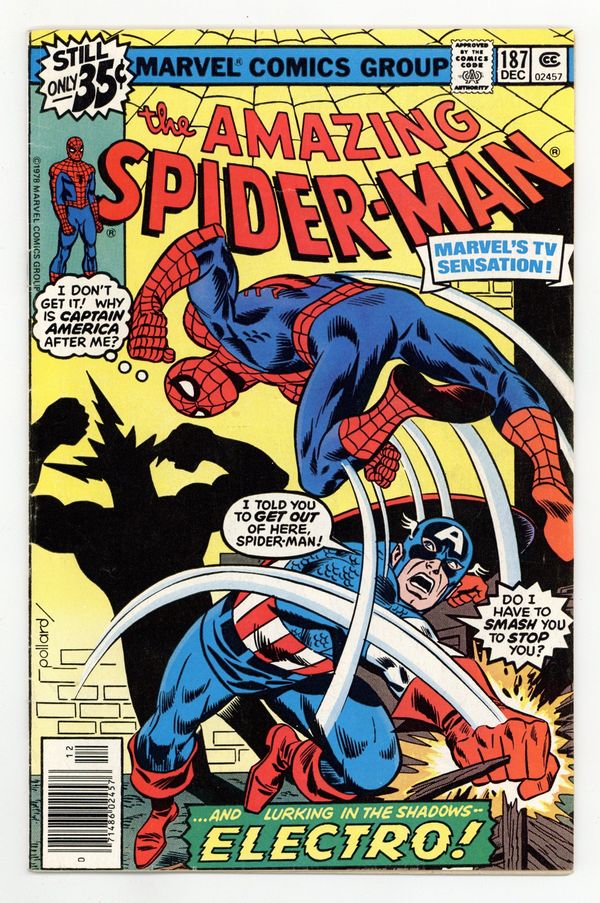 Tags: Marvel Legacy Numbering: Amazing Spider-Man (part 187), Spider-Man$15.00"The Power of Electro!" Guest-starring Captain America. Plot by Marv Wolfman and Jim Starlin. Script by Marv Wolfman. Brilliant art by Jim Starlin (layouts) and Bob McLeod (finishes). Cover by Keith Pollard. It's an overstuffed tale featuring the star-spangled avenger, web-slinger, SHIELD, Electro, and the bubonic plague! When the Daily Bugle receives a tip that authorities have cordoned off the neighborhoods surrounding the Indian Point Power Station, Jonah sends his ace photographer to investigate! The web-slinger easily slips past the SHIELD agents but runs into a problem after bumping into the Sentinel of Liberty! Cap wants the wall-crawler to leave the area ASAP! But Cap would think differently if he knew that an electrifying encounter awaits! The Amazing Spider-Man and Captain America vs. Electro! Cameo appearances by Dum Dum Dugan, J. Jonah Jameson, and Joe Robertson. (Notes: This is one of only three issues Jim Starlin drew for the Amazing Spider-Man title (1st series): issues 113, 114, and 187. More of Jim Starlin's artwork featuring Spider-Man can be seen in Marvel Two-in-One Annual 2. The web-slinger and Electro previously battled in Marvel Team-Up 56.) 36 pages Cover price $0.35.