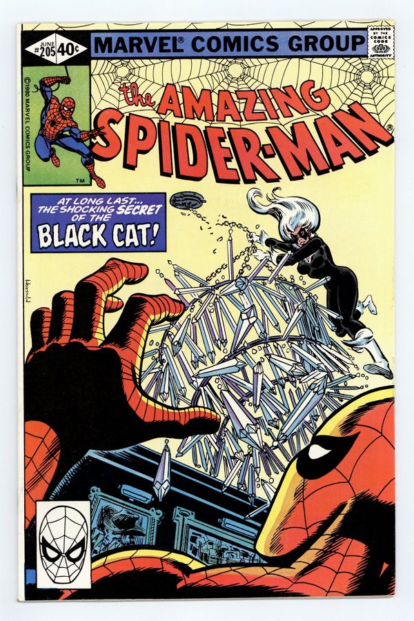 Direct Edition. "...In Love and War!" Part 2 of 2. Script by David Michelinie. Pencils by Keith Pollard. Inks by Jim Mooney. Cover by Al Milgrom. The crafty Black Cat continues to elude the wondrous wall-crawler! So far Felicia has collected two of the four romantic artifacts she seeks! However, it will be much more difficult to grab the last two with a certain web-slinging superhero poised to stop her! At an east side estate, the cat steals her final prize! But the amazing one follows her home! Will Spider-Man and Felicia finally resolve their differences? A surprise ending with a tender hug! (Note: The Black Cat returns in Amazing Spider-Man 226.) 36 pgs. Cover price $0.40.