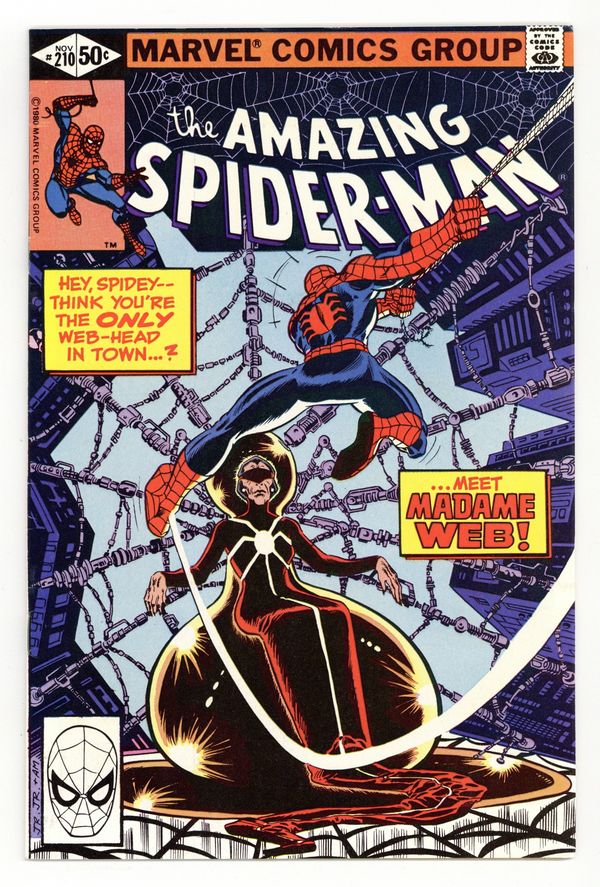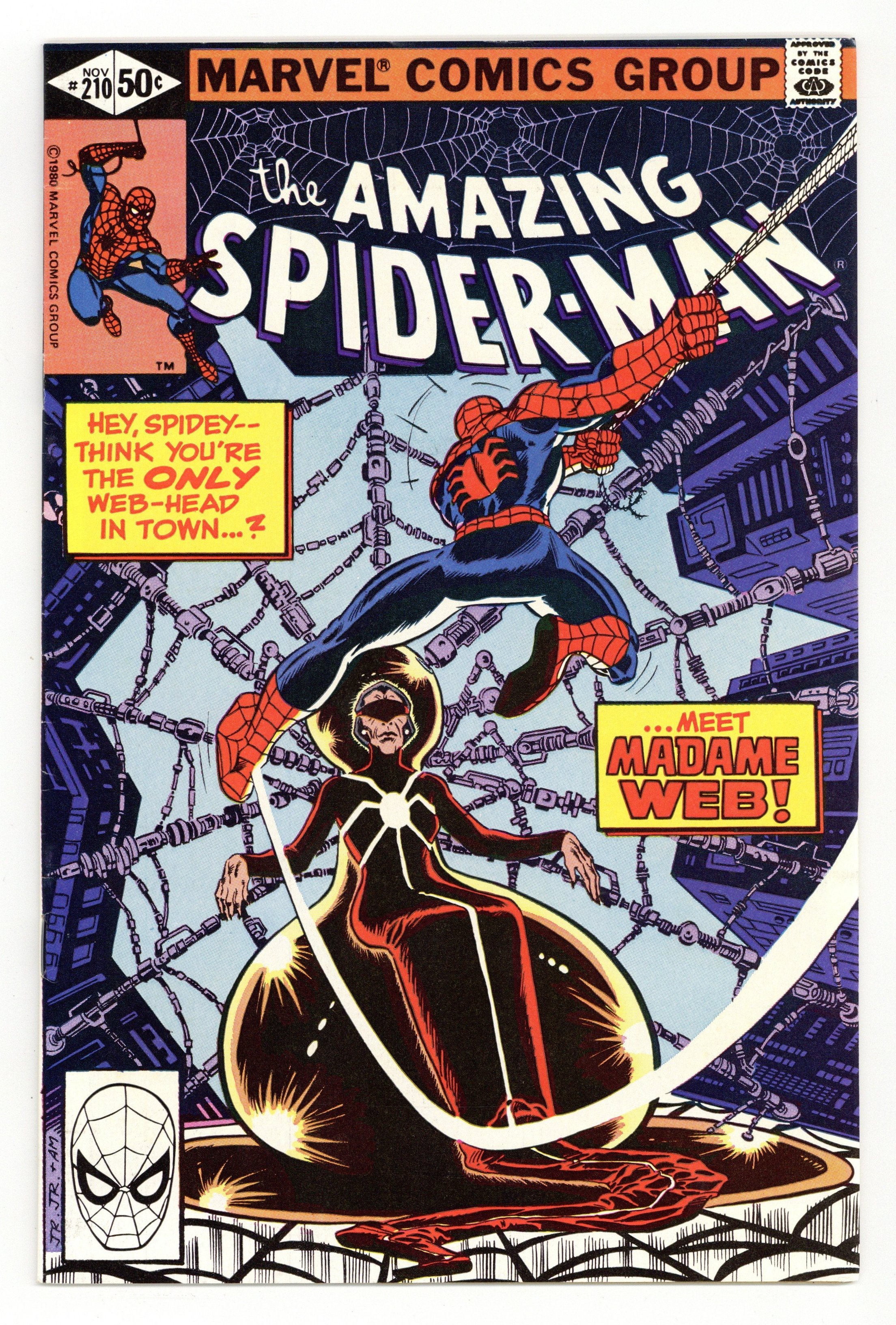 Tags: Marvel Legacy Numbering: Amazing Spider-Man (part 210), Spider-Man$70.00Direct Edition. "The Prophecy of Madame Web!" First appearance of Madame Web. Script by Denny O'Neil. Art by John Romita Jr. (breakdowns) and Joe Sinnott (finishes). Cover by John Romita Jr. and Al Milgrom. Masked gunmen barge into the board room of the Daily Globe and kidnap its publisher K.J. Clayton! Fortunately though, the web-slinger is nearby and gives chase! The wall-crawler doesn't catch the criminals, but he does catch a clue! A mysterious clairvoyant called Madame Web is somehow connected to the victim! After befriending the aging soothsayer and heeding her advice, Spider-Man rushes off to the rescue! Can the web-slinger find the missing publisher and get the Daily Globe back in circulation? Cameo appearance by J. Jonah Jameson. (Notes: Peter Parker ends his employment with the Daily Globe. Madame Web appears next in Amazing Spider-Man 216. John Romita Jr. begins his three-and-a-half year run as the penciler of the Amazing Spider-Man title.) 36 pages, full color. Cover price $0.50.