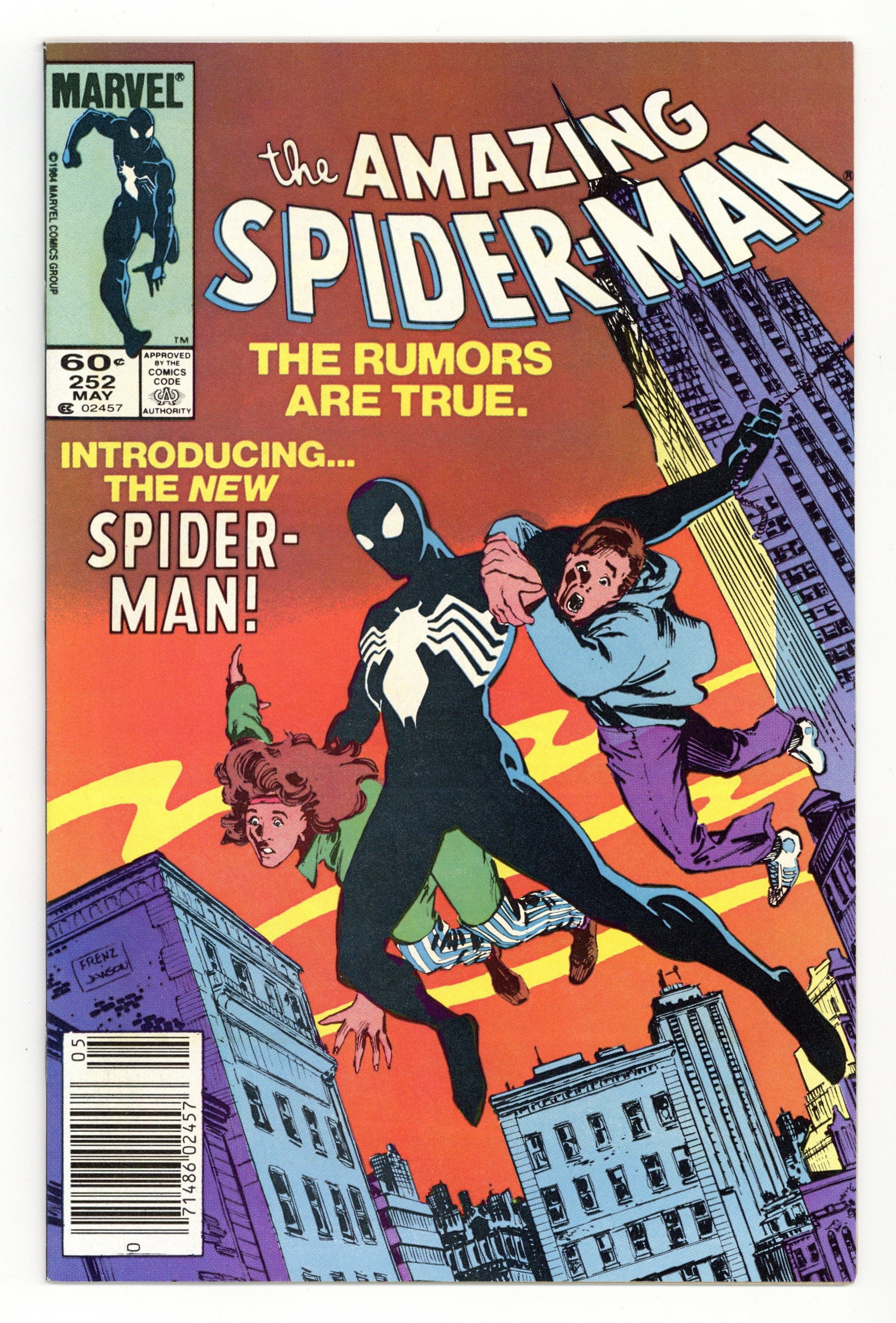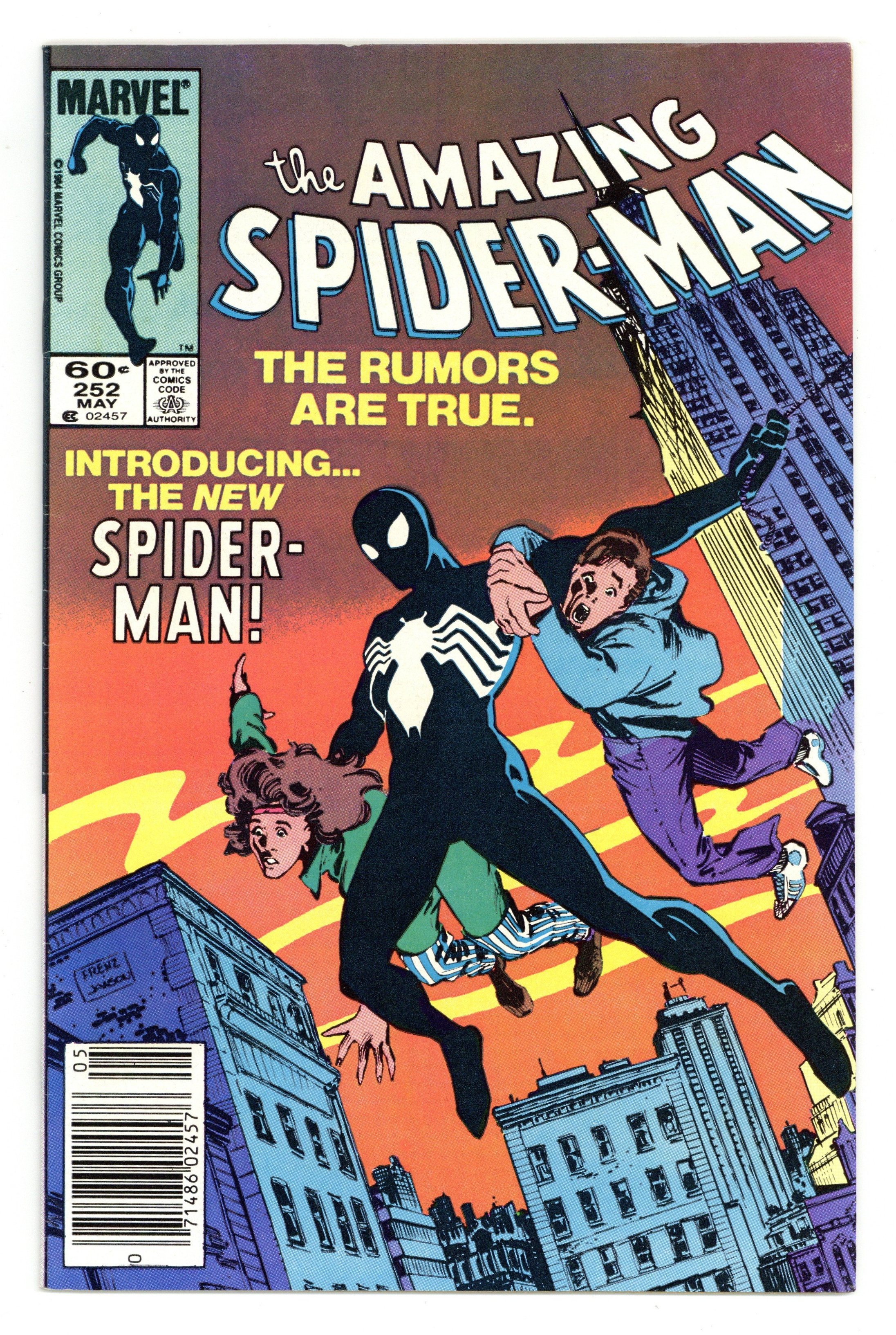 Newsstand Edition. First appearance of Spider-Man's new black (alien symbiote) costume in "Homecoming!" Plot by Roger Stern. Script by Tom DeFalco. Pencils by Ron Frenz (breakdowns) and Brett Breeding (finishes). Cover by Ron Frenz and Klaus Janson. One of the landmark issues of the Amazing Spider-Man! With a brilliant flash of light in Central Park, the wondrous wall-crawler is back! And he looks a whole lot different! Wow, a new costume! What happened during the Secret Wars on the Beyonder's world? The ominous truth will be revealed to both the readers and the web-slinger in the days and weeks ahead! Cameo appearances by the Black Cat, Dr. Curt Connors, J. Jonah Jameson, Joe Robertson , Aunt May, Captain America, Captain Marvel, Hawkeye, Iron Man, Thor, and the Wasp. (Notes: Marvel Age 12 contained sketches of the new costume two months prior to the publication of this issue. Spidey's new costume was also unveiled in Marvel Team-Up 141 and Spectacular Spider-Man 90. The first issue of the (1984) Marvel Super Heroes Secret Wars Limited Series was published the same month as Amazing Spider-Man 252. The web-slinger discovers his new costume in issue 8 of the limited series. The Frenz-Janson cover is a tribute to the iconic cover of Amazing Fantasy 15. This story was reprinted in Marvel Tales 266. The letters page contains a statement of ownership: average print run 470,527; average paid circulation: 241,762. 36 pgs. Cover price $0.60.