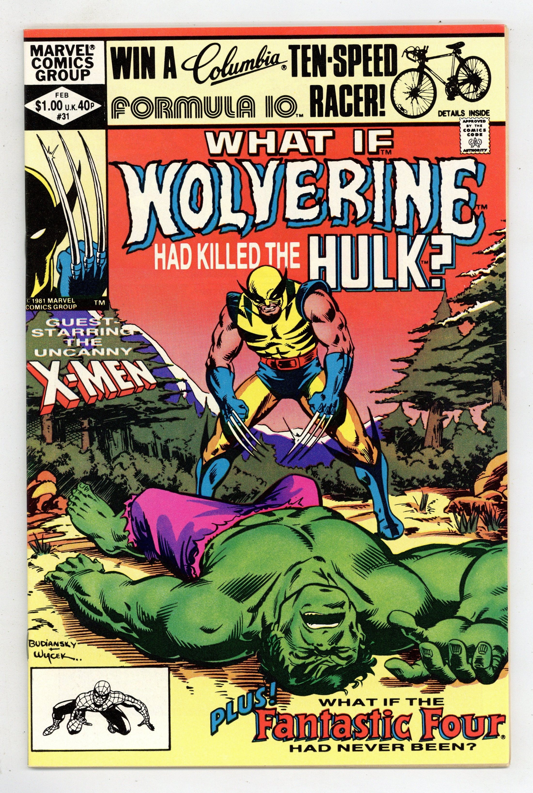 Direct Edition. Cover pencils by Bob Budiansky, inks by Bob Wiacek. "What If Wolverine Had Killed the Hulk?" Script by Rich Margopoulos, pencils by Bob Budiansky, inks by Mike Esposito; Wolverine kills the Hulk and joins Magneto's Brotherhood of Evil Mutants; Co-starring the X-Men, Magneto, and the Brotherhood of Evil Mutants; Cameos by Spider-Man, the Avengers, Daredevil, the Fantastic Four, and the Sentinels; Based on The Incredible Hulk #181. Dungeons & Dragons ad. "What If There Was No Fantastic Four?", script by Roger Stern (based on a plot by Bill Mantlo), pencils by Alan Kupperberg, inks by Frank Giacoia; The Thing never joins the team which has repercussions throughout the Marvel Universe. "Daredevil's Longest Fight!" ad for Hostess Fruit Pies. 52 pgs. Cover price $1.00.