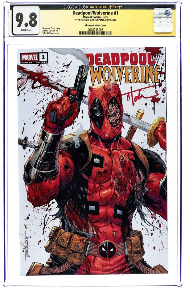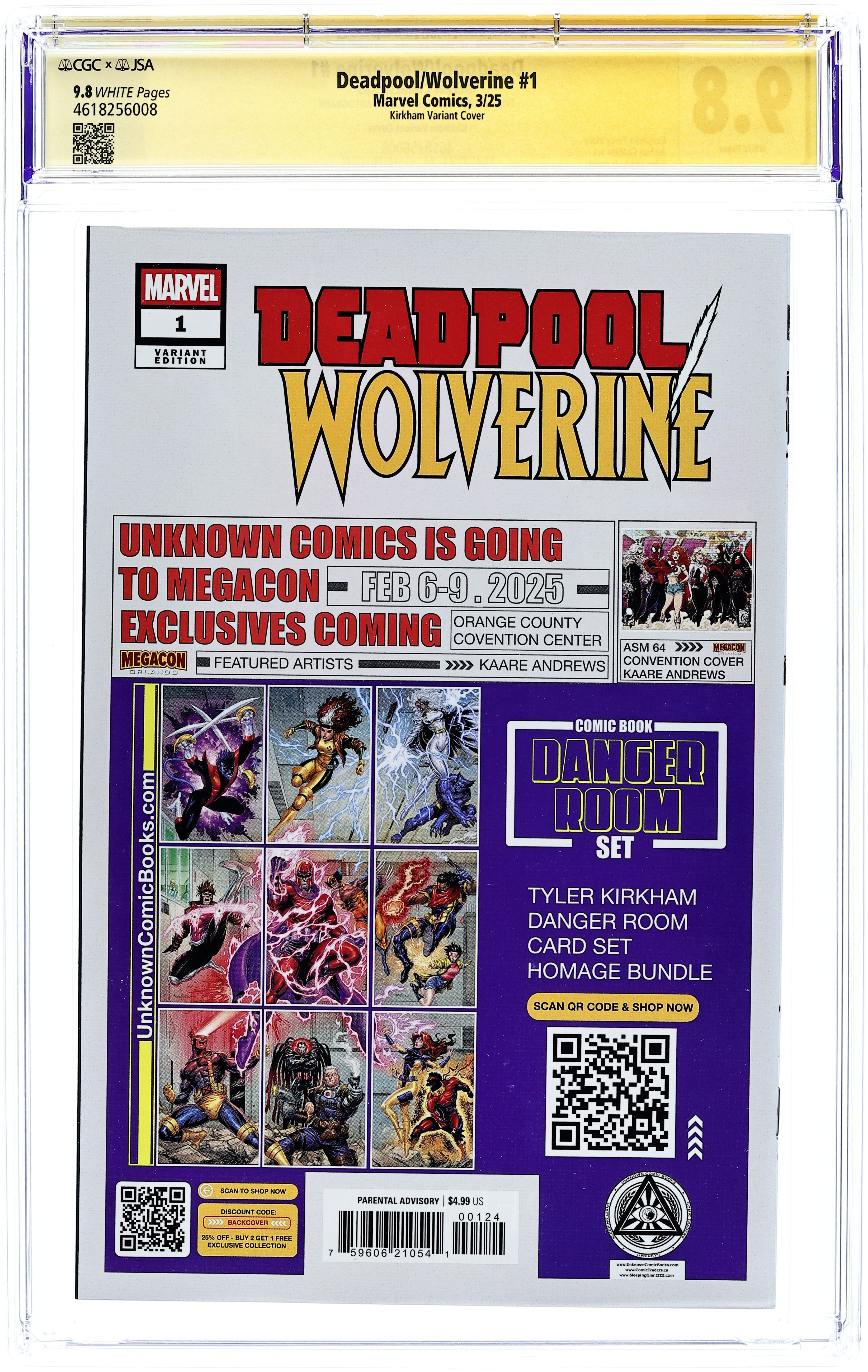 Comics Illuminati (Unknown Comic Books, Comic Traders, and Sleeping Giant) Exclusive Variant Cover by Tyler Kirkham. Written by Benjamin Percy. Art by Joshua Cassara. WADE AND LOGAN - TOGETHER AGAIN! The most unlikely team-up turned most demanded one, DEADPOOL and WOLVERINE are BACK! Together again and ready to blow your minds in this ongoing series that hits like a never-ending action movie - with the fate of the world in the balance! When a fan-favorite VILLAIN is unearthed, you'll get to see a new side of our heroes and their adversary, as an ages-long plan comes to fruition. And the only thing that stands between the Earth and annihilation is the Best There Is and the Merc With The Mouth. Brought to you by another legendary pairing - writer Benjamin Percy (WOLVERINE, HELLVERINE) and artist Joshua Cassara (X-FORCE, X-MEN) - these comic superstars put your favorite super heroes through their paces in a series chock-full of surprises, twist reveals and a villainous plot that'll turn long-term and newly arriving X-readers' heads. This is one for the pull list! 32 pages, full color. Rated Parental Advisory