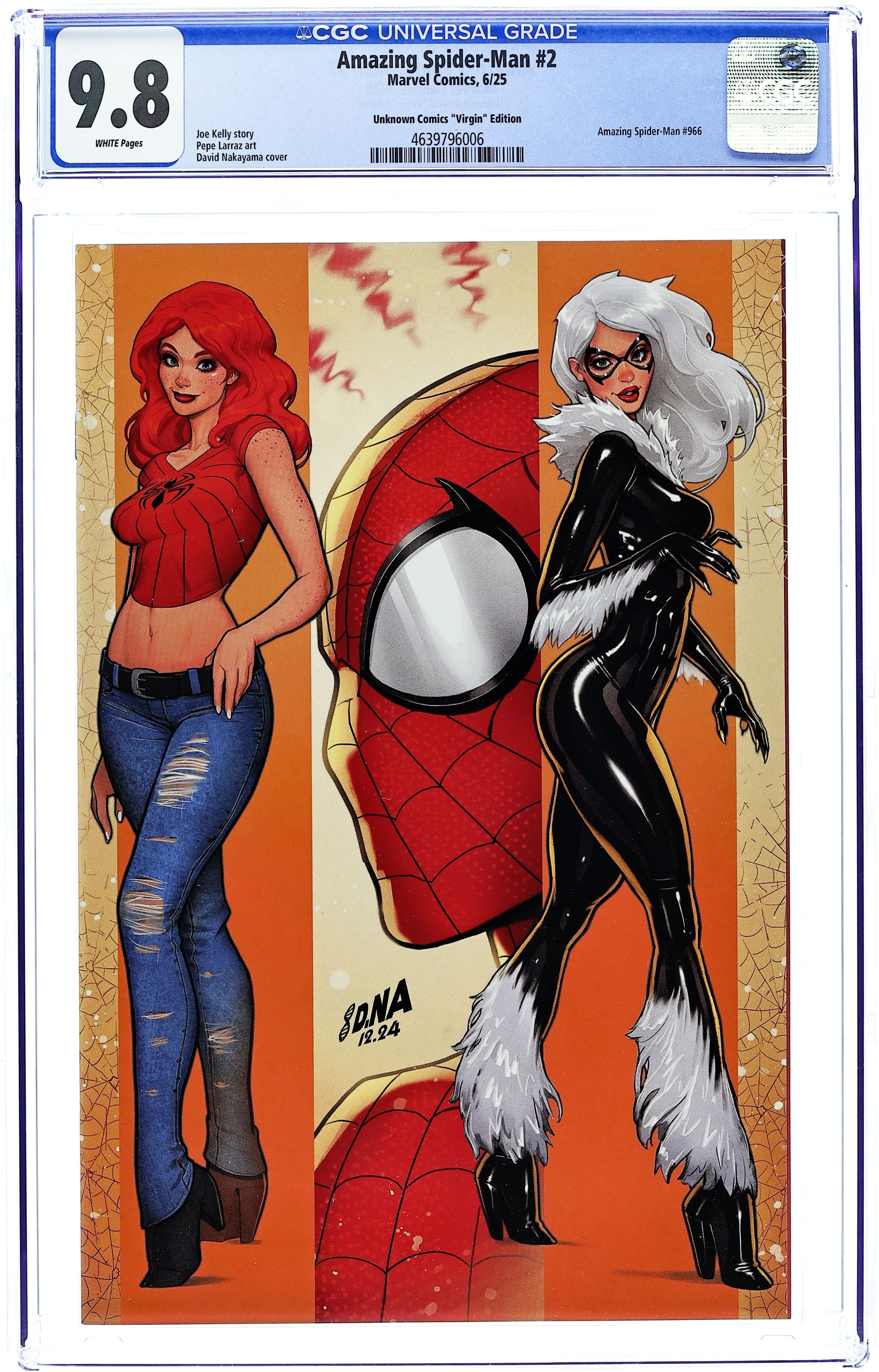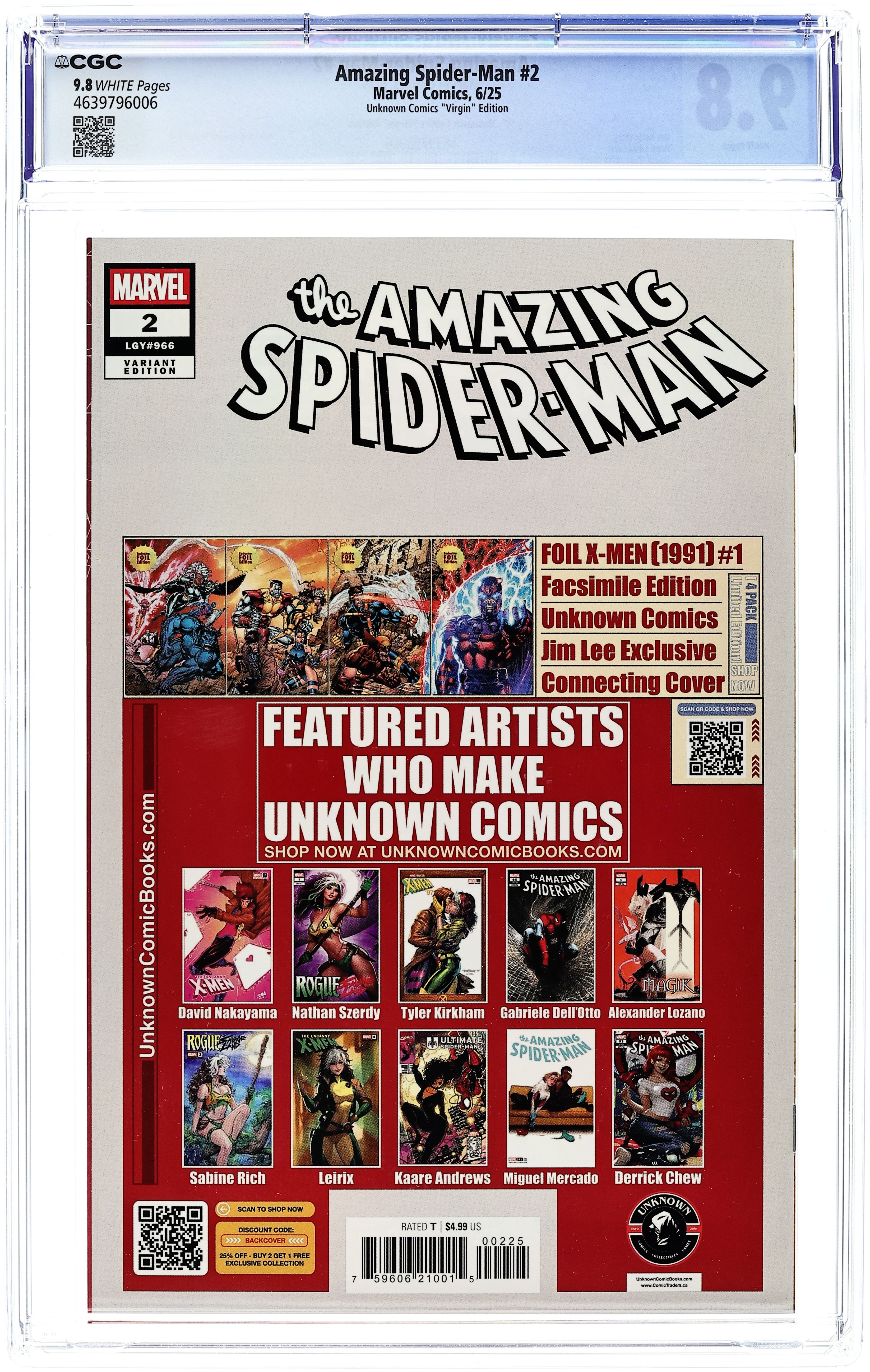 Unknown Comics Exclusive Virgin Cover by David Nakayama. Written by Joe Kelly. Art by Pepe Larraz. RHINO RAMPAGE! What amped Rhino up from criminal super-bruiser to rampaging disaster machine? We aren't spilling, but it just amped up Spider-Man! That's right, Spider-Man is going in and out of control of his senses trying to figure out how to get full control of his body. And the only people who can help are Norman Osborn and…Peter's long-lost childhood best friend?! 32 pages, full color. Rated T