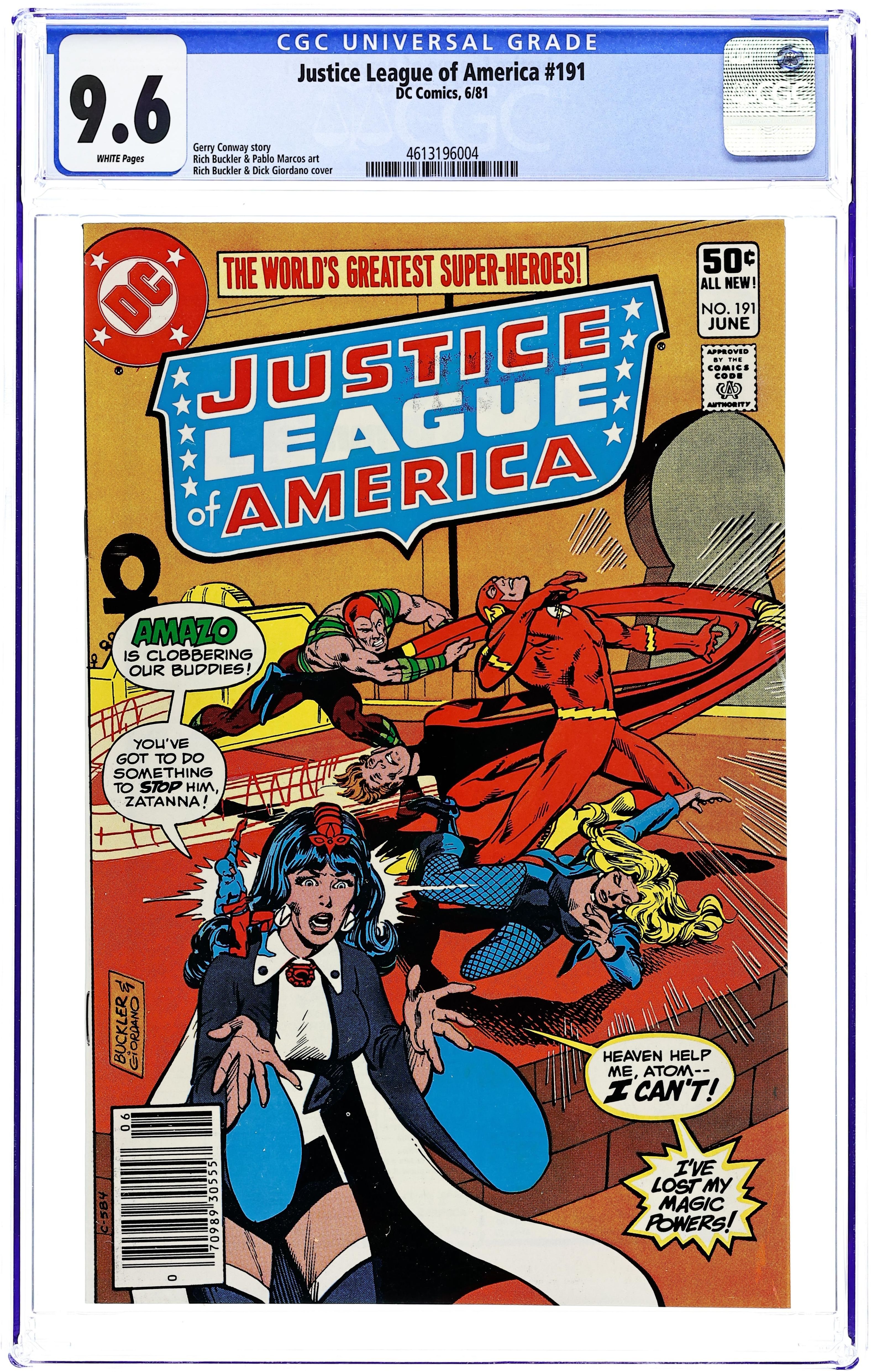 Newsstand Edition. Zatanna loses her magic powers in "The Key Crisis of the One-Man Justice League!" Written by Gerry Conway, with art by Rich Buckler and Pablo Marcos. Characters: Black Canary; Elongated Man; Atom [Ray Palmer]; Flash [Barry Allen]; Zatanna; Hawkman [Katar Hol] (all as the Justice League of America/JLA); Amazo (villain); The Key (villain). Cover by Rich Buckler and Dick Giordano. Cover price $0.50.