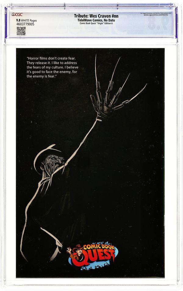 Comic Book Quest Exclusive Virgin Cover by Ben Vasquez - limited to 40 copies. Story by David Lee Andrews. Art by Martin Gimenez. Wes Craven, otherwise known as the 'Master of Horror', was a popular American filmmaker who had a career in the entertainment industry that spanned approximately forty-seven years. During that time he directed such horror films as 'A Nightmare on Elm Street', 'The Hills Have Eyes', and 'Scream'. He also directed a number of other films you'll be able to discover in a new biographical comic book that chronicles his life and career.