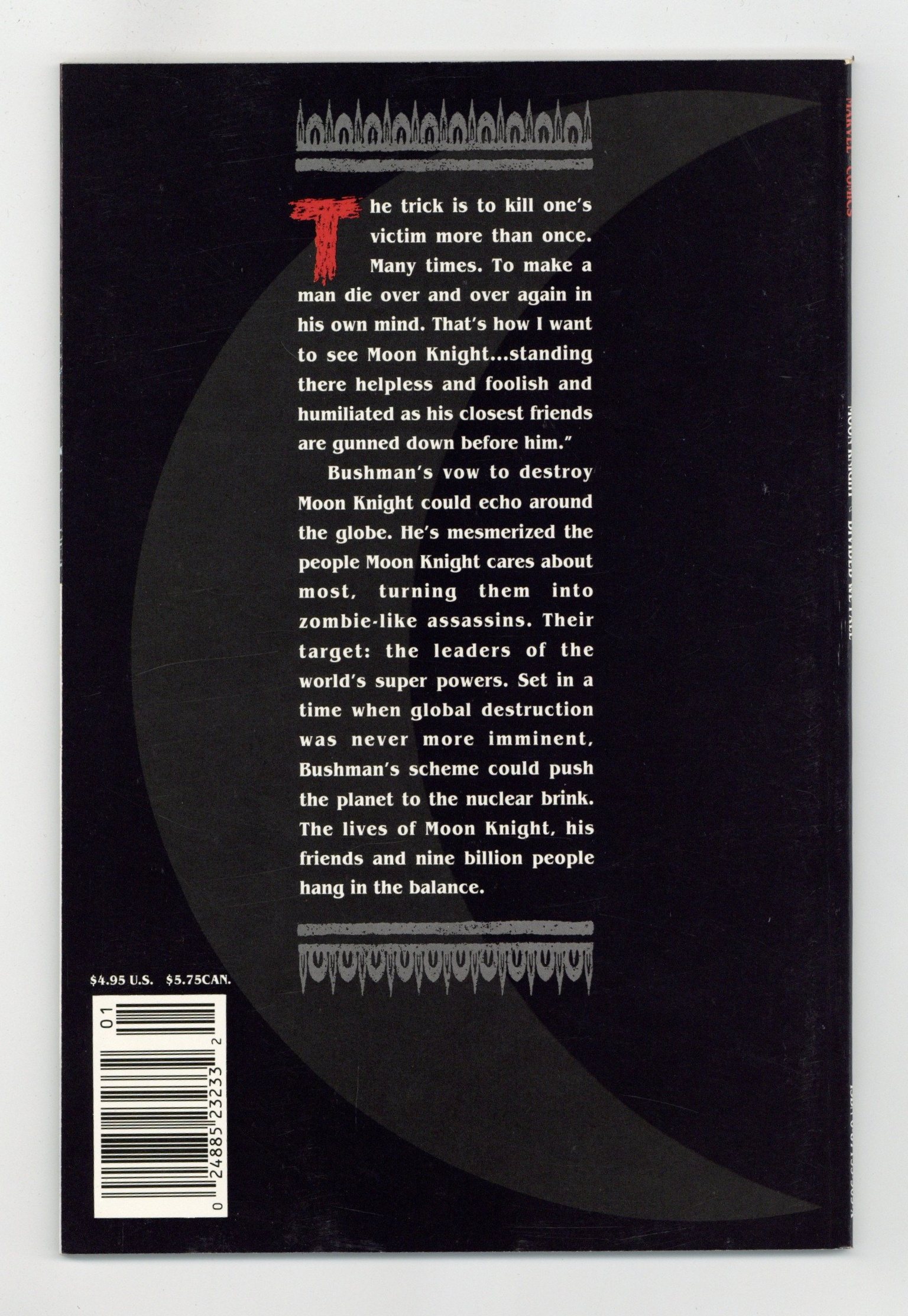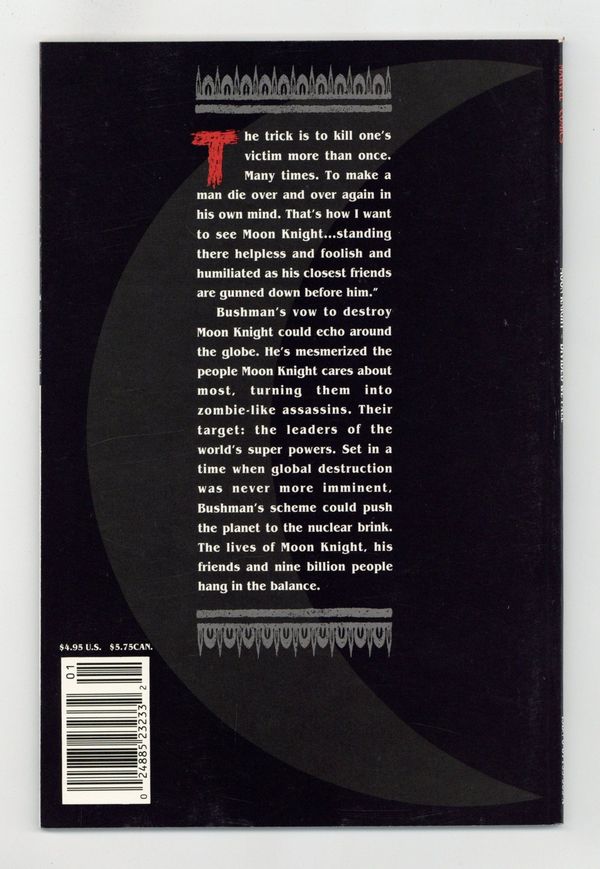 Moon Knight's archfoe Bushman devises his most nefarious scheme ever. He brainwashes the Knight's closest friends, Marlene and Frenchie, into planning to assassinate the world's top leaders. Written by Bruce Jones. Art by Denys Cowan, Tom Palmer and Mike Manley. Cover by Denys Cowan. Bookshelf format. Cover price $4.95.