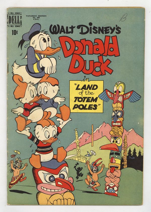 $150.00Canadian Edition. Cover by Carl Barks. "Land of the Totem Poles" - Story and Art by Carl Barks; Donald is hired as a salesman on the Kickmiquick River in Northwest Canada, and learns only when he arrives there that he is to sell steam calliopes. 12 half-page Donald Duck comic strips. "Donald's Nephews Take Over" text story. 36 pages, full color.