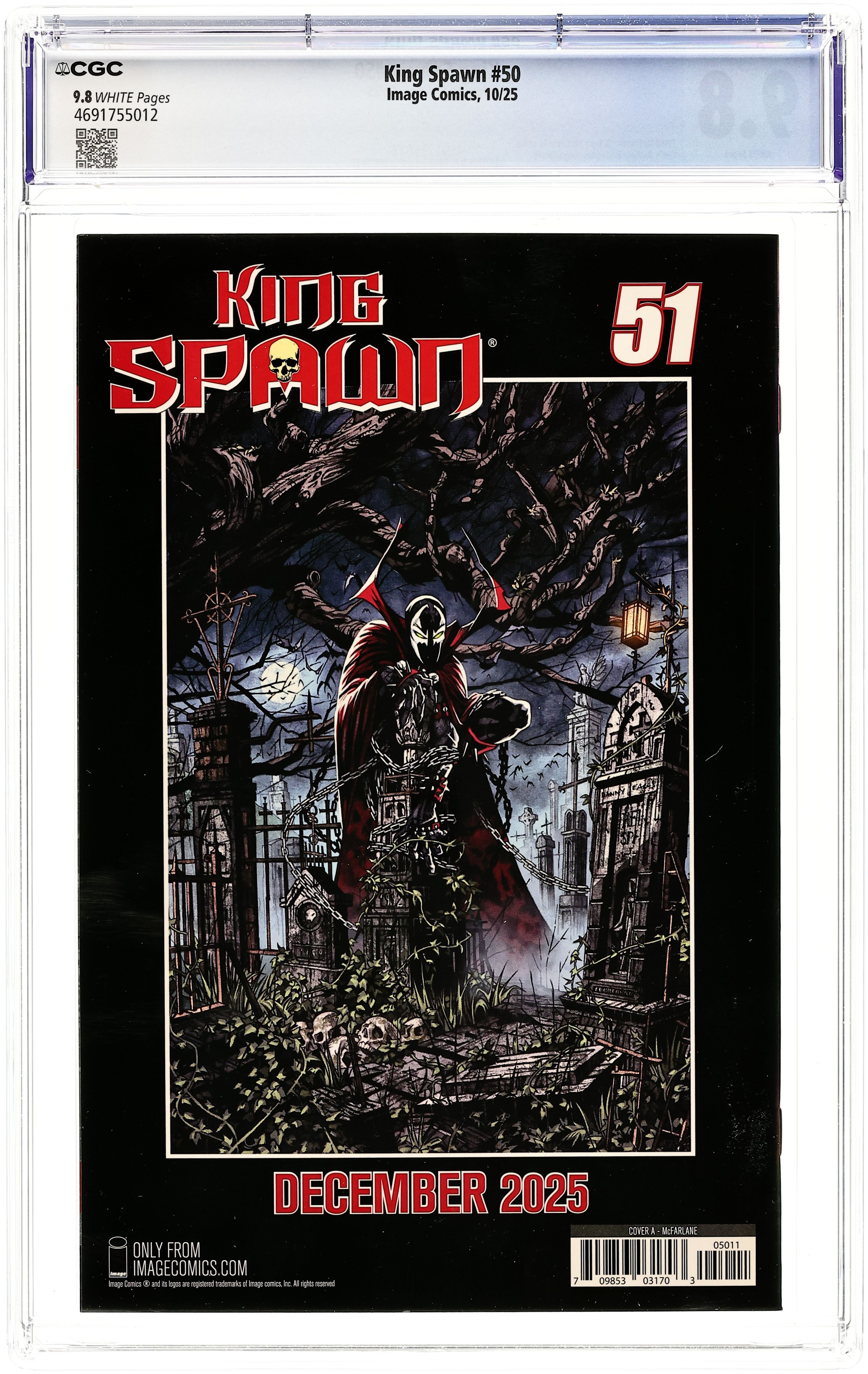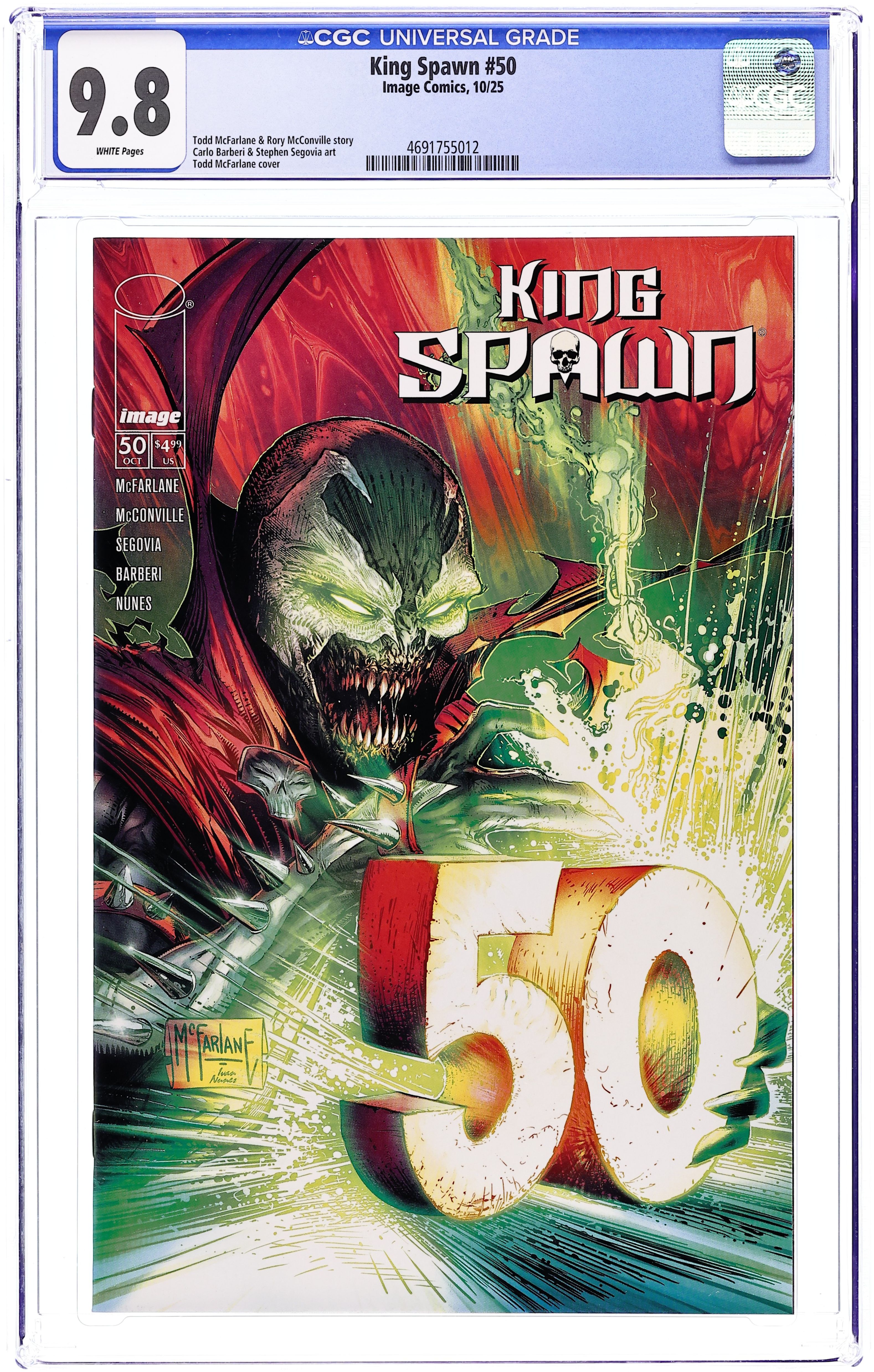 (W) Rory McConville, Todd McFarlane (A) Stephen Segovia, Carlo Barberi (CA) Todd McFarlane Four years ago, Todd McFarlane launched the first large-scale expansion of the Spawn Universe with King Spawn #1. Now we are here to celebrate the success of the expanded Spawn's Universe with King Spawn #50. An oversized issue with a story that will cross over into all three of the #50's coming out in the coming months. (King Spawn, Gunslinger Spawn, The Scorched). An ancient force, almost as old as time itself, has returned, and Spawn is in its sights. The story, sent into two chapters per issue, will be penciled by two of the Spawn Universe's best, Stephen Segovia and Carlo Barberi. 32 pages, full color, not rated. Cover price $4.99.