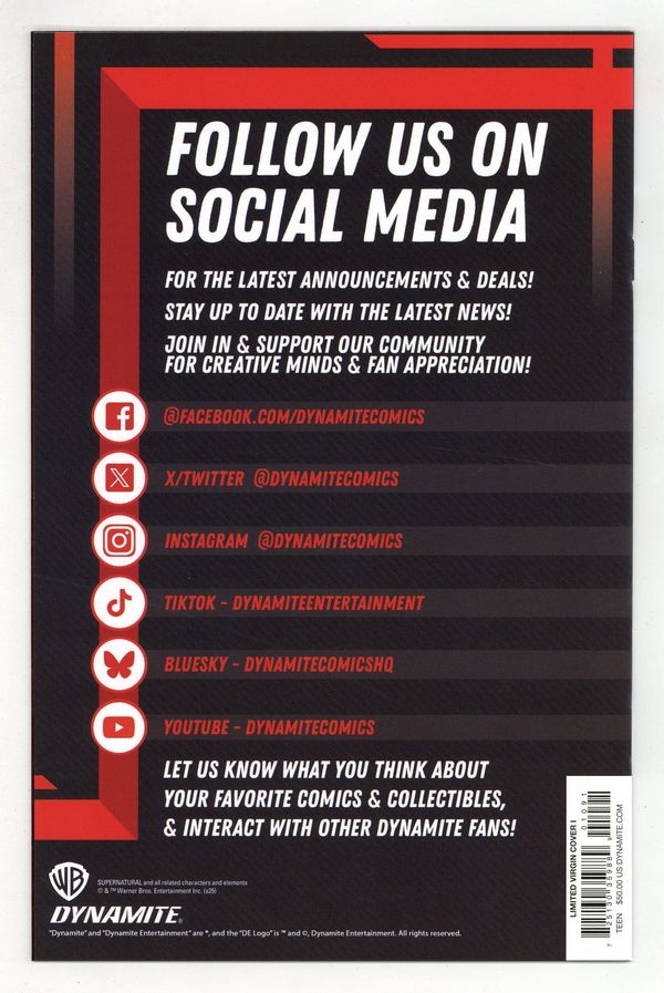 Published by Dynamite Entertainment.$50.00(W) Greg Pak (A) Eder Messias (CA) Photo THE BROTHERS WINCHESTER RETURN! Get ready to hit the road again with Dean and Sam as they prowl the highways and byways of small-town America in search of demonic wrongdoing to put right! Set between the foundational first and second seasons of the landmark television series, this brand-new title from acclaimed author GREG PAK (Darth Vader, Lilo & Stitch) and preternaturally gifted artist EDER MESSIAS (Sam Wilson: Captain America) brings readers back to where the dark magic first began — and reveals a disturbing new threat that the bickering brothers will have to face before they can return to hunting down the demon who killed their mother.t In this first issue, the monster hunters must uncover the entity responsible for a series of mysterious fires in a decaying rust belt town — attacks that begin with a Windler Industries factory burning down, and then escalate to several Windler employees themselves going up in flames. But finding the malevolent force behind the otherworldly arsons may not be as straightforward as it might seem — especially once the suspiciously well-prepared CEO Steff Windler gets personally involved! Featuring atmospherically arresting covers from CLAYTON CRAIN, DAVID COUSENS, and EDER MESSIAS, each issue of Supernatural also includes a special PHOTO cover showcasing the beloved cast of the hit show! Cover price $50.00.