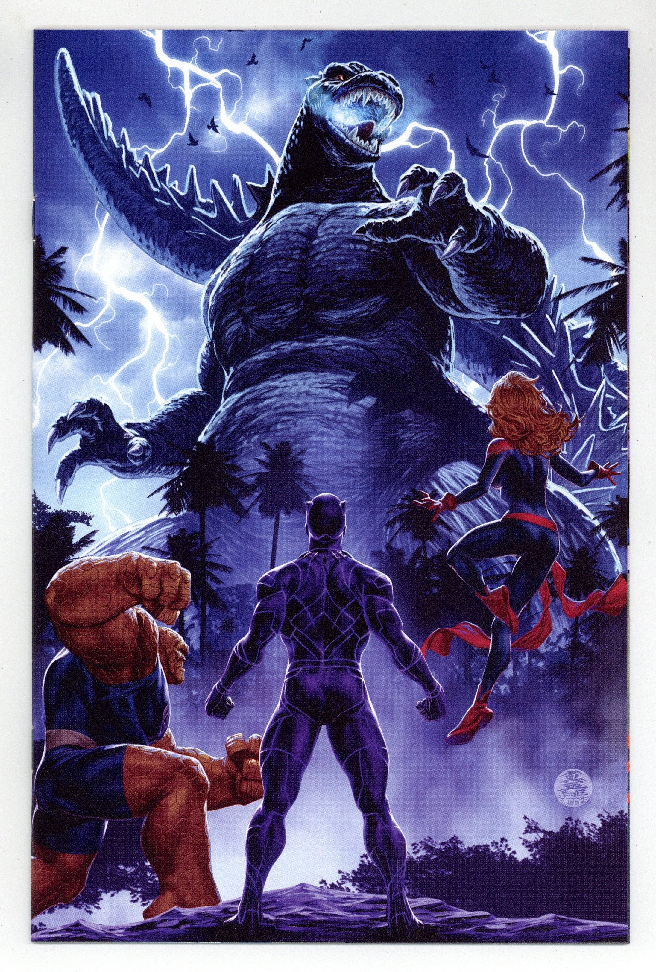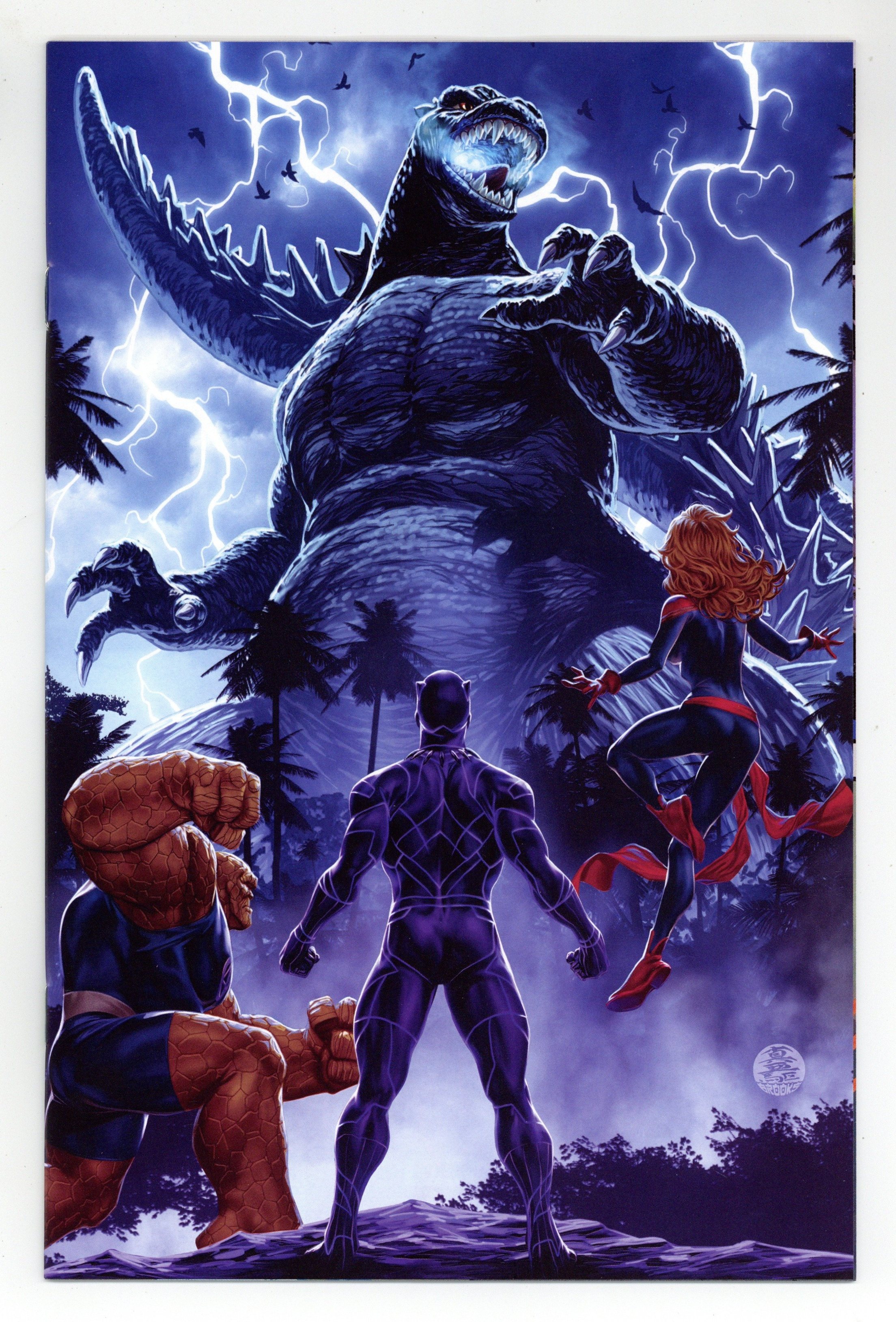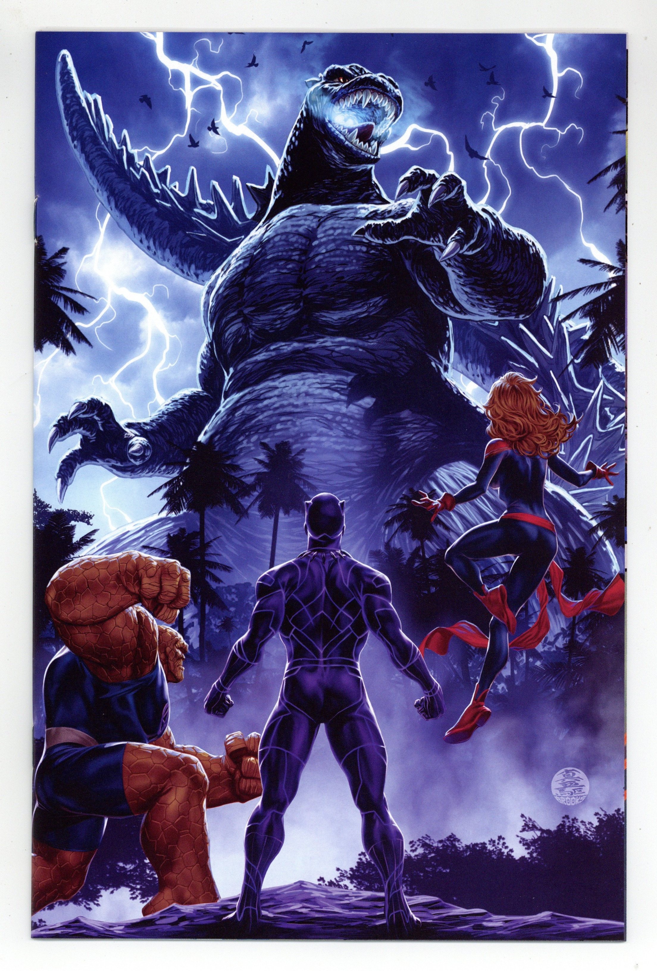Published by Marvel.$35.00Limited 1 for 50 Retailer Incentive Variant Cover. (W) Gerry Duggan (A) Javier Garron (CA) Mark Brooks GODZILLA SMASH! It's Godzilla versus the rampaging Hulk - and this time, the green goliath has a fistful of science as he takes on the King of the Monsters! Plus, as the two titans clash, the rest of the Marvel Heroes make a desperate ploy to keep the earth-shattering confrontation from literally tearing apart the planet! Trust us, True Believers, you're not going to want to miss a single page of action - especially not the last page with a reveal so shocking, it might just send Electro into an early retirement! Cover price $4.99.