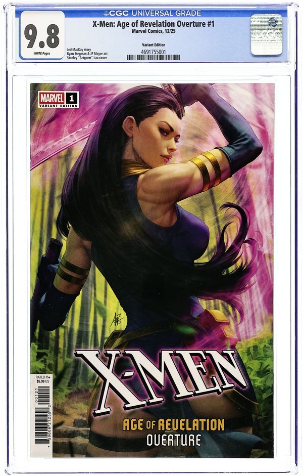Written by Jed MacKay. Art by Ryan Stegman. Cover by Stanley "Artgerm" Lau. THE HEIR RISES - THE RESISTANCE IGNITES! X YEARS LATER, the Revelation Territories stretch from the Atlantic to the Mississippi - a mutant utopia ruled by the heir of Apocalypse. But beneath the surface, rebellion brews. As a ragtag X-Men team strikes from the shadows, Revelation faces threats from within. It all begins here - the dawn of the AGE OF REVELATION! 40 pages, full color, rated T+. Cover price $5.99.