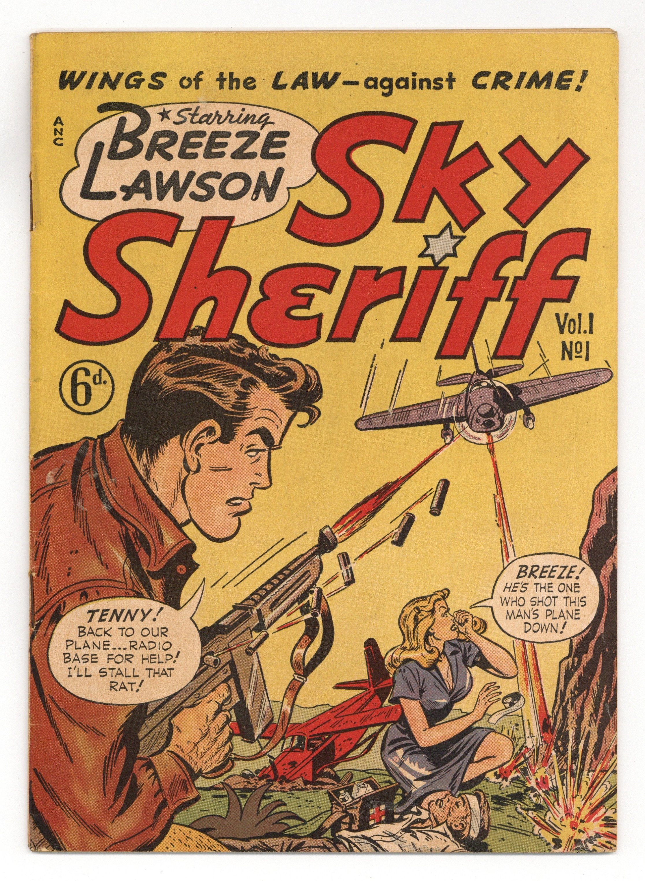 UK Reprint Edition. Reprints material from Sky Sheriff (1948 D.S. Publishing) #1. Stories and Art by Edmond Good. Stories include : "Breeze Lawson Sky Sheriff"; "Breeze Lawson - The Ghost of Silver Mesa"; "Vic Vanning Rider of the Pampas - Satan's Slaughterhouse"; "Two Gun Crowley or Killer Crowley"; "Breeze Lawson - Disguise of Death"; 6 3/4" X 9 1/2". 36 pages. B&W.