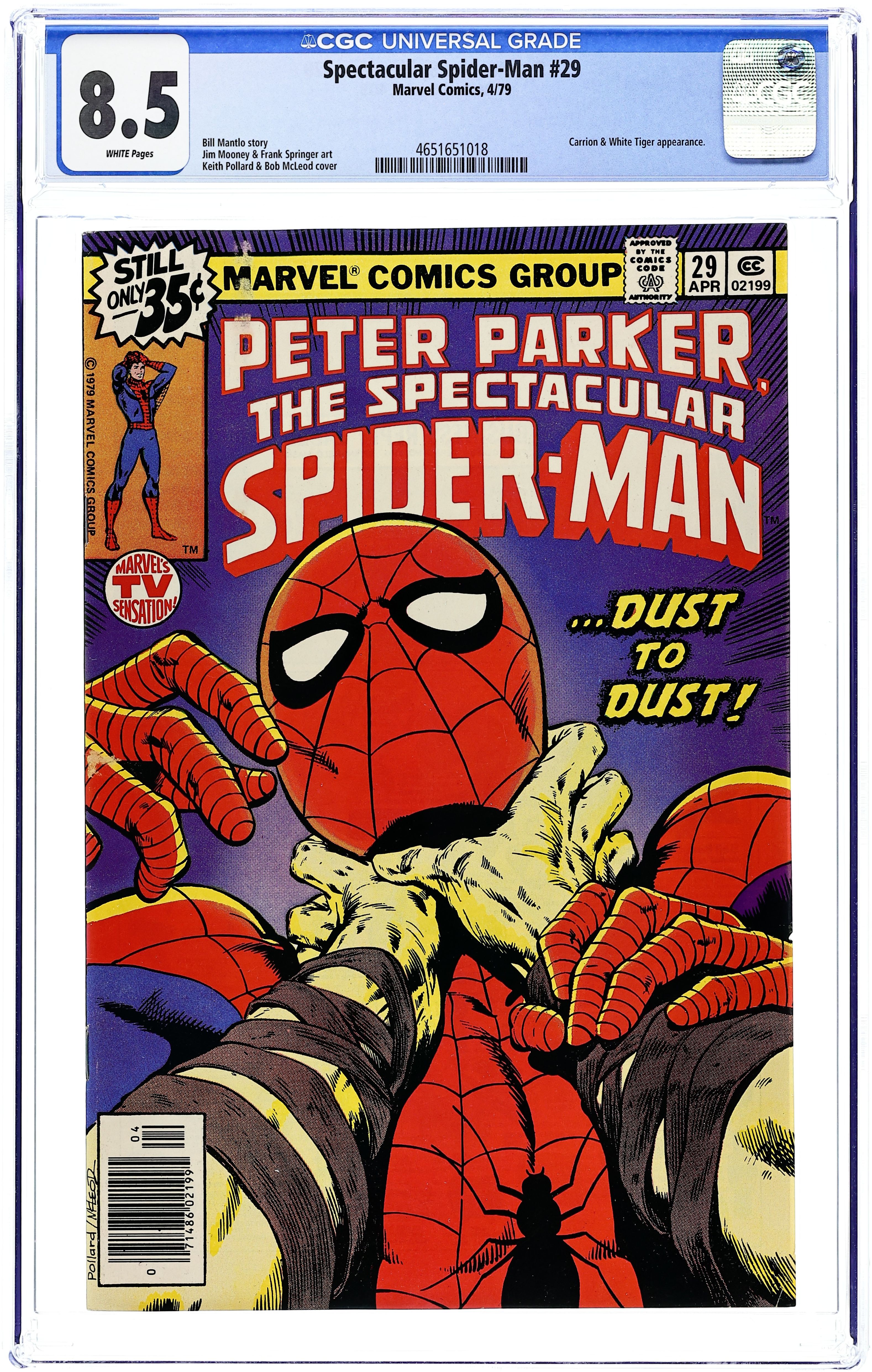 "Dust to Dust!" Script by Bill Mantlo. Pencils by Jim Mooney. Inks by Frank Springer. Cover by Keith Pollard and Bob McLeod. Peter Parker and Carrion wage a savage life-and-death struggle in the ESU library! Carrion knows Spider-Man's secret identity and that has put the lives of Hector Ayala (aka the White Tiger) and Holly Gillis at risk! Can Peter escape from Carrion and uncover the mystery of the grisly villain? Last 35¢ issue. 32 pages Cover price $0.35.