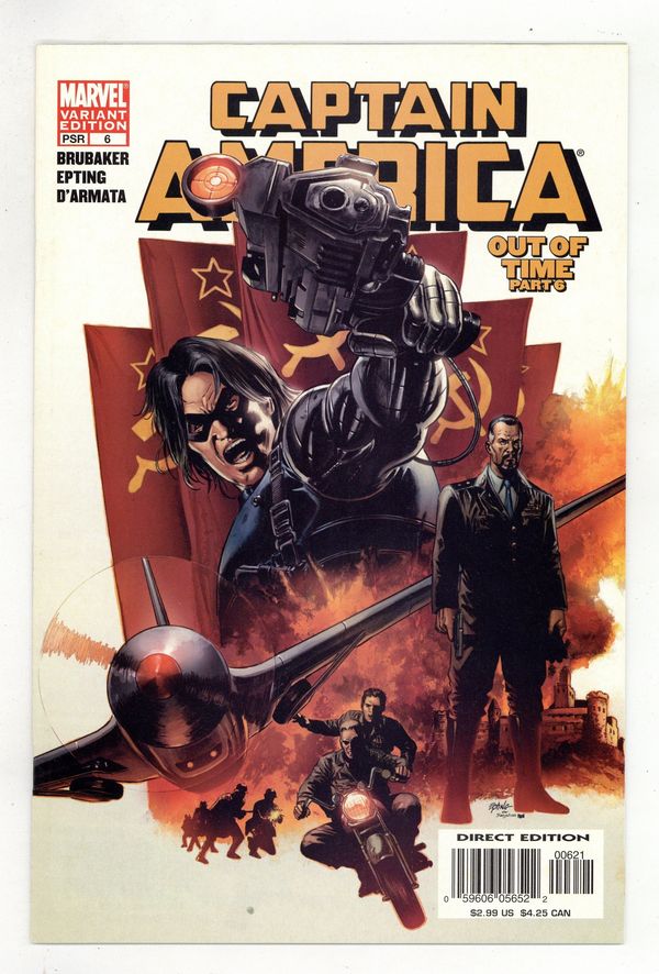 $75.001st Full App. of Winter Soldier. Winter Soldier Cover - Winter Soldier: Part 1.6 - Out of Time: Part 6 of 6 - Written by Ed Brubaker. Pencils & Cover by Steve Epting. "OUT OF TIME" Finale Who killed the Red Skull? Who is the mystery assassin we have yet to see? This issue answers those questions and more! The hunt for the killer of the Red Skull takes a bizarre turn and Steve Rogers' life turns with it. Shattered fragments of Cap's past are called into question by new memories that keep flooding his mind. Is someone playing mind games with him, or has he been in the dark about certain events for years? Only a trip to the scene of his most devastating failure will answer that question. Part 6 (of 6). 32 PGS./Marvel PSR ...$2.99 Cover price $2.99.
