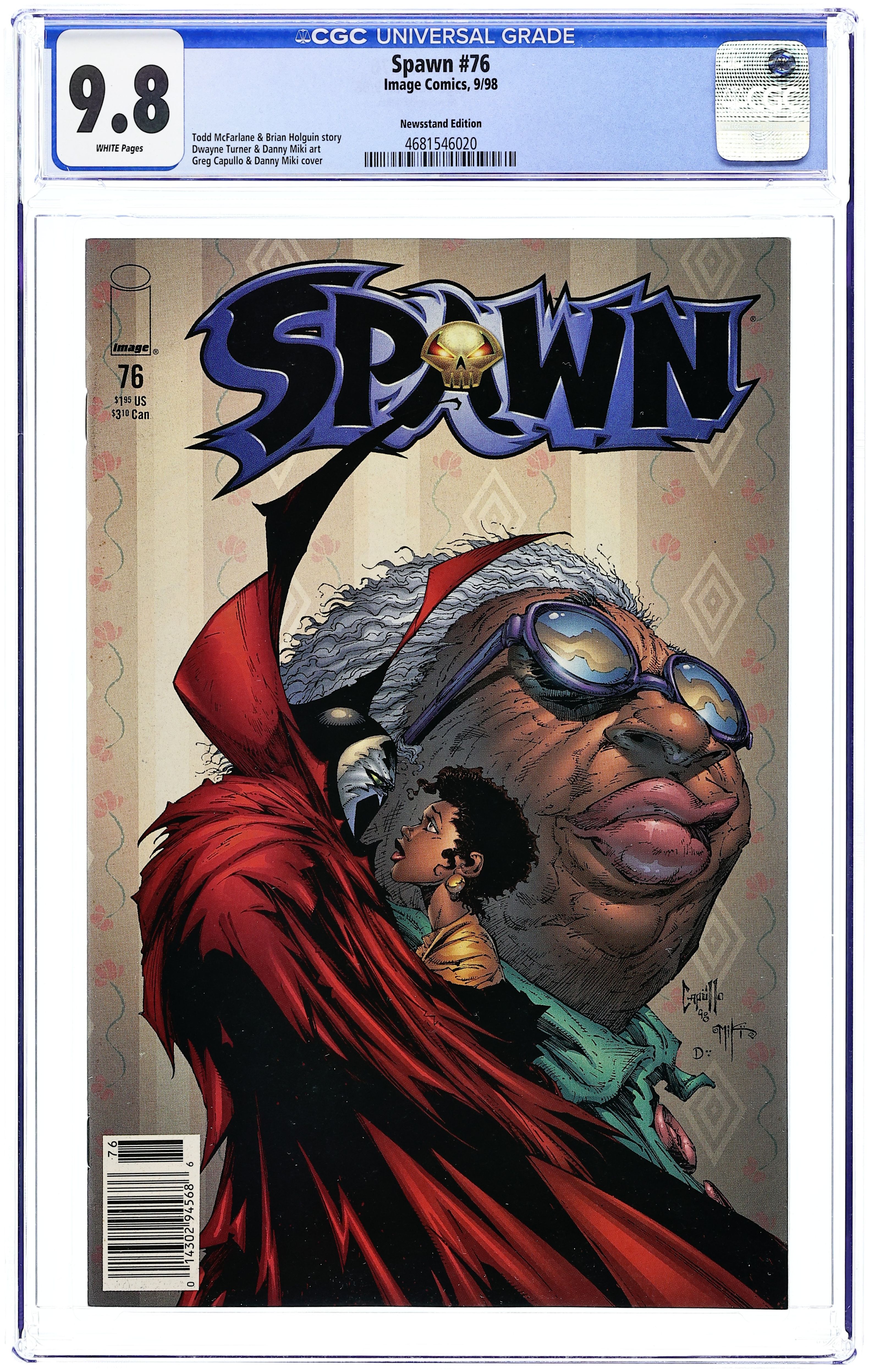 Newsstand Edition. "Farewell Dance!" Written by Todd McFarlane and Brian Holguin. Art by Dwayne Turner and Danny Miki. Cover by Greg Capullo and Danny Miki. Spawn meets Granny Jake in the cemetery at the grave sight of her beloved husband Jack. There, Granny tells Al about her courtship and marriage to Jack. Al then takes Granny back in time and across another dimension to once again see and hold Jack. Afterwards Granny advices Al to let go of Wanda for now assuring him that they will be together forever because they are soul mates. 32 pages, FC. NOTE: This issue is dedicated to Korn. Cover price $1.95.