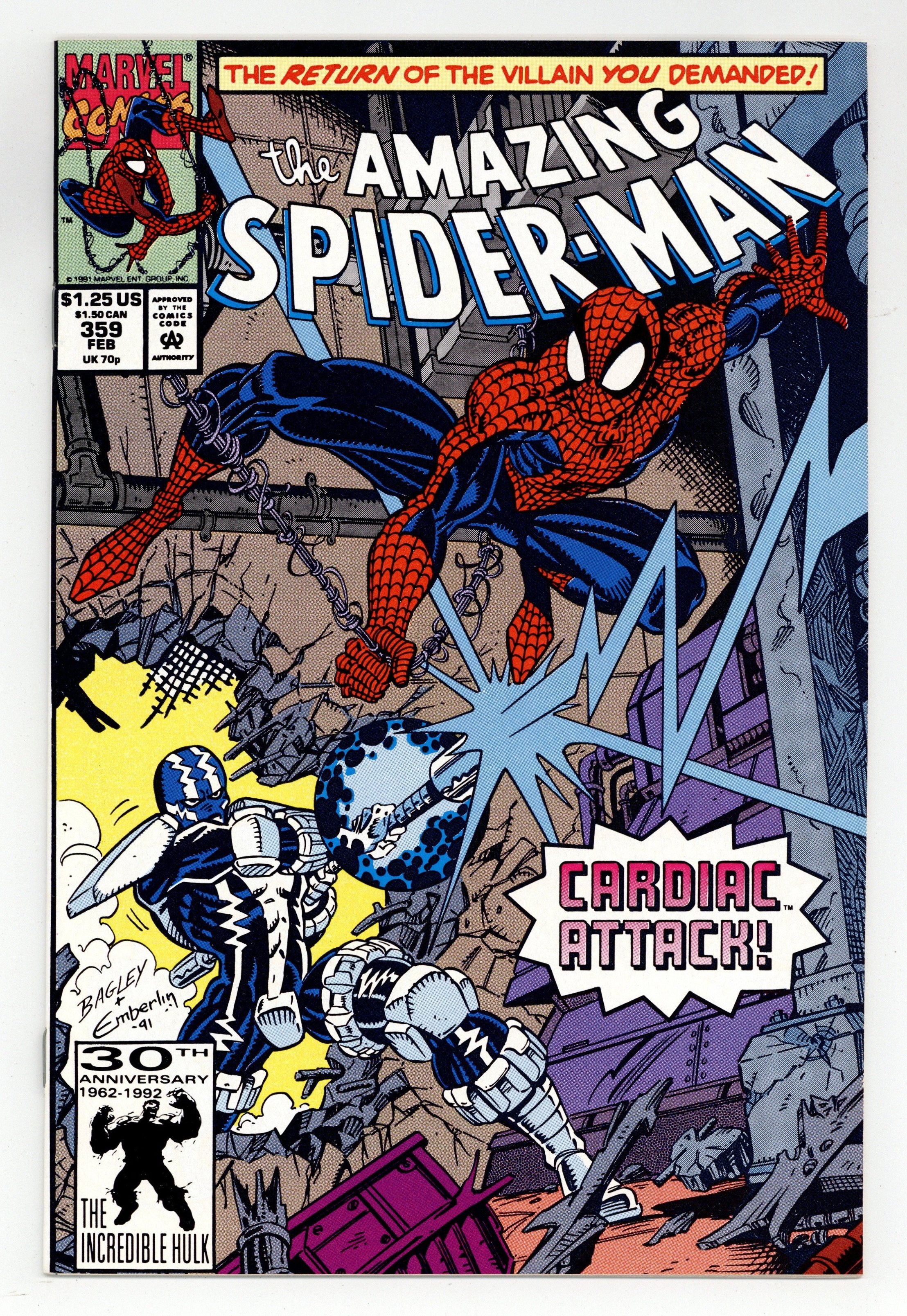 Tags: Marvel Legacy Numbering: Amazing Spider-Man (part 359), Spider-Man$14.25Direct Edition. First $1.25 cover price. "Toy Death!" Part 1 of 2. Script by David Michelinie. Pencils by Chris Marrinan. Inks by Keith Williams. Cover by Mark Bagley and Randy Emberlin. Cardiac is back! And bringing his own brand of justice to the Big Apple! Each day Dr. Elias Wirtham reads the latest corporate exposé in the Daily Bugle...and then goes after that company the following night! But Ben Urich and Peter Parker have caught on to Cardiac's pattern! So the next evening the web-slinger hides away in the manufacturing plant of a corrupt toymaker! Waiting for his very own...Cardiac attack! Cameo appearances by Cletus Kasady, Mary Jane Watson, Flash Thompson, J. Jonah Jameson, and the Black Cat. First $1.25 issue. (Note: The letters page previews the cover to Amazing Spider-Man 361.) 36 pages. Cover price $1.25.