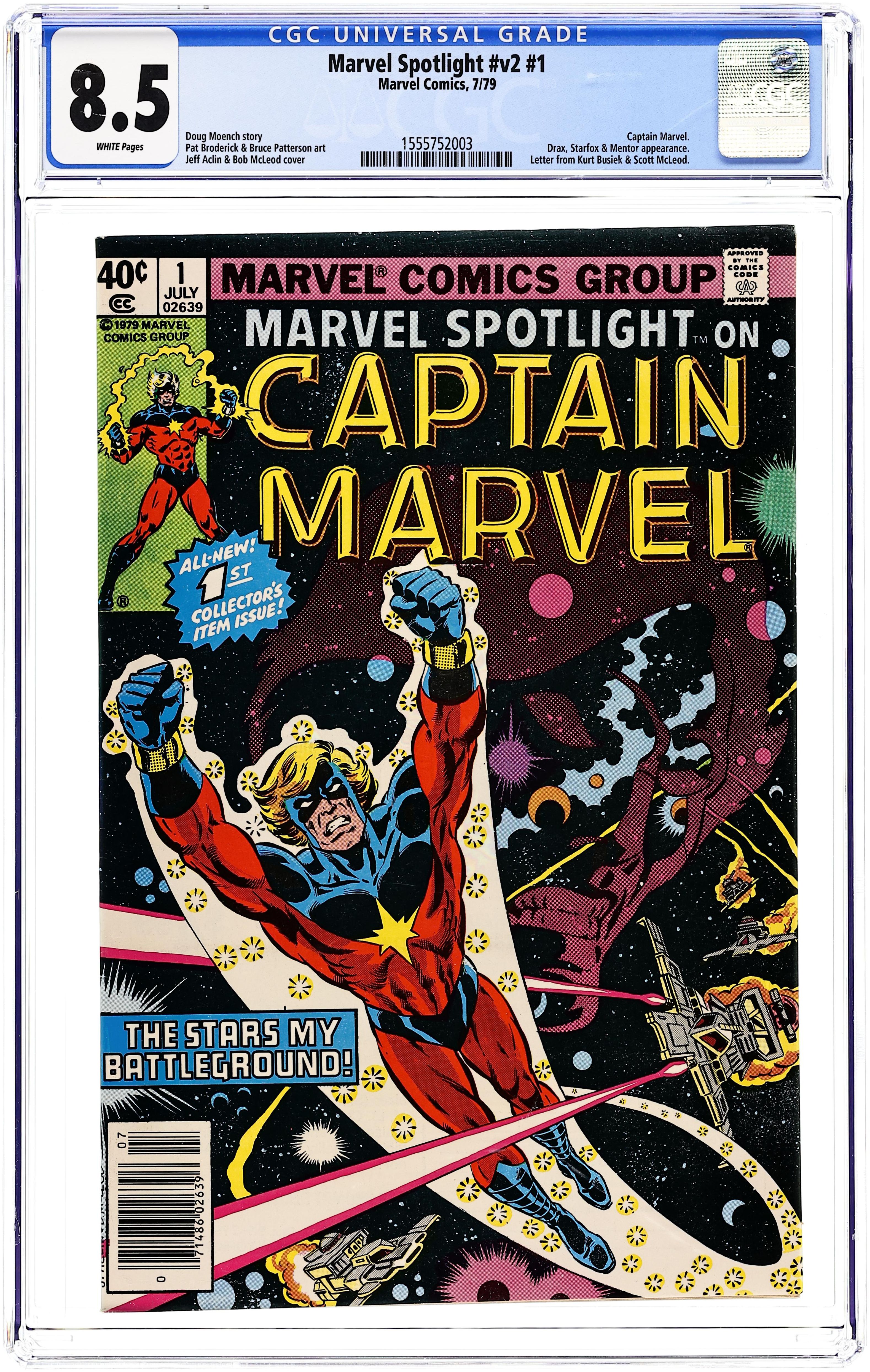 Standard Newsstand Edition. Marvel Spotlight on Captain Marvel - Return to Titan: part 1 of 2 - "The Saturn Storm!" Guest-starring Drax the Destroyer. Starfox cameo. Written by Doug Moench. Art by Pat Broderick and Bruce Patterson. Cover by J. Aclin and Bob McLeod. MAR-VELL - an alien warrior of the ancient Kree race! With powers given him as Protector of the Universe, he seeks to defend Earth, the planet he has made his own! Picking up after the events of Captain Marvel (1968-1979 1st Series Marvel) #62, Mar-Vell, Rick Jones, Gertie and Drax the Destroyer head to the Saturn moon of Titan and comer under siege. What power in the galaxy could have possibly humbled the Eternals of Titan? The answer may prove to be the good Captain's end. 32 pages, FC. Cover price $0.40.