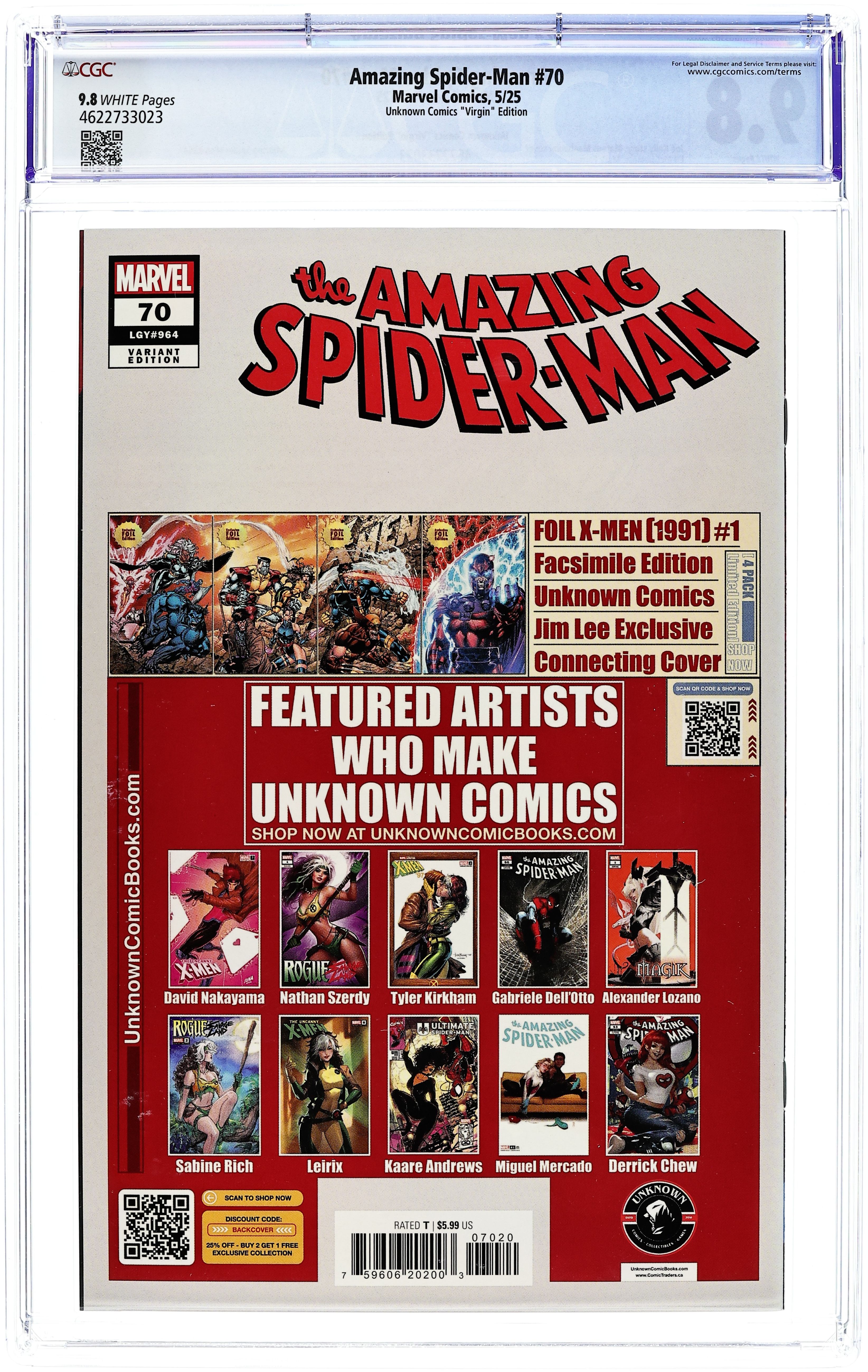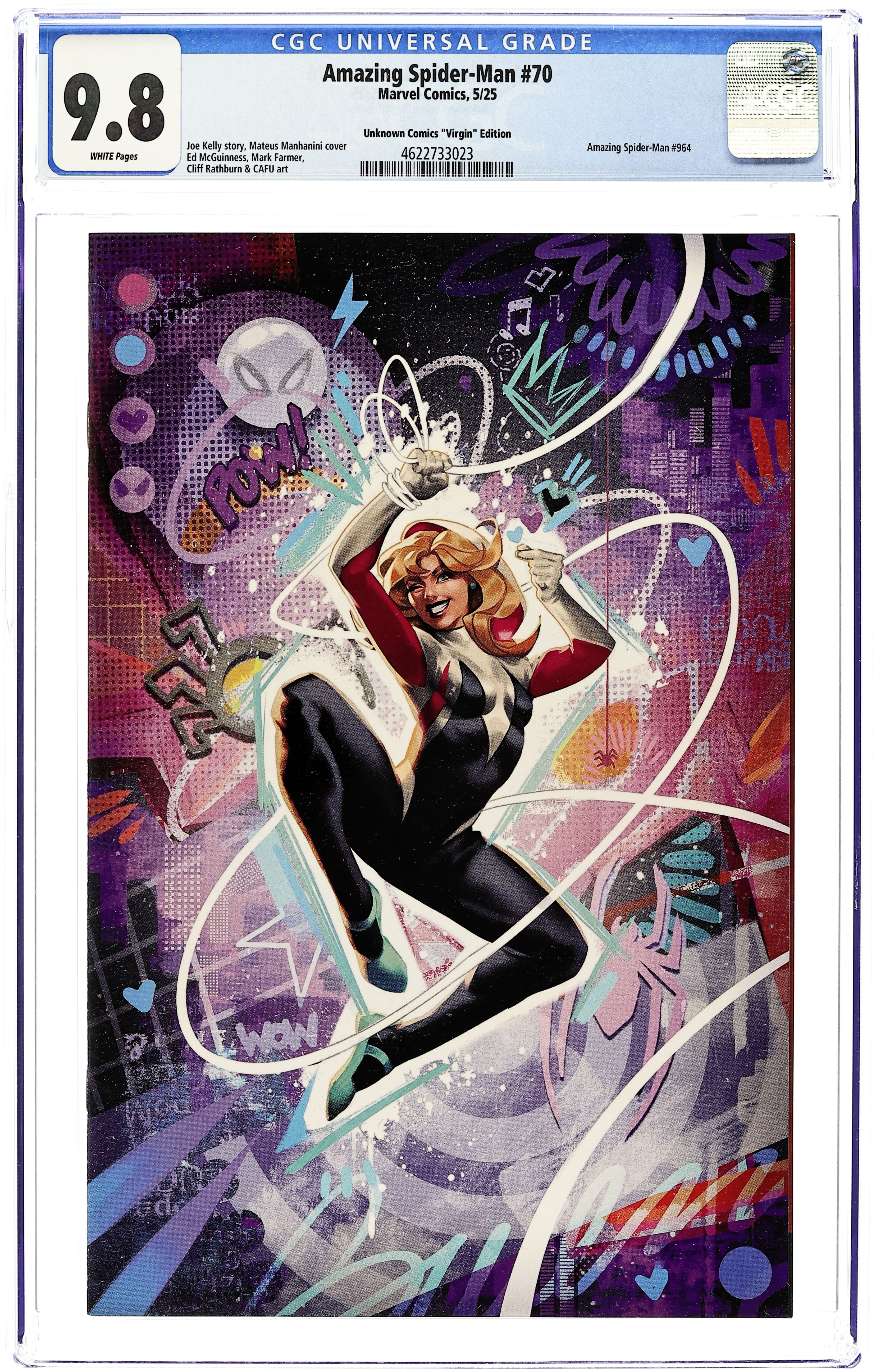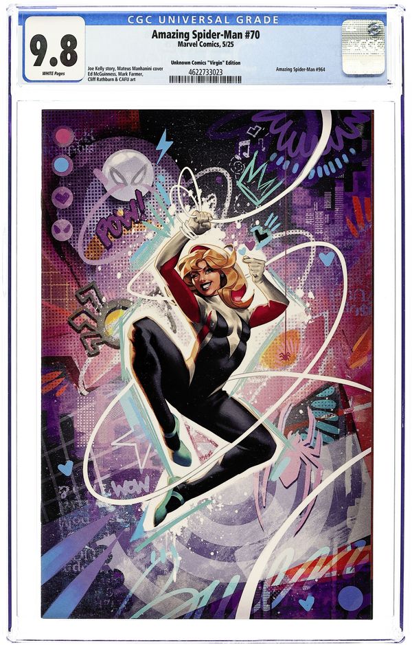 Unknown Comic Books Exclusive Virgin Cover by Mateus Manhanini. Written by Joe Kelly. Art by Ed McGuinness. THE 8 DEATHS OF SPIDER-MAN CONCLUDES! ENTER THE SPIDER-NAUT! But who is this unstoppable webbed-wonder?! 40 pages, full color. Rated T Cover price $5.99.