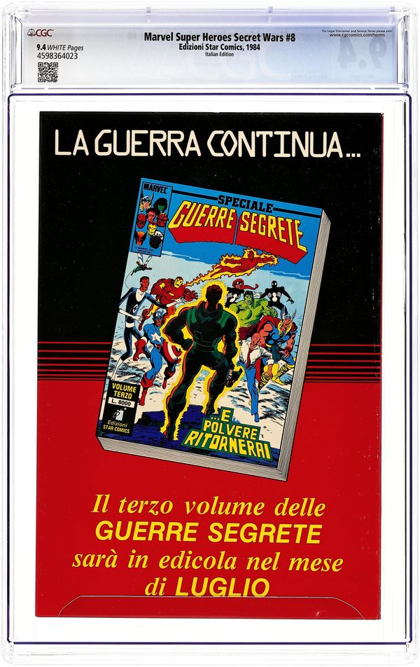 Italian Reprint Series. Reprints Marvel Super Heroes Secret Wars (1984) #5-#8. Reprints the Cover of Marvel Super Heroes Secret Wars (1984) #8. Story by Jim Shooter. Cover and Art by Mike Zeck and John Beatty. Squarebound.