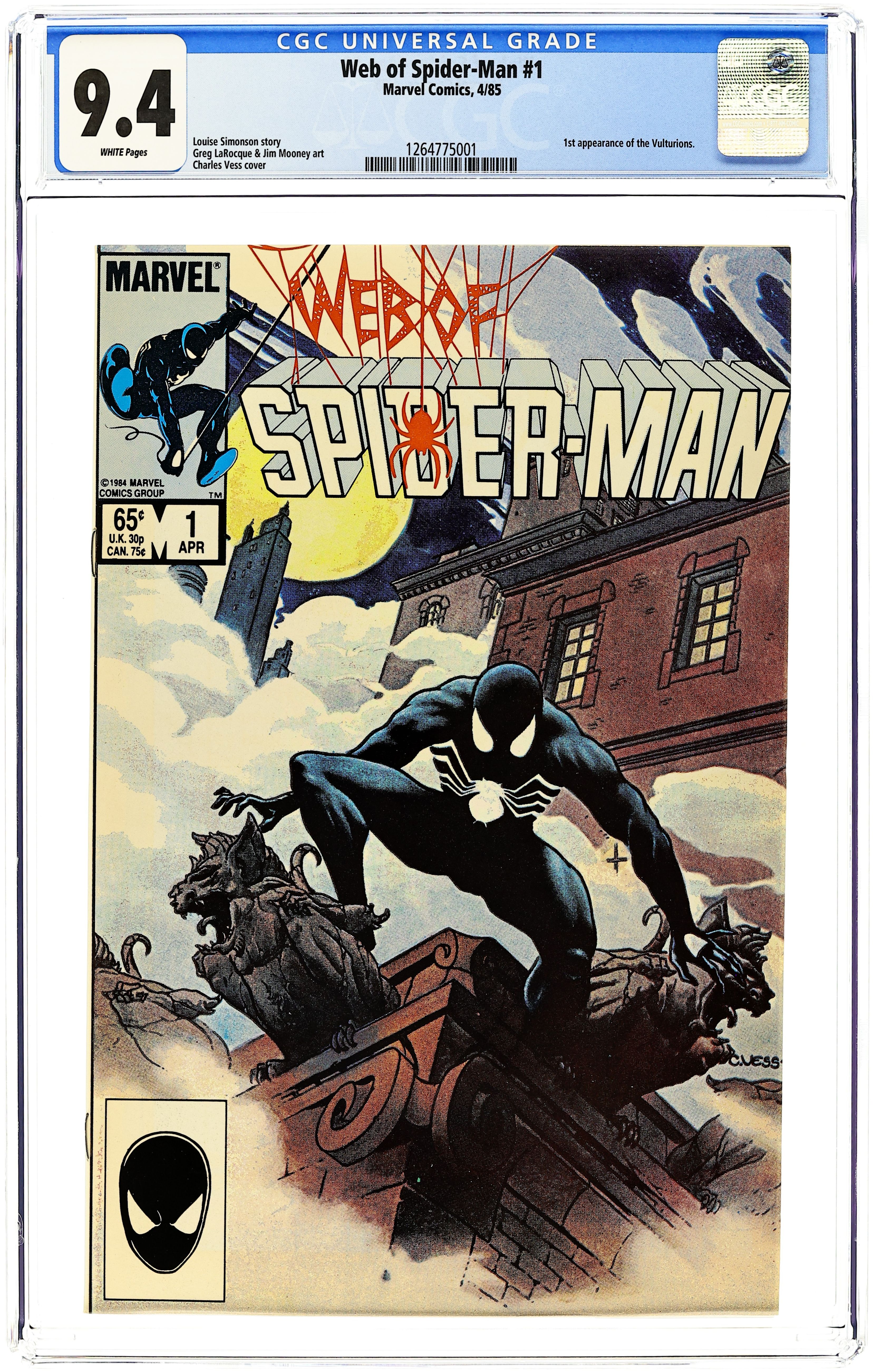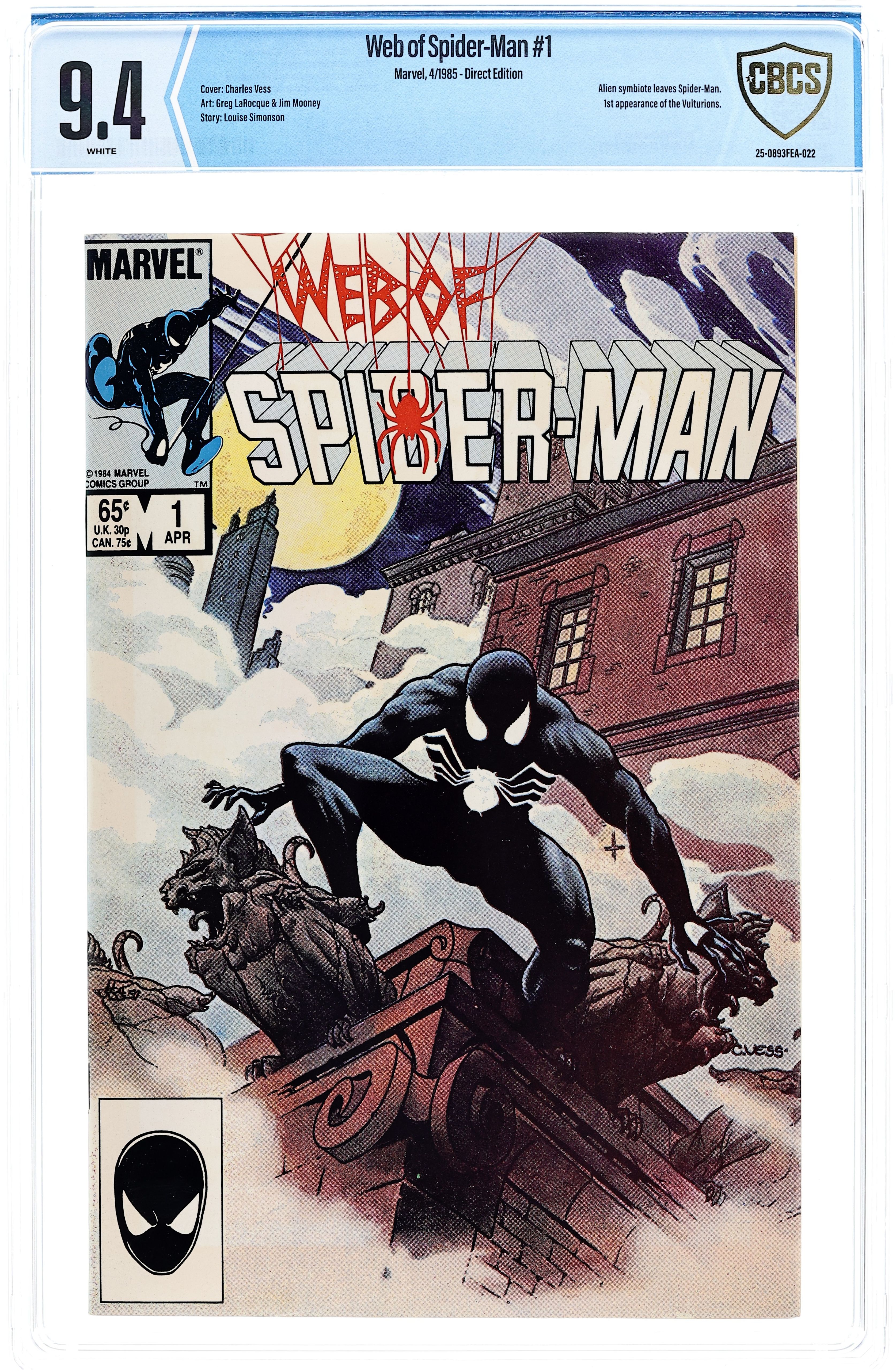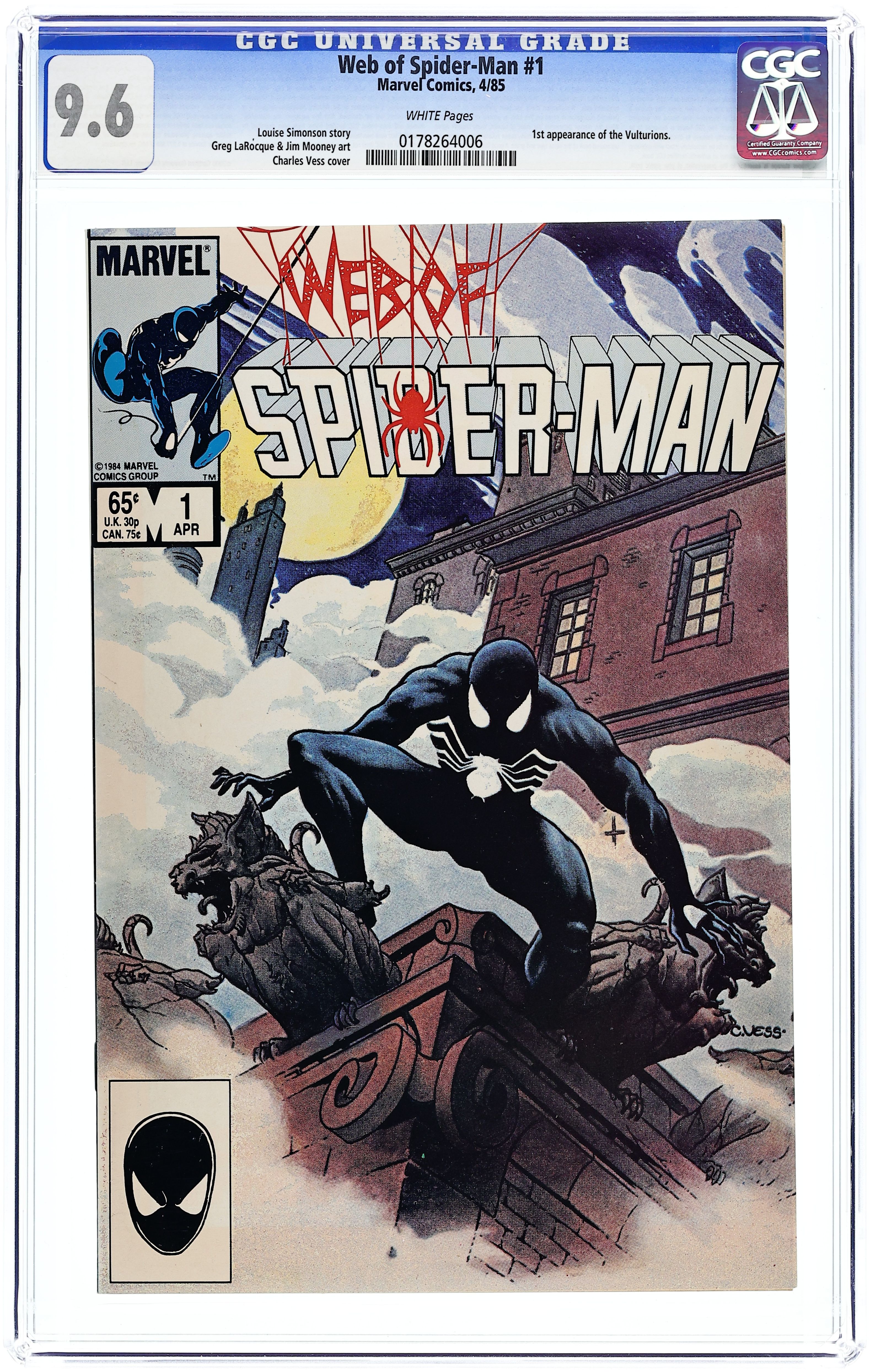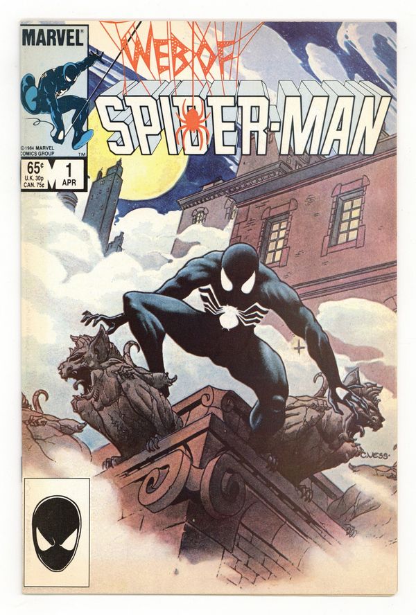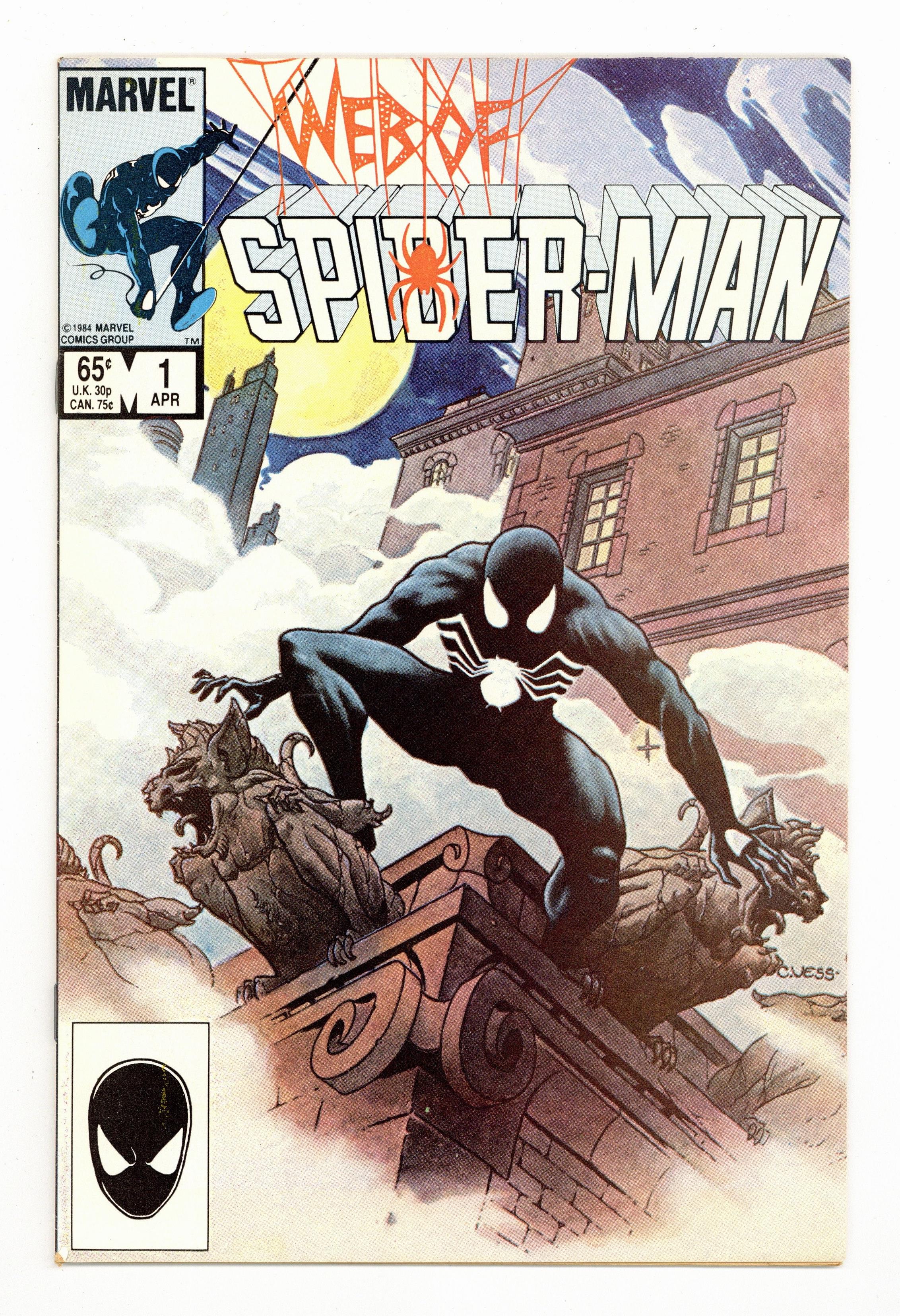 Ends Dec 8 10:05 PM CST Bid History 5 bids Current Bid $121 Your Secret Max Bid If you'd like to bid, please log in or register. Direct Edition. "Til Death Do Us Part!" Story by Louise Simonson. Art by Greg LaRocque and Jim Mooney. Painted cover by Charles Vess. The alien symbiote (aka black costume) ambushes Peter Parker while he is getting dressed. Now Spider-Man must battle the black costume and the new Vulturions on his way to the Baxter Building! Meanwhile, Aunt May laments Peter's decision to drop out of graduate school. (Note: The Web of Spiderman series essentially replaced the Marvel Team-Up title as Marvel's third regular series featuring Spider-Man.) 32 pages Cover price $0.65.