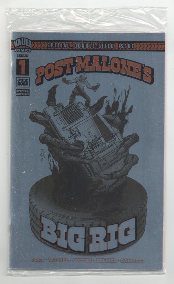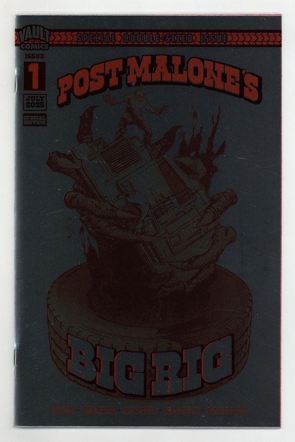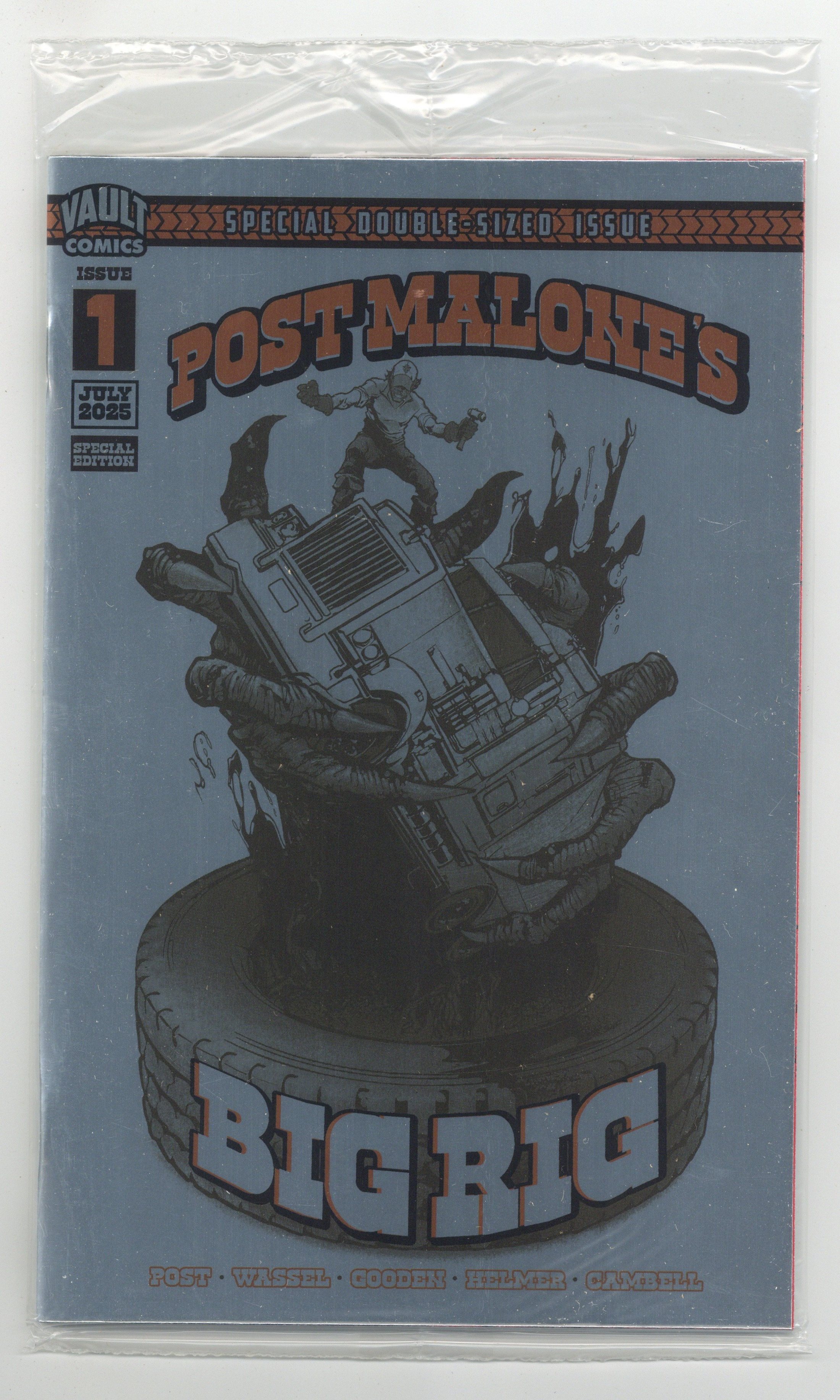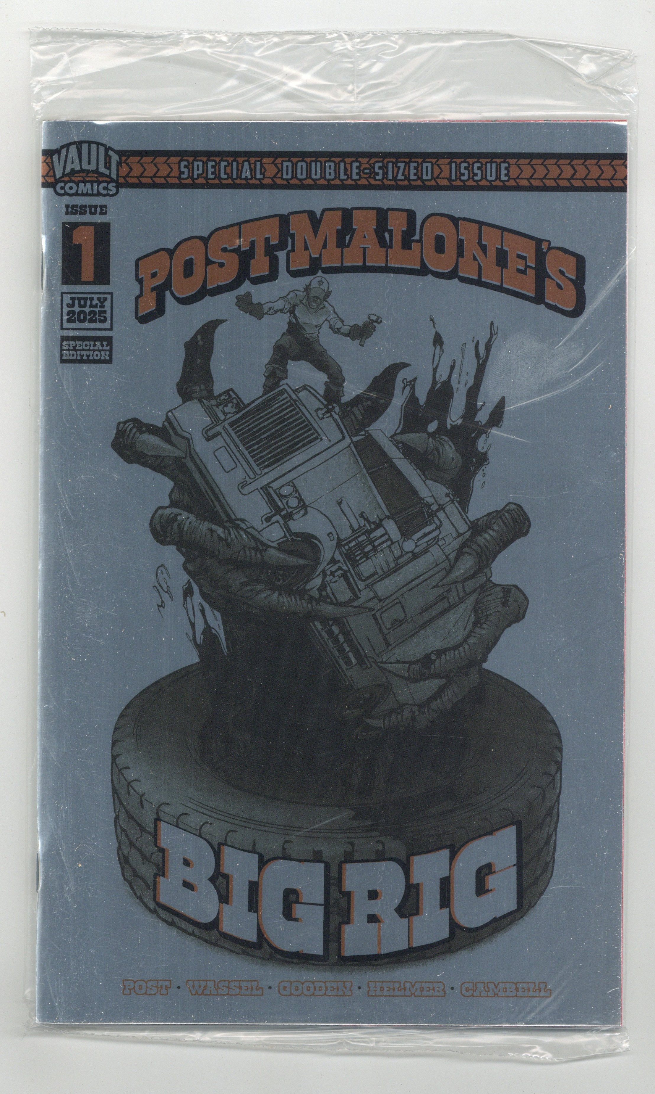 2nd Printing. Foil Edition Variant Cover by Nathan Gooden and Adam Cahoon. Written by Adrian Wassel, Post Malone. Art by Nathan Gooden. Double-length — collects chapters 1 & 2! Post Malones BIG RIG. THEY PRAYED FOR A MIRACLE. THEY GOT 25 TONS AND 18 WHEELS OF HOLY WEAPON. The Dark Ages…Demon hordes plague Europe as Hell invades Earth. The Six Petals, a secret sect of The Knights Templar, are in desperate need of a means to drive back the scourge and turn the tide of the onslaught. What crashes to earth is The Rig, a fully loaded tractor trailer. In the aftermath of its arrival, the only man left standing is an enigmatic former priest excommunicated from The Six Petals. He will become Trucker and lead the fight against Hell behind the wheel of a demon-slaying machine. Created by Post Malone. Written by Post Malone and Adrian Wassel. Drawn by Barbaric co-creator and Dark Knights of Steel artist Nathan Gooden. 48 pages, PC/B&W.