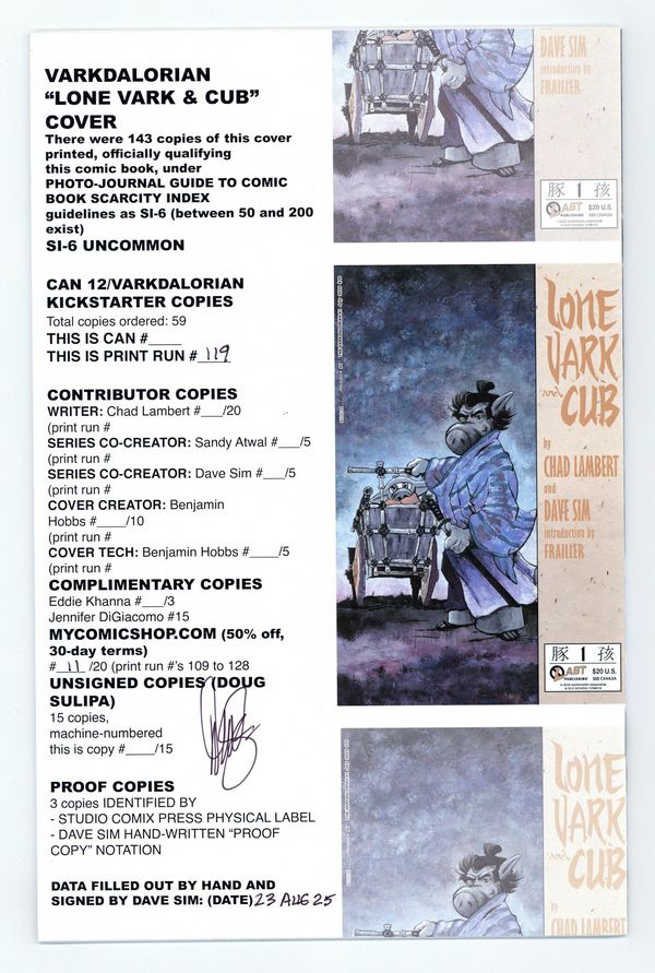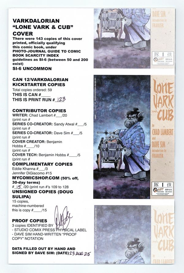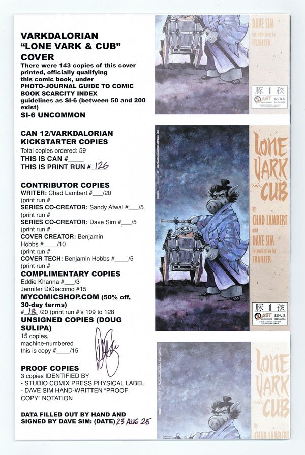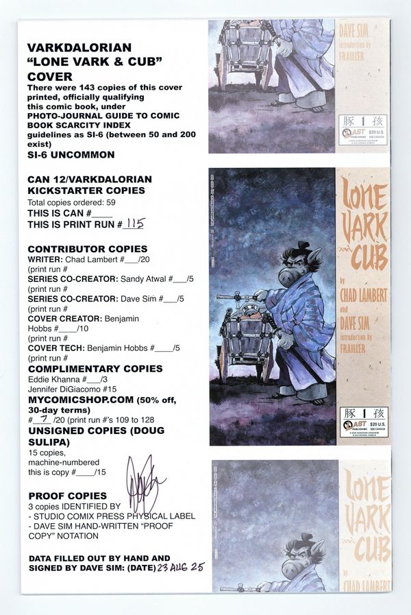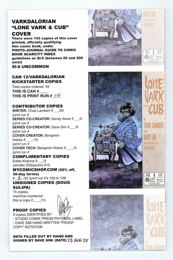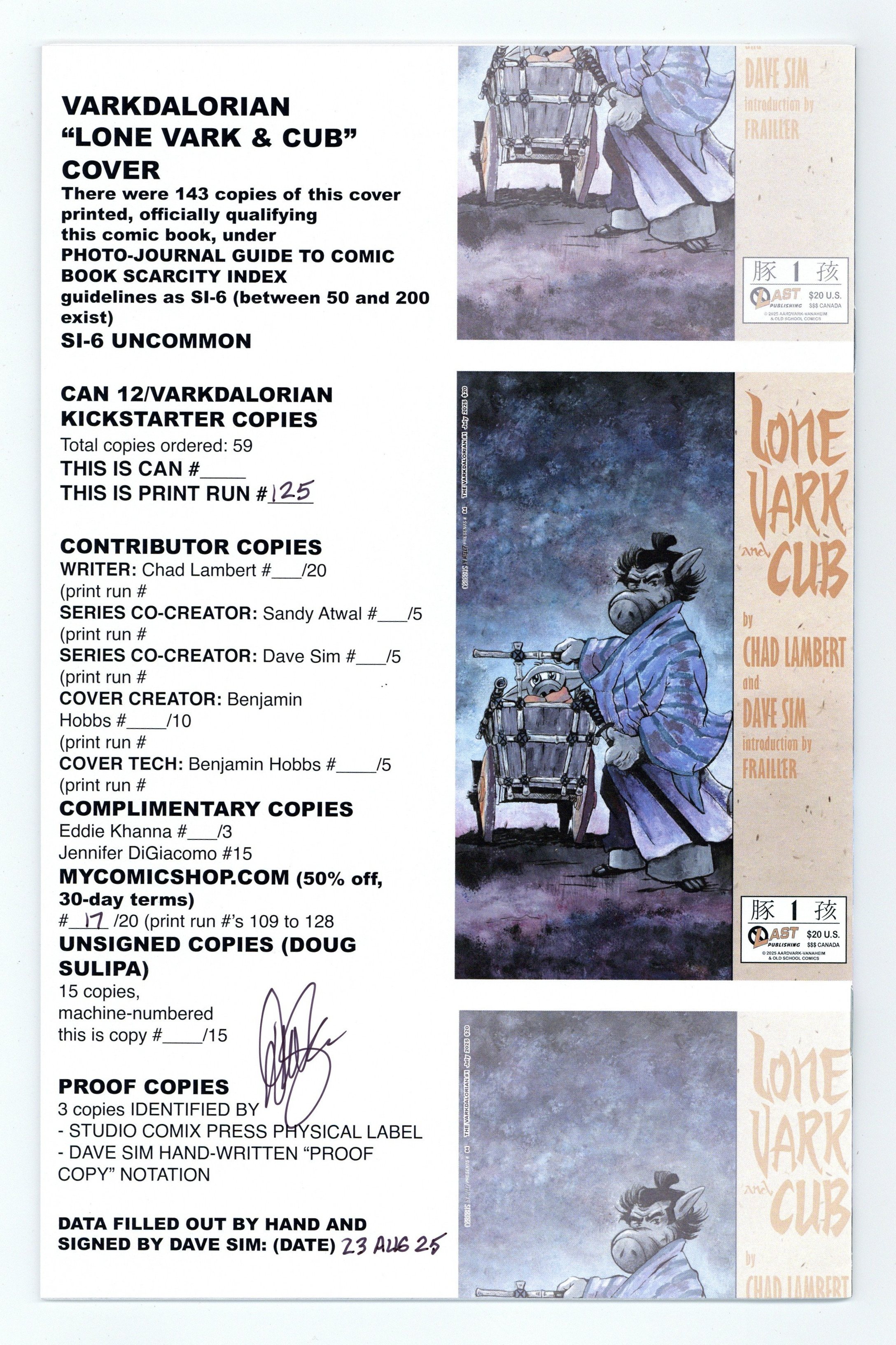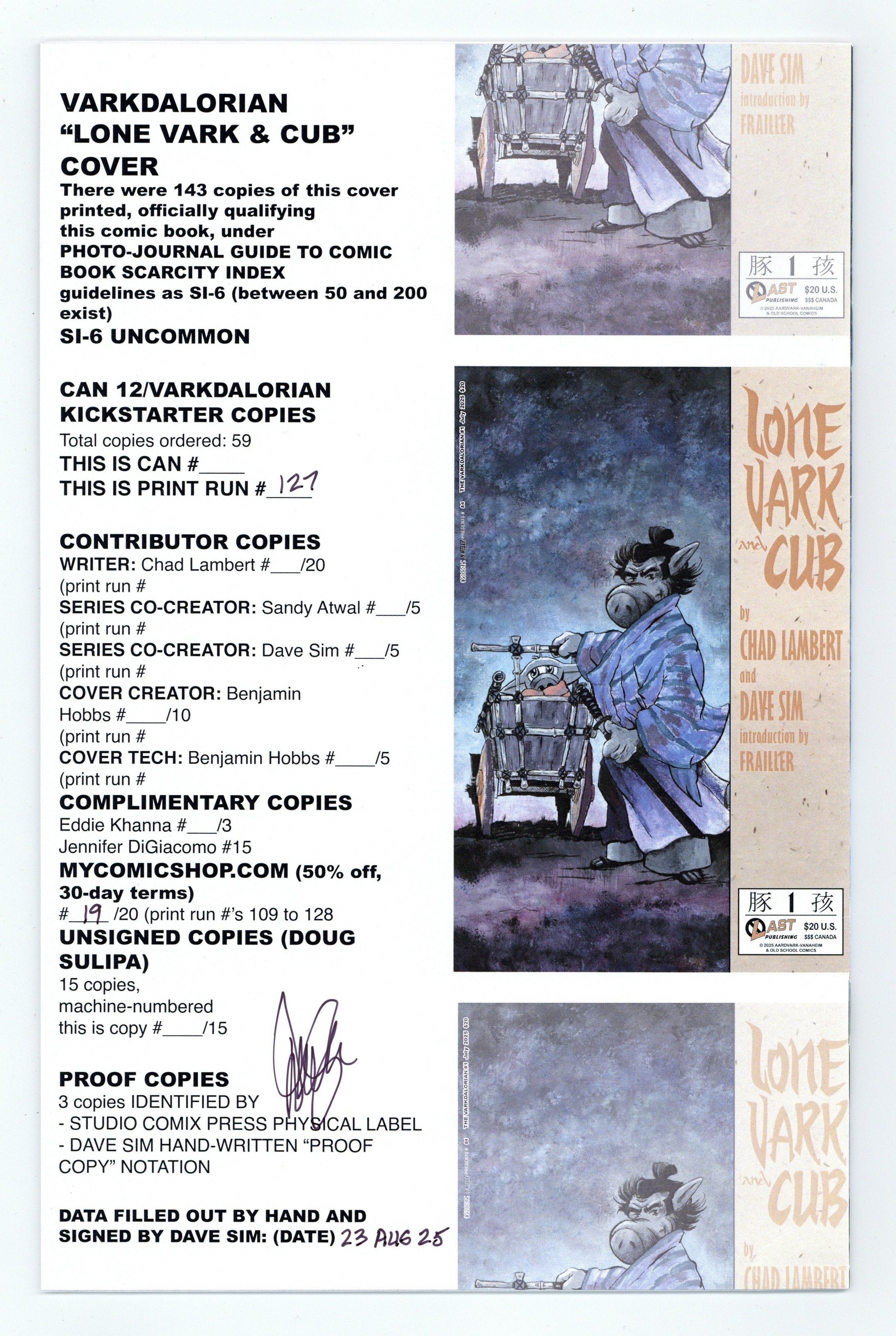 Published Aug 2025 by Aardvark-Vanaheim.$20.00Offered previously on Kickstarter, all copies signed and numbered by Dave Sim! Limited to ONLY 143 copies! Written by Chad Lambert. Art by Dave Sim. Cerebus in Hell? issue 84 raids the load pans of two mostly famous sci-fi franchises and one long forgotten, but still hazily remembered 1970s television program (everybody remembers the lovely ladies). SWKRPST, indeed. Sim and Birdsong admit they never read the comics or saw the show, but the young folks assure us that Lucasfilms TOTALLY ripped off Kazuo Koike and Goseki Kojima! We're taking it back! 24 Pgs, B&W. Cover price $20.00.