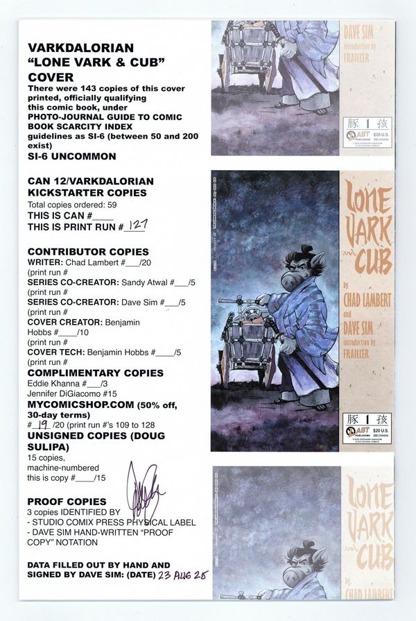 Published Aug 2025 by Aardvark-Vanaheim.$17.00Offered previously on Kickstarter, all copies signed and numbered by Dave Sim! Limited to ONLY 143 copies! Written by Chad Lambert. Art by Dave Sim. Cerebus in Hell? issue 84 raids the load pans of two mostly famous sci-fi franchises and one long forgotten, but still hazily remembered 1970s television program (everybody remembers the lovely ladies). SWKRPST, indeed. Sim and Birdsong admit they never read the comics or saw the show, but the young folks assure us that Lucasfilms TOTALLY ripped off Kazuo Koike and Goseki Kojima! We're taking it back! 24 Pgs, B&W. Cover price $20.00.
