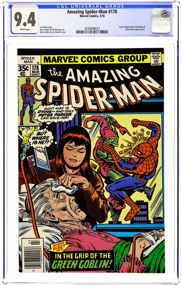 Starts Dec 15 The"Green Grows the Goblin!" Part 3 of 5. Script by Len Wein. Art by Ross Andru (breakdowns) and Jim Mooney (finishes). Cover by Ross Andru and Joe Sinnott. If a picture is worth a thousand words, then the frantic cover says it all! Aunt May lies near death in her hospital bed awaiting life-saving surgery! But the doctors can't operate until her next of kin (aka the wondrous wall-crawler) signs the consent forms! Oh no! Where is the web-slinger? Currently fighting for his own life vs. the Green Goblin! It's a painful predicament in more ways than one for the Spectacular Spider-Man! Cameo appearances by Silvermane, Glory Grant, Joe Robertson, J. Jonah Jameson, Anna Watson, and Harry Osborn. (Note: The letters page includes a statement of ownership: average print run 587,702; average paid circulation 281,860.) 36 pages. Cover price $0.35.