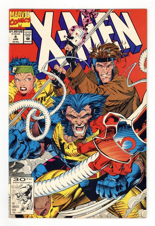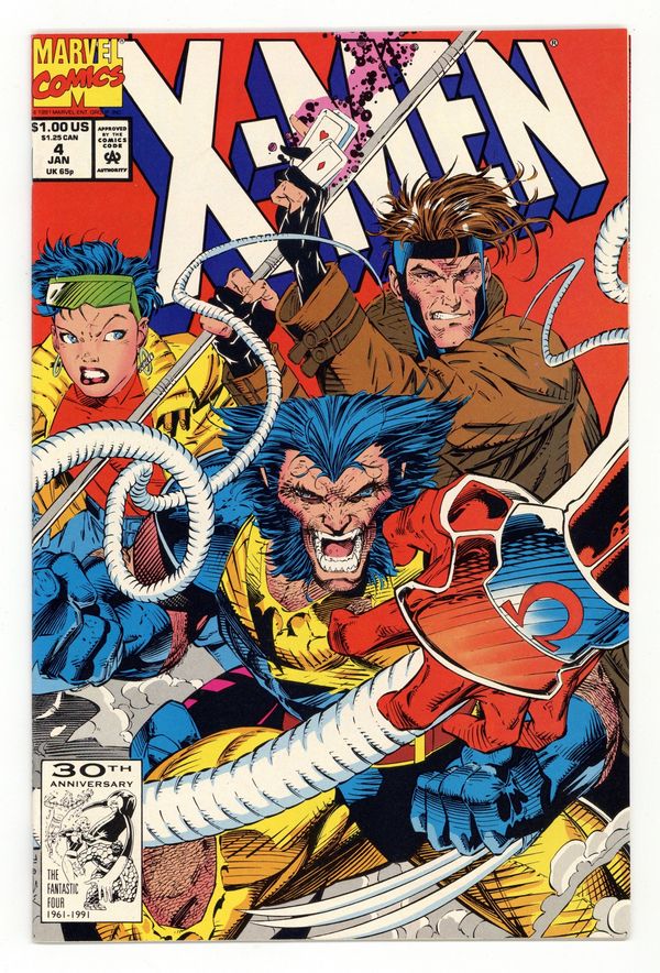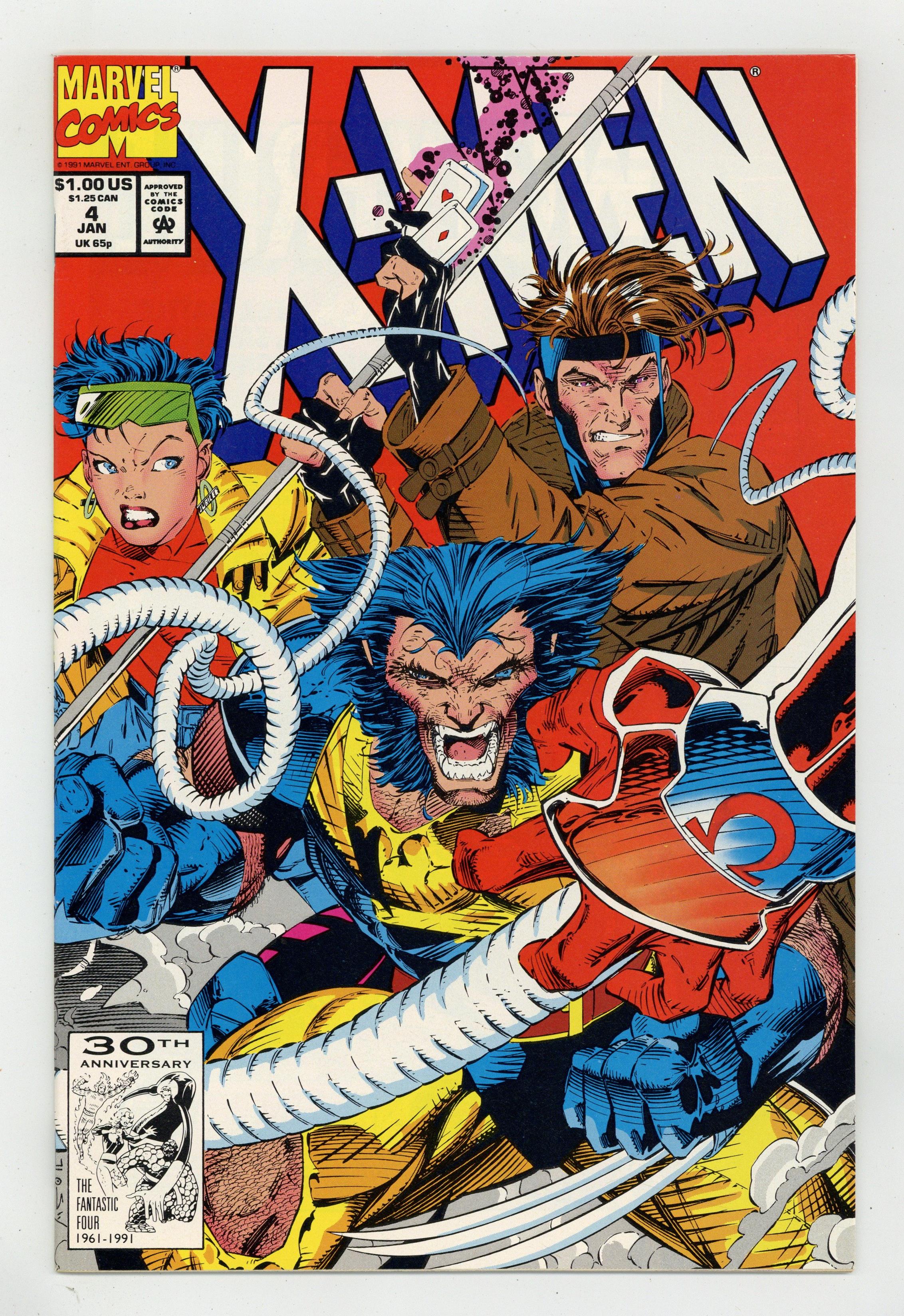 Starts Apr 20 Direct Edition. Cover pencils by Jim Lee, inks by Scott Williams. The Resurrection and the Flesh, script by Jim Lee (Plot) and John Byrne, pencils by Jim Lee, inks by Scott Williams. First appearance of Omega Red! The Hand brings Omega Red (formerly Arkady) back to life; The X-Men play basketball, mutant style; Moira agonizes over her part in the Magneto fiasco and leaves; Gambit and Rogue are on the way to a chaperoned date when Omega Red and the Hand interfere. Cover price $1.00.