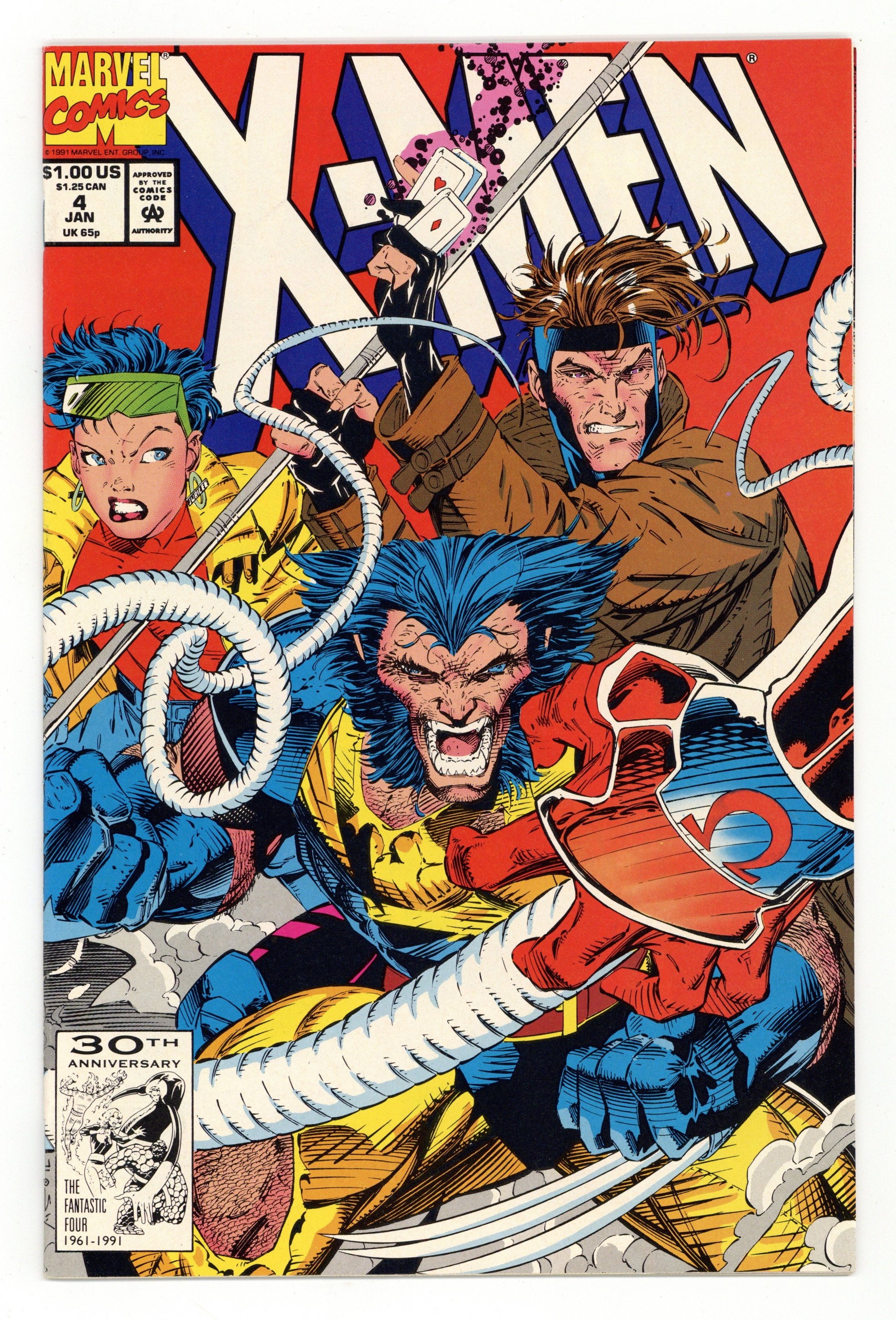 Starts Jul 4 Direct Edition. Cover pencils by Jim Lee, inks by Scott Williams. The Resurrection and the Flesh, script by Jim Lee (Plot) and John Byrne, pencils by Jim Lee, inks by Scott Williams. First appearance of Omega Red! The Hand brings Omega Red (formerly Arkady) back to life; The X-Men play basketball, mutant style; Moira agonizes over her part in the Magneto fiasco and leaves; Gambit and Rogue are on the way to a chaperoned date when Omega Red and the Hand interfere. Cover price $1.00.