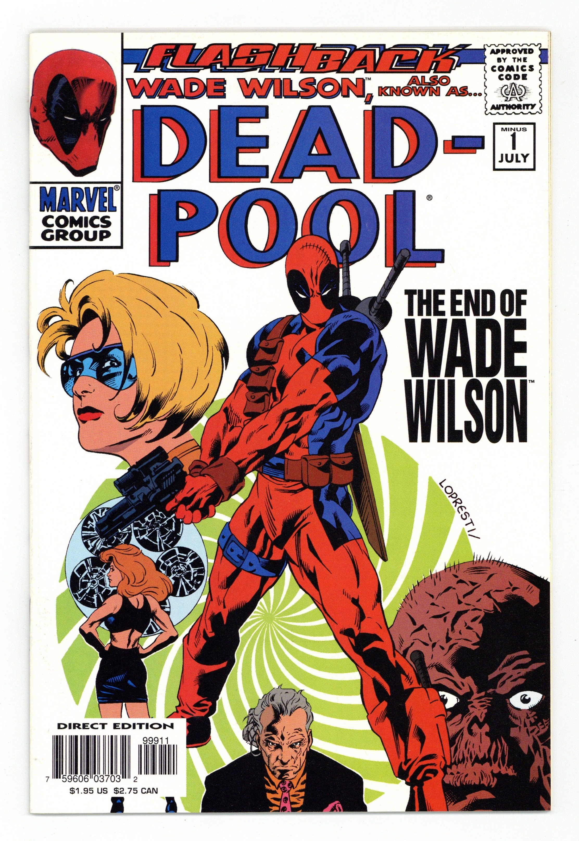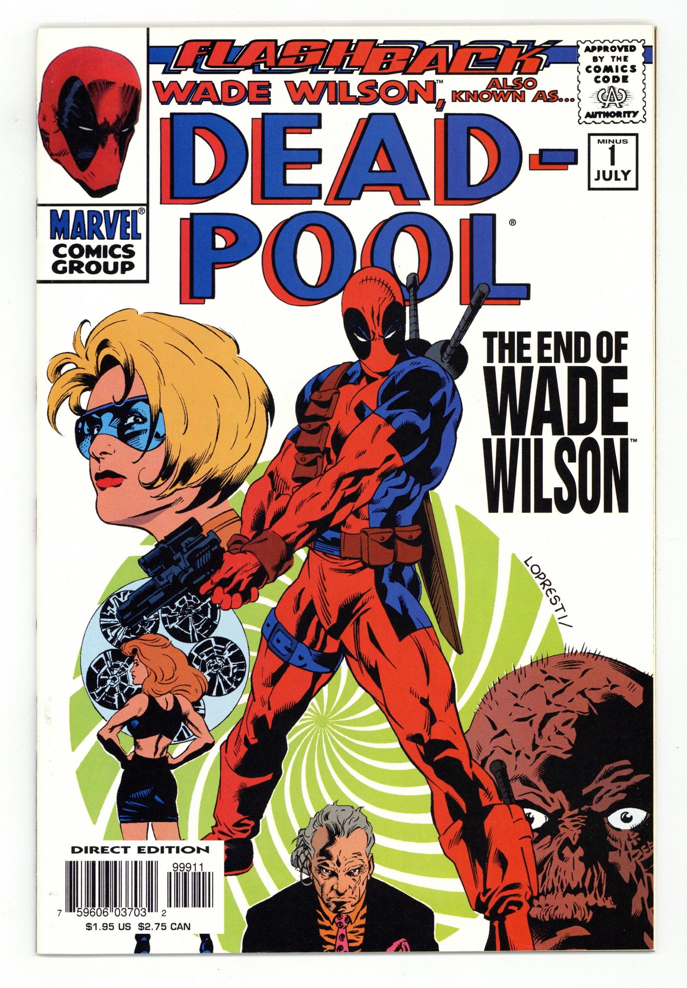 Paradigm Lost - Written by Joe Kelly. Art by Aaron Lopresti & Rachel Dodson. Cover pencils by Aaron Lopresti. Flashback! Before he became Deadpool, psycho killer, he was just Wade Wilson, psycho! Want to know when Landau, Luckman & Lake first started observing Wade? Be there for the pivotal moments that led to the creation of the fruitcake we like to call Deadpool! 40 pages, full color. Cover price $1.95.