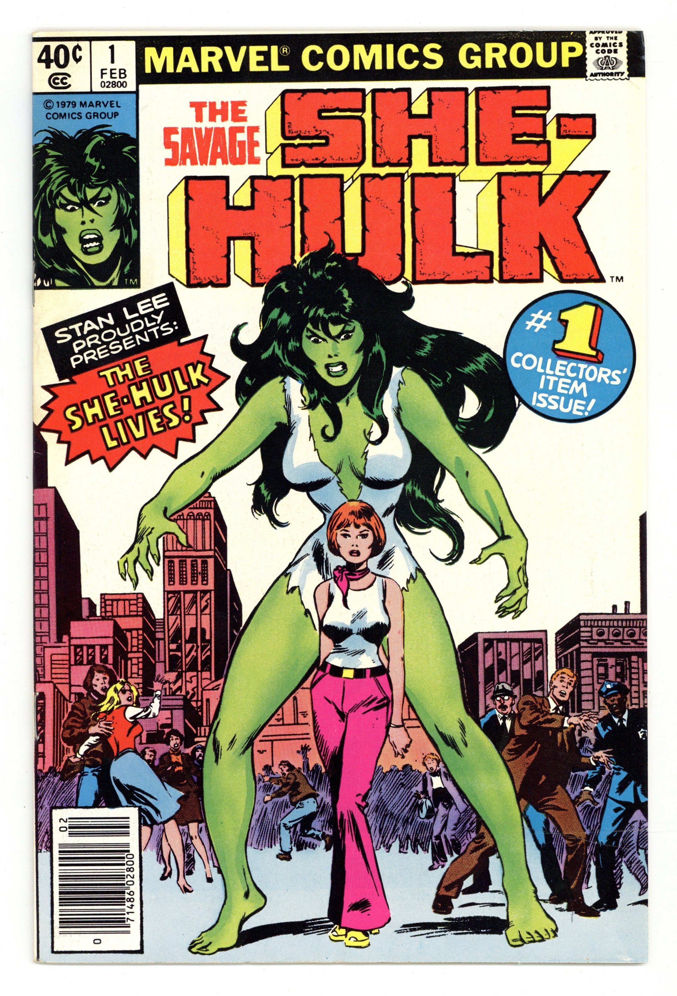 Tags: Marvel Legacy Numbering: She-Hulk (part 1)$75.00Newsstand Edition. 1st appearance and origin of the She Hulk. "The She-Hulk Lives!" Guest-starring Bruce Banner. Story by Stan Lee. Art by John Buscema and Chic Stone. Jennifer Walters is on the verge of death after an attempted assassination, and the only thing that will save her life is a blood transfusion from her cousin, Bruce Banner...AKA the Incredible Hulk! His gamma-irradiated blood sparks a startling transformation in his cousin, and she will forevermore be known as the Savage She-Hulk! Cover price $0.40.