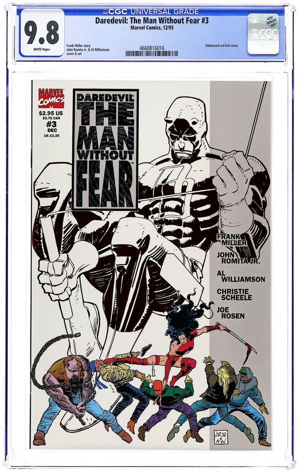 Matt's passion for Elektra blinds him (no pun intended) to the truth about her, Elektra's bloodlust has her take on 5 thugs alone, and Stick has a warning for Matt. Part 3 of 5. Script by Frank Miller, pencils by John Romita Jr., inks by Al Williamson. Romita Jr./Williamson cover. Red foil and embossed cover. Cover price $2.95.