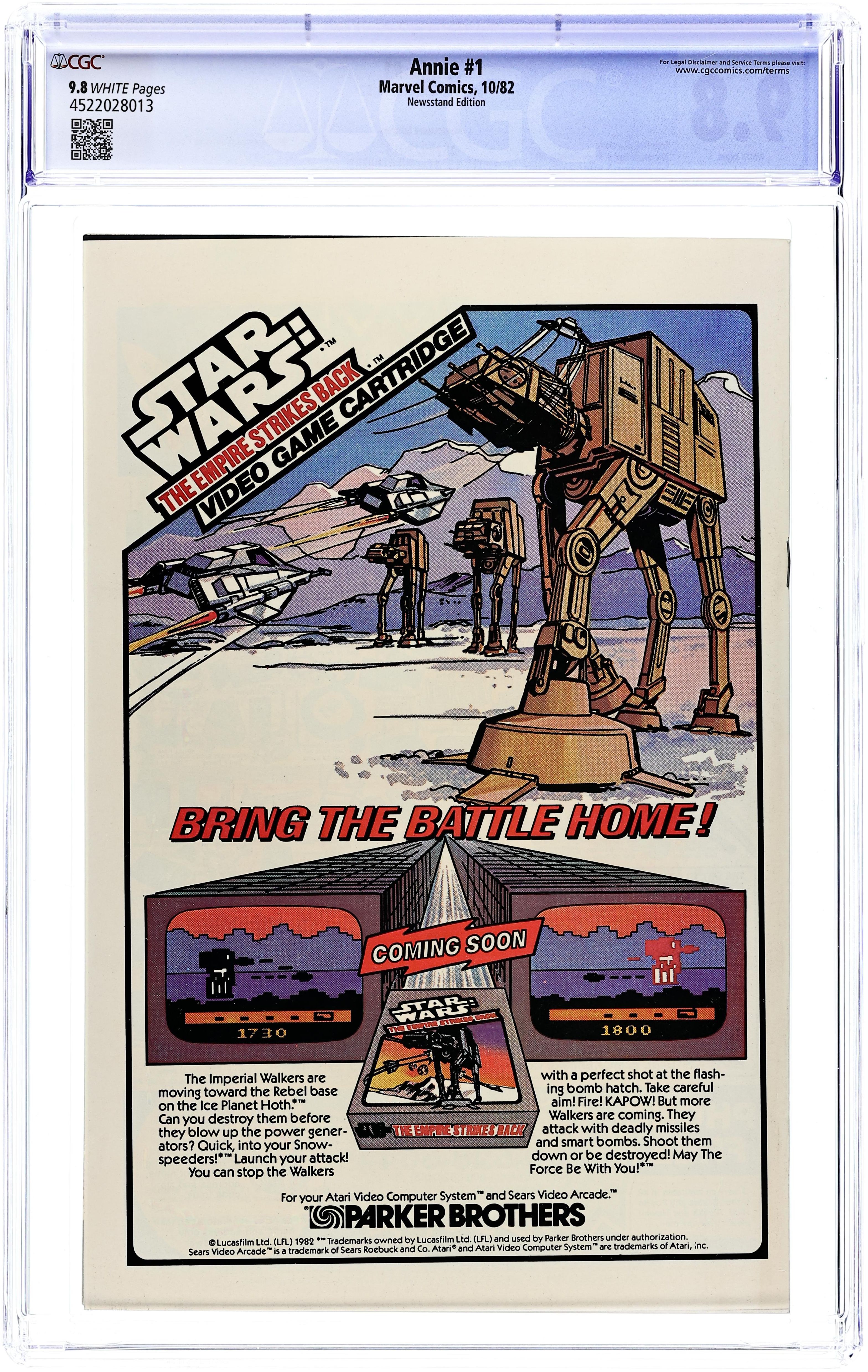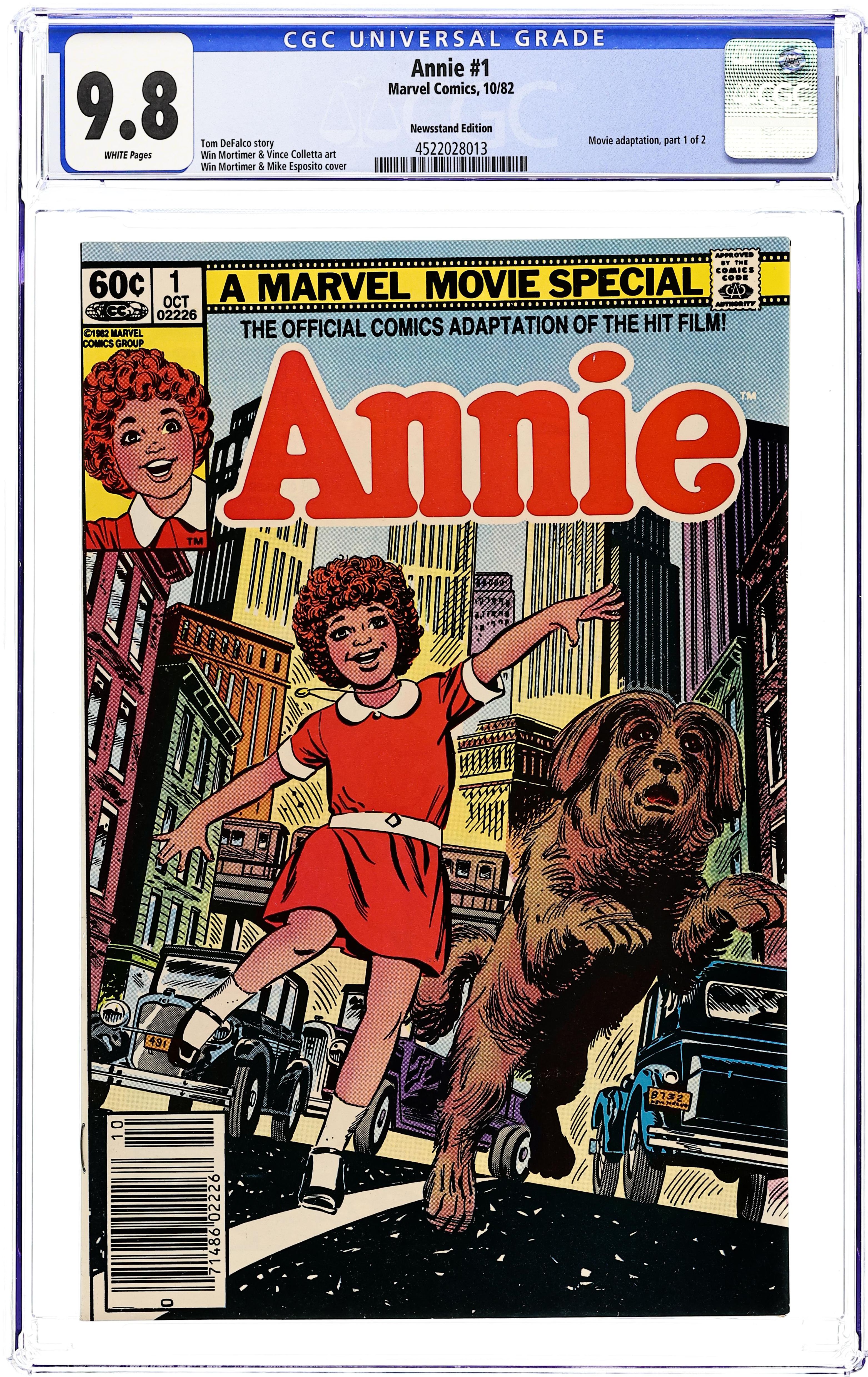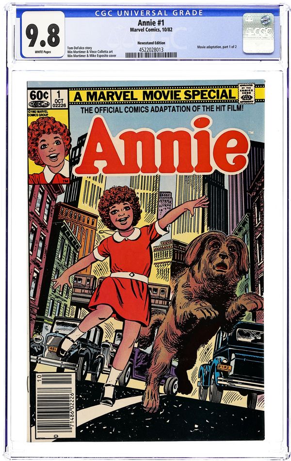 Newsstand Edition. Script by Tom DeFalco. Art by Win Mortimer & Vince Colletta. Cover by Win Mortimer and Mike Esposito. Marvel Comics' official comic adaptation of the 1982 movie "Annie." In this issue, Annie escapes from the Hudson Street Orphanage, run by the cruel and tyrannical Miss Hannigan, and explores New York City and adopts a dog that she names Sandy in part one of this adaptation. Cover price $0.60.