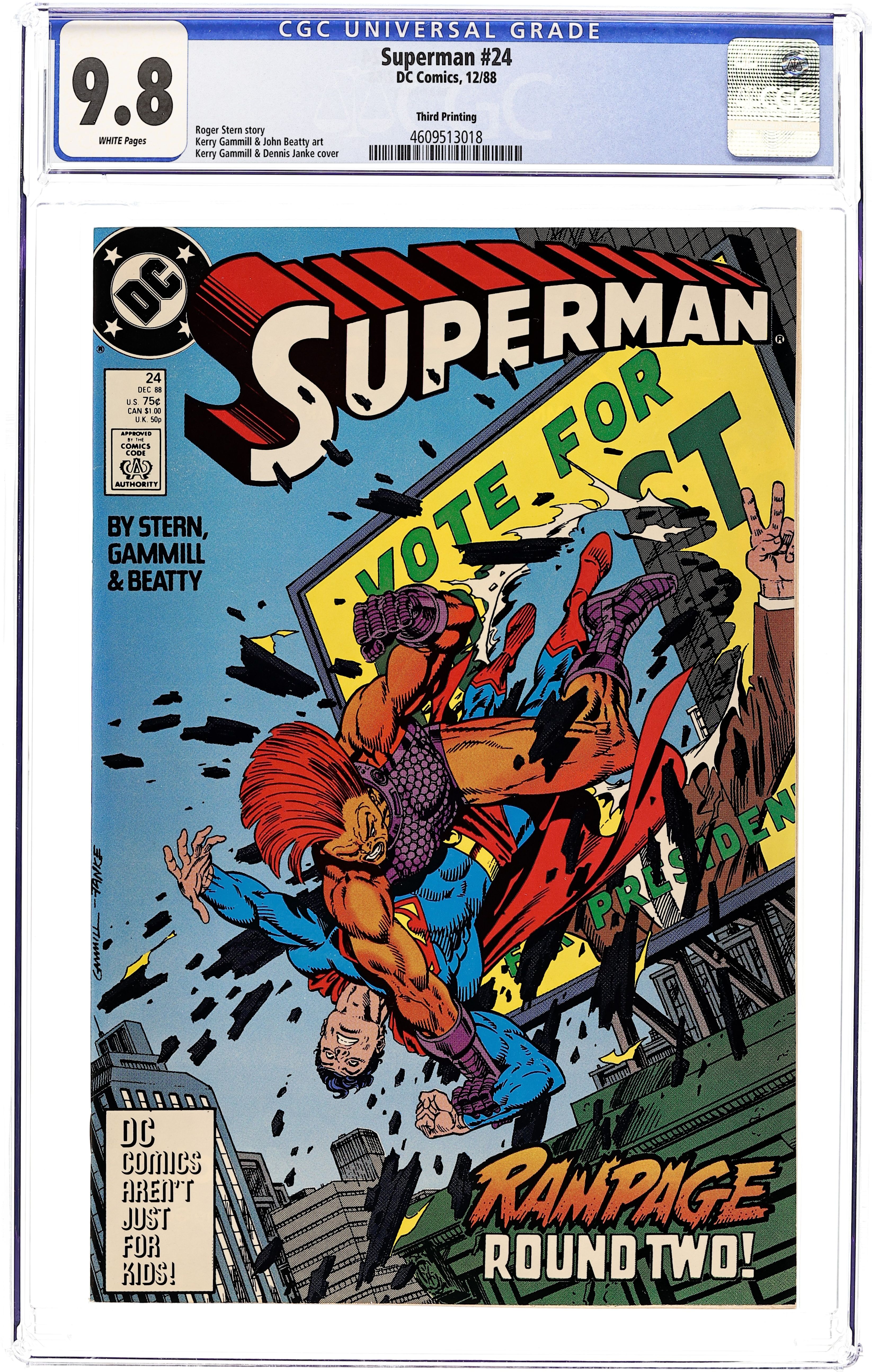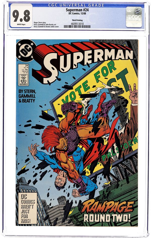 3rd Printing. "Power Politics!" Story by Roger Stern. Art by Kerry Gammill and John Beatty. A few months a go Dr. Kitty Faulkner was exposed to strange energy - energy that transformed her into the monstrous Rampage (see Superman (1987- ) #7). Now, a mad scientist bent on revenge, and a former colleague of Kitty's, will attempt to use her ailment for his own nefarious schemes. This looks like a job for Superman! Cover price $0.75.