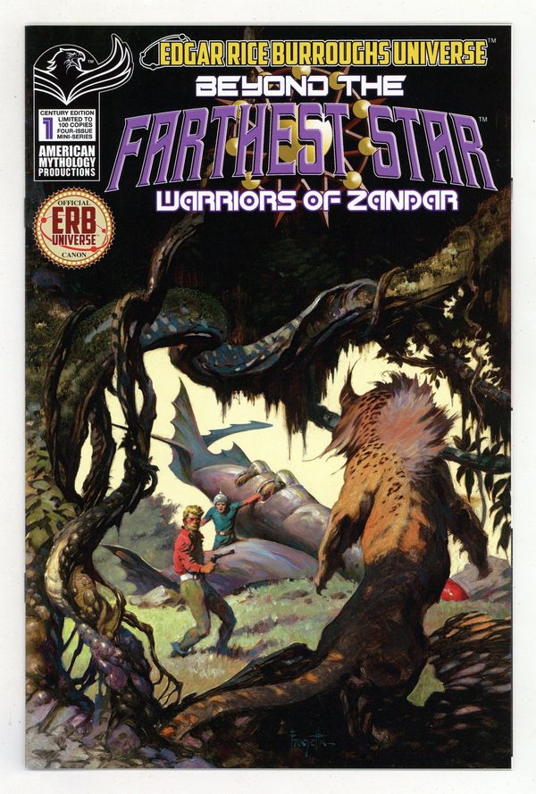 Published Aug 2021 by American Mythology.$16.00Century Edition Variant Cover by Frank Frazetta - limited to 100 copies. Written by Mike Wolfer. Art by Alessandro Ranaldi. Prepare to be transported across the galaxy to a world of incredible sci-fi adventure that lies Beyond the Farthest Star! In this canonical continuation of Edgar Rice Burroughs' classic novel, new ERB heroine Victory Harben finds herself stranded on the strange and savage world of Zandar, and thrust into a dispute between two bizarre, alien tribes. Born at the Earth's core in the world of Pellucidar, Victory knows quite a bit about primitive cultures, but when she and native Tii-laa track the marauding Keelar warriors to their island outpost city, they will find a most unsettling reason for the Keelar raids upon Tii-laa's people, and uncover a vile, sinister presence that could spell doom for the entire planet. Conceived and plotted with the assistance of ERB, Inc., director of publishing and novelist Christopher Paul Carey, Beyond the Farthest Star: Warriors of Zandar ties to both Edgar Rice Burroughs' classic sci-fi adventure and the new Swords of Eternity Super-Arc novels currently being published by ERB, Inc.