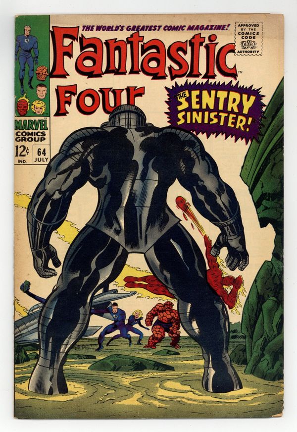 Cover pencils by Jack Kirby, inks by Joe Sinnott. First appearance of the Intergalactic Sentry #459 (a Kree machine) in The Sentry Sinister!, script by Stan Lee and Jack Kirby (co-plot), pencils by Jack Kirby, inks by Joe Sinnott; Explorers on a South Pacific island awaken the Kree Sentry 459; The FF come to the island for a vacation and become embroiled in a battle with the Sentry. Inhumans appearances. Reprinted in Marvel's Greatest Comics # 47. 36 pgs. $0.12. Cover price $0.12.