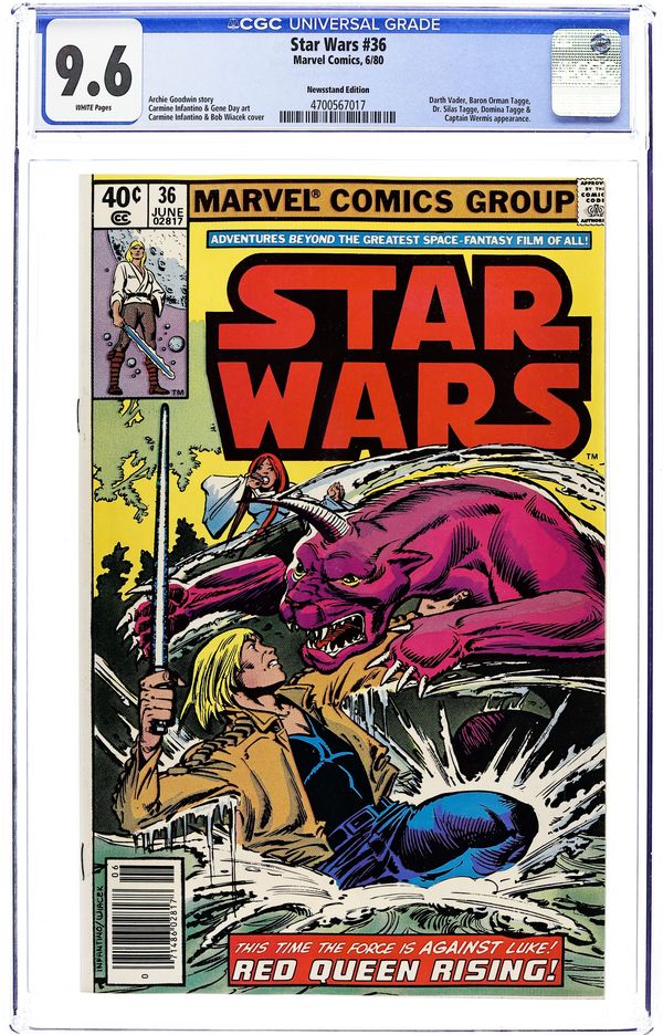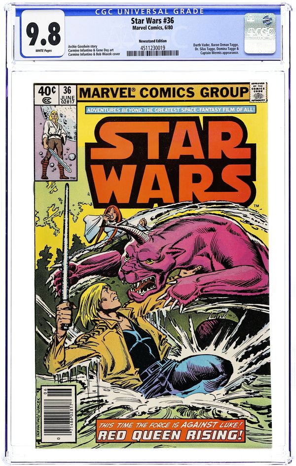 Newsstand Edition. "Red Queen Rising!" Written by Archie Goodwin. Art by Carmine Infantino and Bob Wiacek. The Dark Lord of the Sith, Darth Vader, increases his efforts to capture the hero who destroyed the Death Star and thus caused the Sith Lord his greatest defeat. Cover price $0.40.