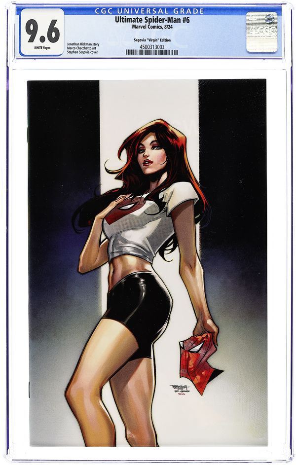 Comics Illuminati (Unknown Comic Books, Comic Traders, and Sleeping Giant) Exclusive Virgin Cover by Stephen Segovia. Written by Jonathan Hickman. Art by Marco Checchetto. THE SHOCKING CONCLUSION OF THE ULTIMATE OPENING ARC! • Spider-Man must finally confront the head honcho himself: Wilson Fisk, the Kingpin! • Kingpin, as owner and operator of the Daily Bugle, has been working with the Makers Council to control the spread of information in their favor… • Which means he's the first domino that must be toppled to end their regime! • PLUS: Mary Jane holds her own. Nuff said! 32 pages, full color. Rated T Cover price $4.99.