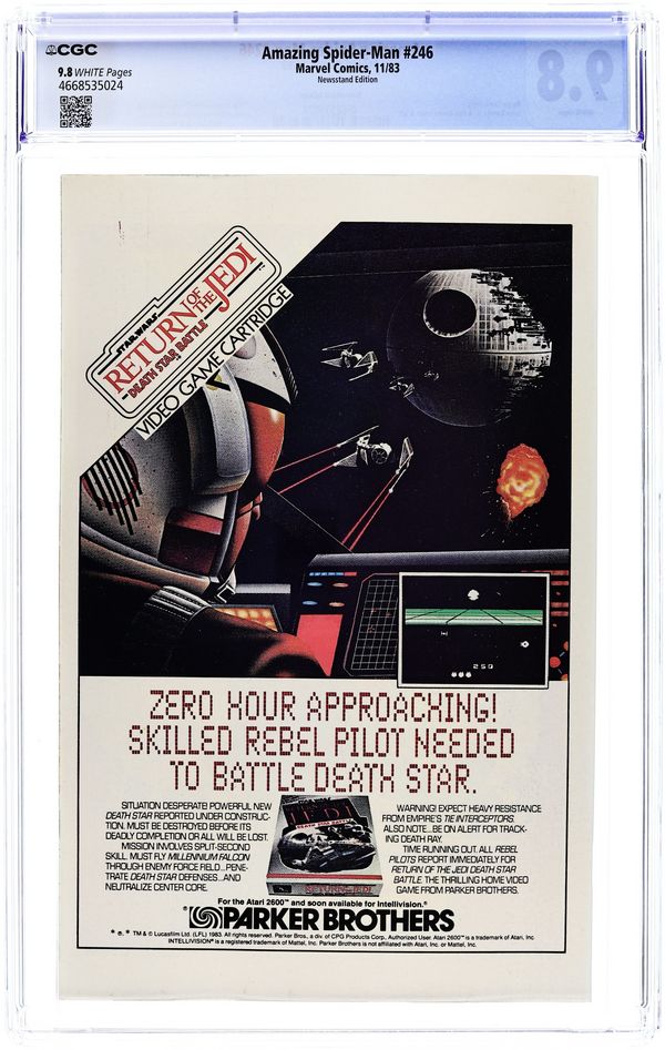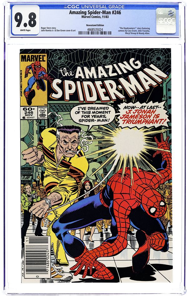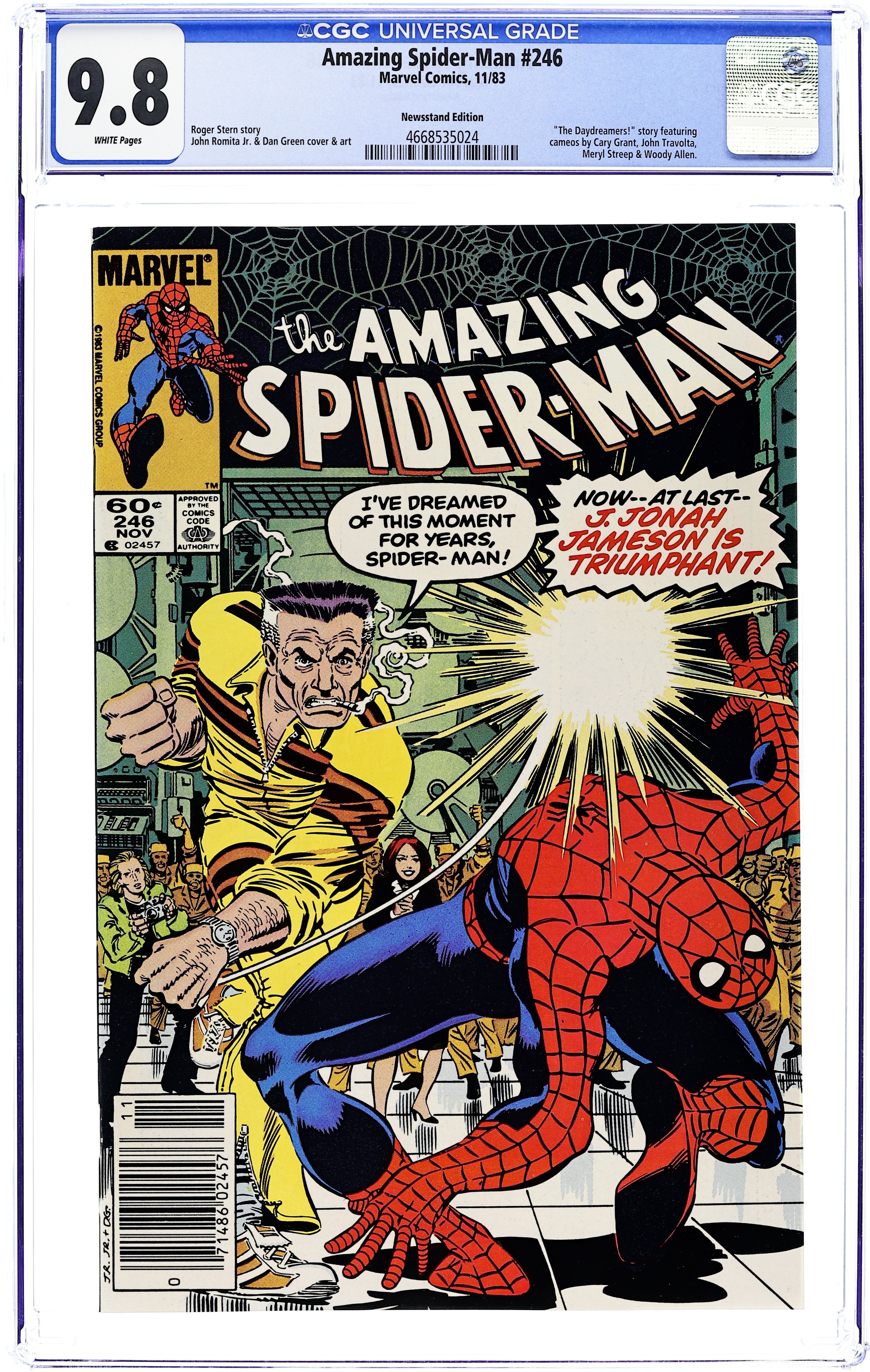 Newsstand Edition. "The Daydreamers!" Script by Roger Stern. Pencils by John Romita Jr. Inks by Dan Green. Cover by John Romita Jr. and Dan Green. The Watcher narrates the daydreams of four wishful souls: Felicia Hardy, J. Jonah Jameson, Mary Jane Watson, and Peter Parker! The Black Cat imagines robbing from the rich and giving to the poor alongside her favorite web-slinger! Jonah fantasizes about punching out the wall-crawler! Mary Jane dreams of seeing her name in the marquee lights of Broadway! And the Amazing Spider-Man yearns for respect as a photographer, scientist, and superhero! A fun issue! Cameo appearances (as part of dream sequences) by the Fantastic Four, Captain America, Iron Man, Doctor Doom, Doctor Octopus, Loki, the Absorbing Man, Kraven the Hunter, Meryl Streep, John Travolta, Woody Allen, and Cary Grant. (Note: This same month Spider-Man guest stars in Avengers 236 & 237.) 36 pages. Cover price $0.60.